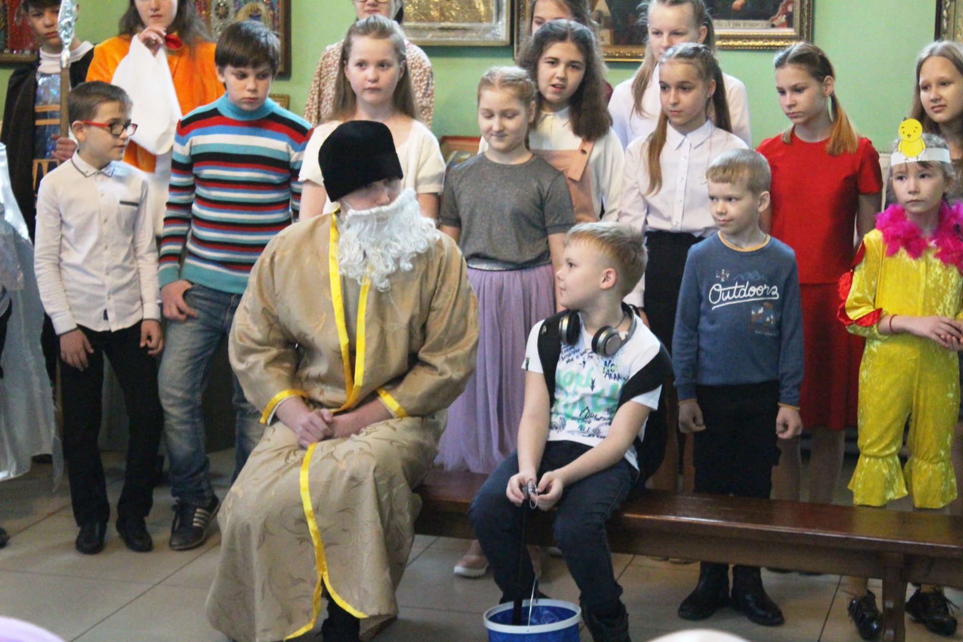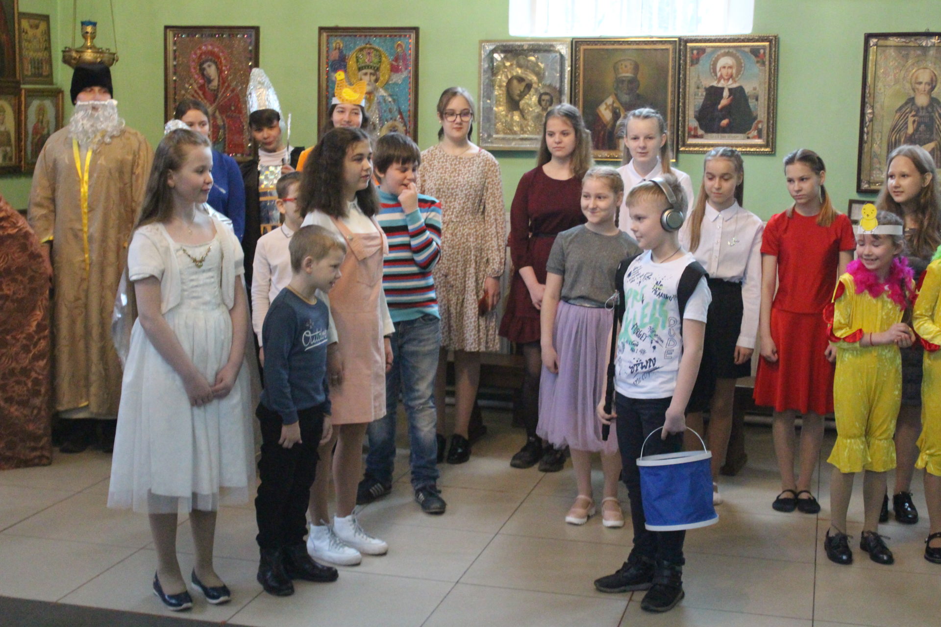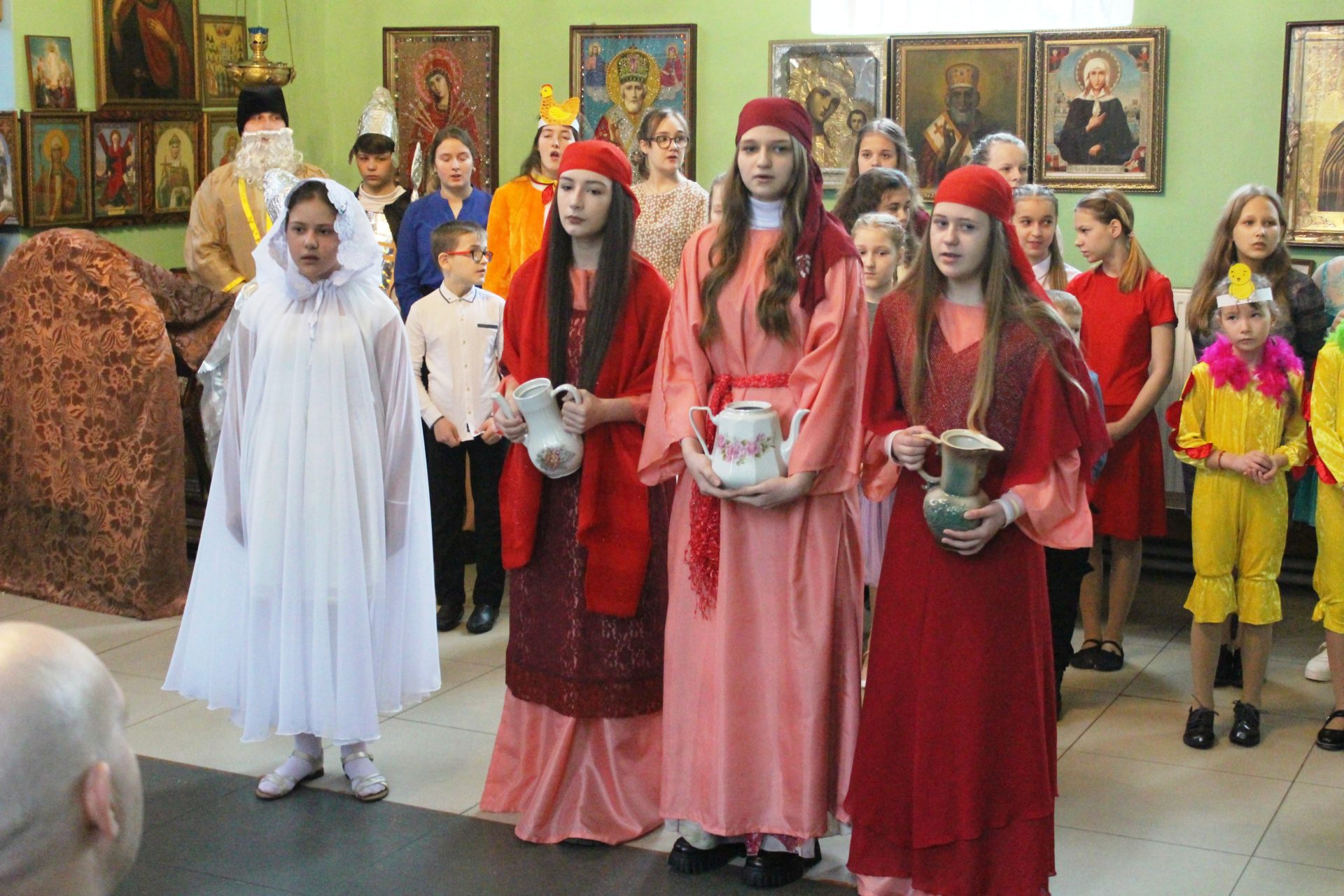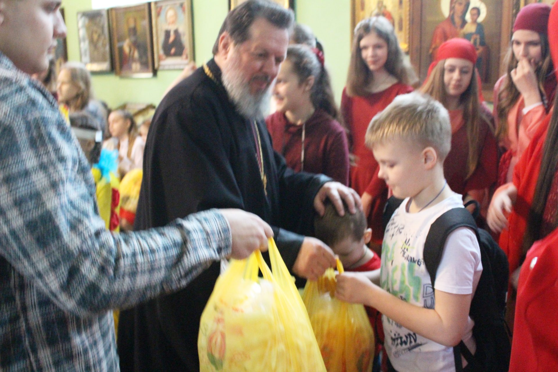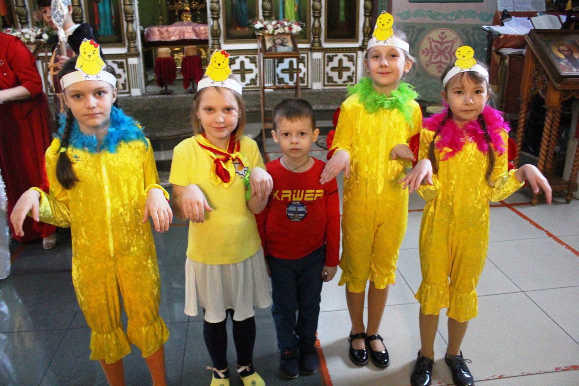 Жены-мироносицы повествовали о земной жизни Иисуса Христа и о Его Воскресении. Внимание зрителей привлекла пасхальная сценка о чуде пасхального яйца. Маленькие цыплятки никого не оставили равнодушными. Необыкновенно трогательный и самый что ни на есть пасхальный сюжет спектакля с проникновенной игрой всех актеров до глубины души поразил зрителей. Были и слёзы, и радость, и искреннее сопереживание во время спектакля. О событиях последних Крестных дней Христа. Ученики читали стихи так, что невозможно было не вспоминать это снова и снова с глубоким чувством. Дети, играющие на сцене, понимали всю важность и ответственность своей роли не только как актеров, но и как проповедников, несущих благую весть об Иисусе Христе. Не обошелся праздник и без стихов. Воспитанники читали стихотворения о Воскресении Спасителя, о радости людей, а также дети порадовали зрителей торжественными пасхальными песнопениями, веселыми детскими песнями о Пасхе! По традиции на празднике присутствовали дети и воспитатели ДРЦ «Чайка». По окончании всех выступлений настоятель храма протоиерей Василий Биляк поблагодарил за проведение праздника детей, преподавателей и родителей. Батюшка поздравил собравшихся воспитанников со Светлым Христовым Воскресением и пожелал сохранять как можно дольше Пасхальную радость и пронести ее до следующей Пасхи. Все присутствовавшие на празднике получили подарки.  По окончании праздника традиционно была сделана общая фотография.