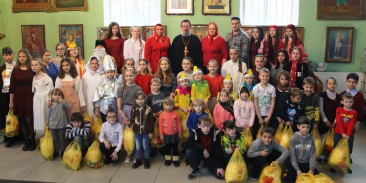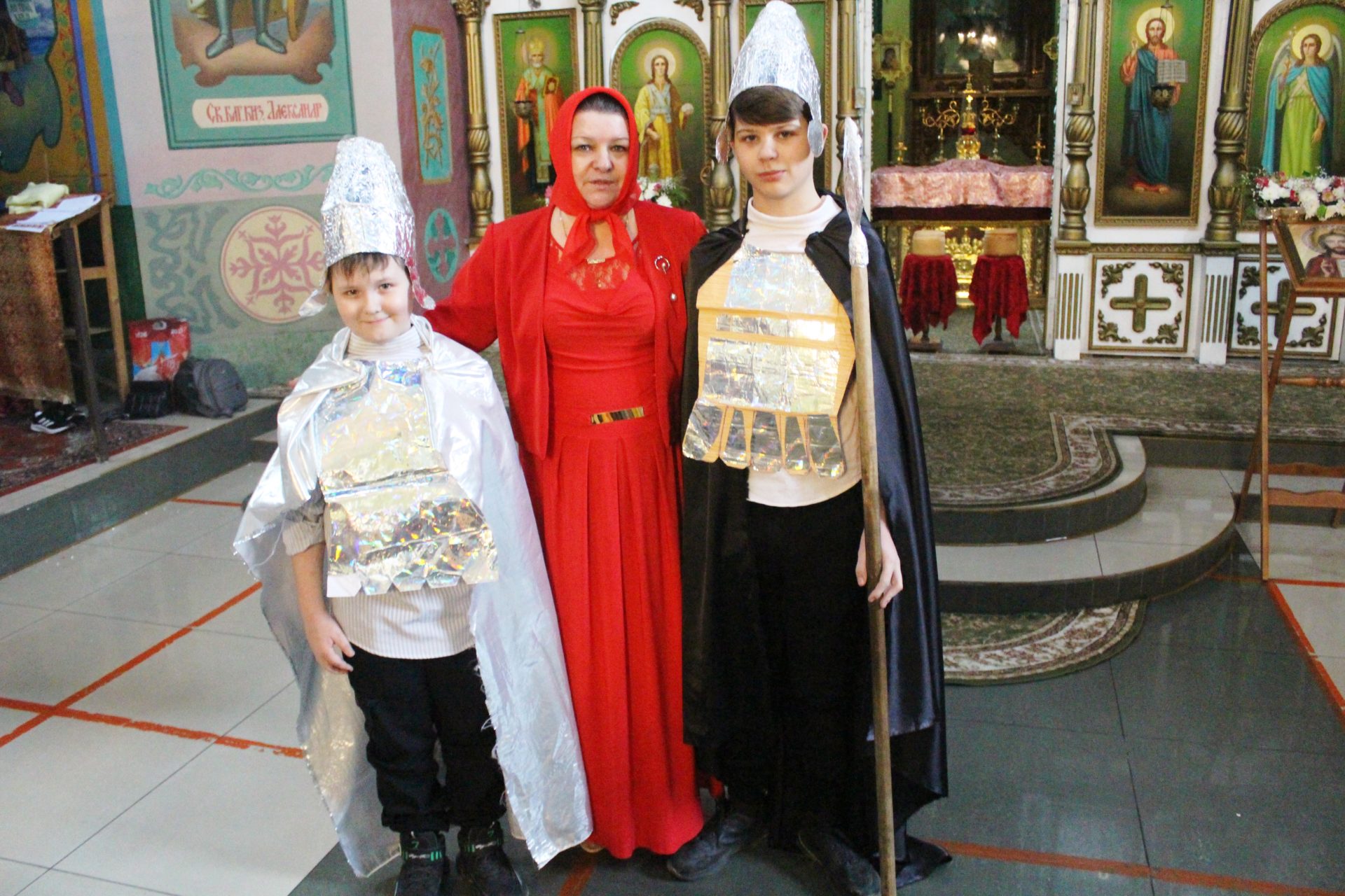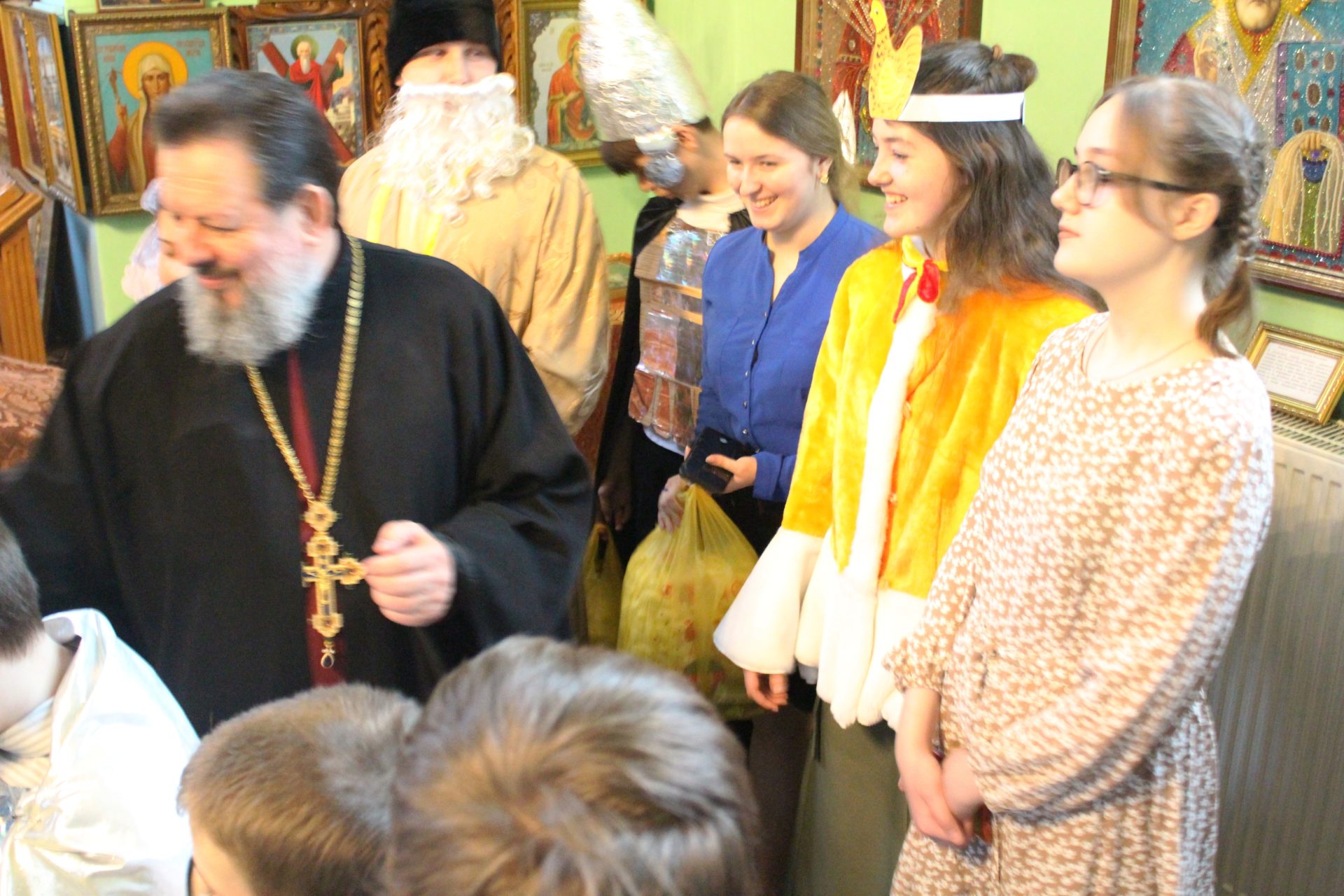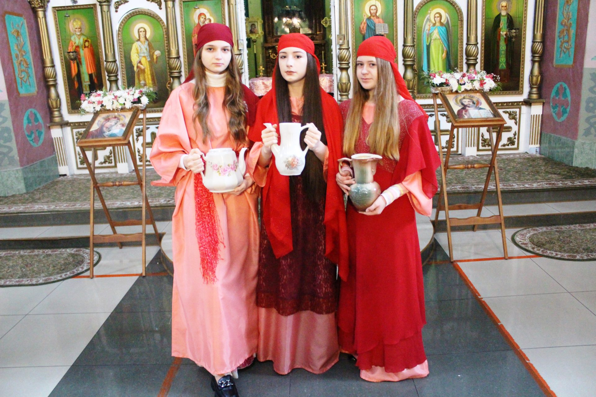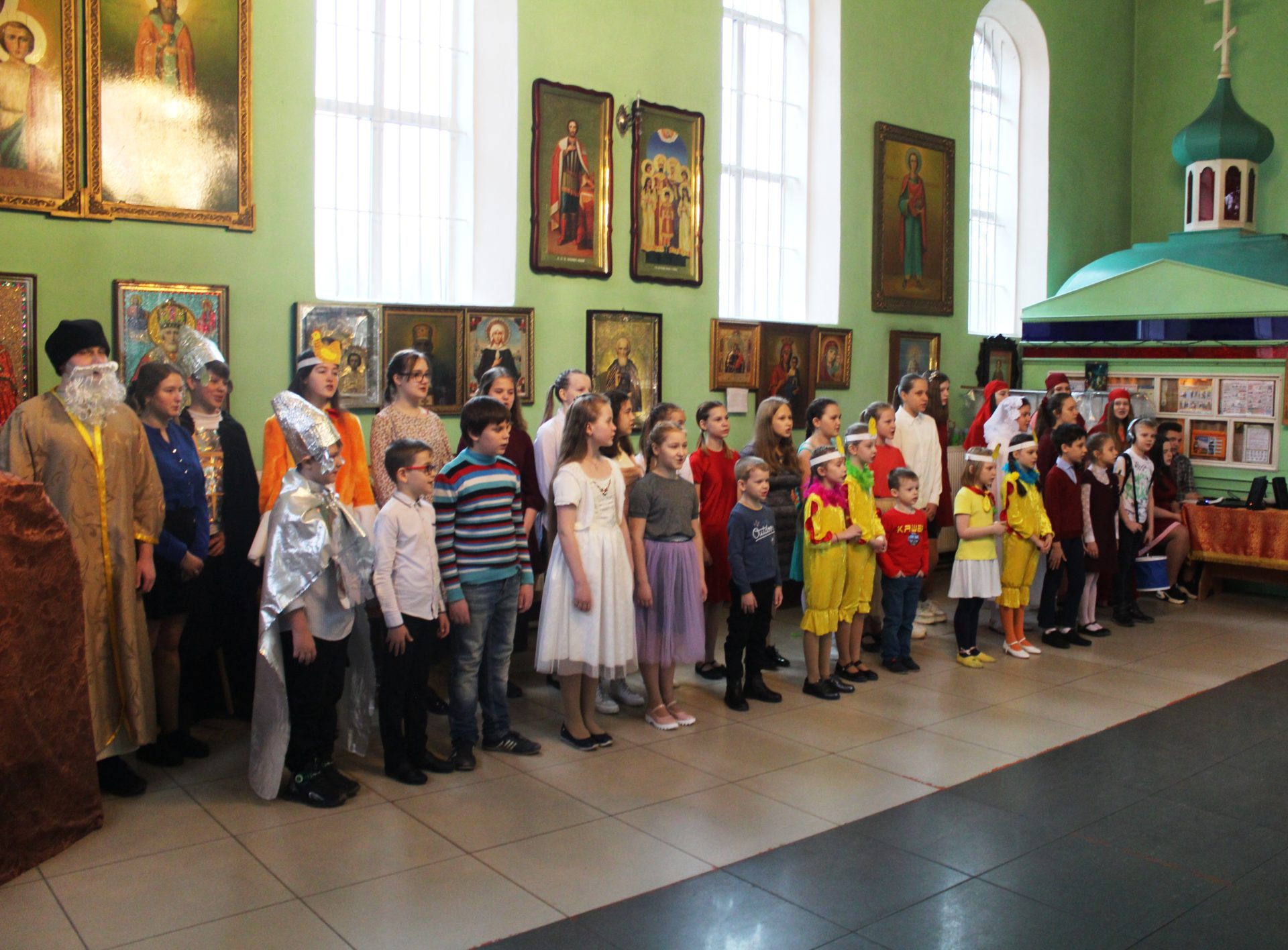 Жены-мироносицы повествовали о земной жизни Иисуса Христа и о Его Воскресении. Внимание зрителей привлекла пасхальная сценка о чуде пасхального яйца. Маленькие цыплятки никого не оставили равнодушными. Необыкновенно трогательный и самый что ни на есть пасхальный сюжет спектакля с проникновенной игрой всех актеров до глубины души поразил зрителей. Были и слёзы, и радость, и искреннее сопереживание во время спектакля. О событиях последних Крестных дней Христа. Ученики читали стихи так, что невозможно было не вспоминать это снова и снова с глубоким чувством. Дети, играющие на сцене, понимали всю важность и ответственность своей роли не только как актеров, но и как проповедников, несущих благую весть об Иисусе Христе. Не обошелся праздник и без стихов. Воспитанники читали стихотворения о Воскресении Спасителя, о радости людей, а также дети порадовали зрителей торжественными пасхальными песнопениями, веселыми детскими песнями о Пасхе! По традиции на празднике присутствовали дети и воспитатели ДРЦ «Чайка». По окончании всех выступлений настоятель храма протоиерей Василий Биляк поблагодарил за проведение праздника детей, преподавателей и родителей. Батюшка поздравил собравшихся воспитанников со Светлым Христовым Воскресением и пожелал сохранять как можно дольше Пасхальную радость и пронести ее до следующей Пасхи. Все присутствовавшие на празднике получили подарки.  По окончании праздника традиционно была сделана общая фотография.
