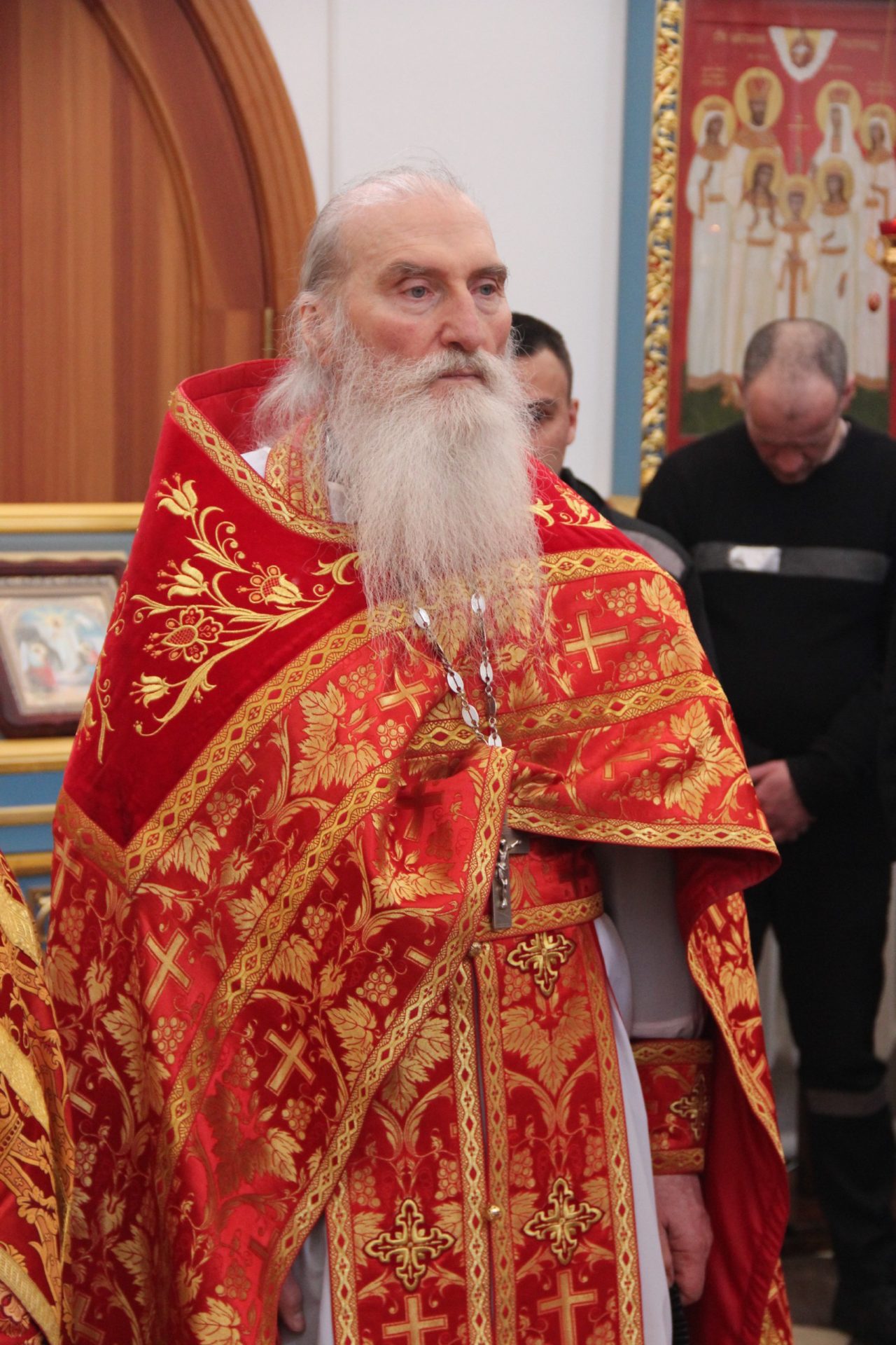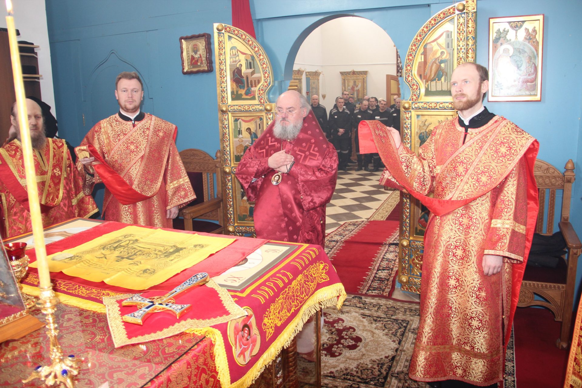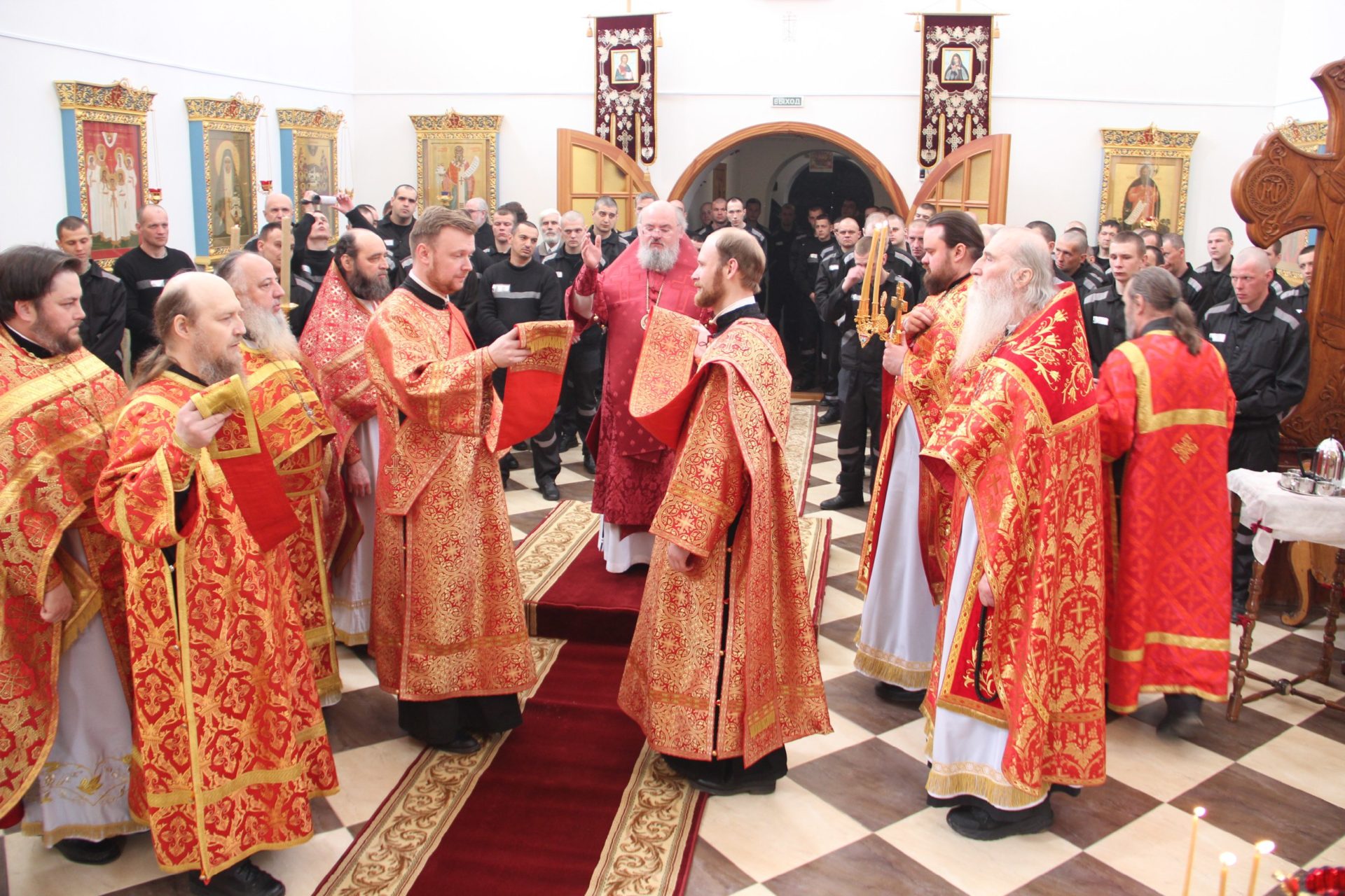 Архипастырю сослужили протоиерей Дмитрий Сахаров, протоиерей Сергий Сычев, протоиерей Антоний Хатунцев – священнослужители Козельской епархии, иерей Вадим Ваньков и насельники Свято-Введенской Оптиной пустыни, окормляющие заключенных колонии. Диаконский чин возглавил диакон Евгений Ковригин.