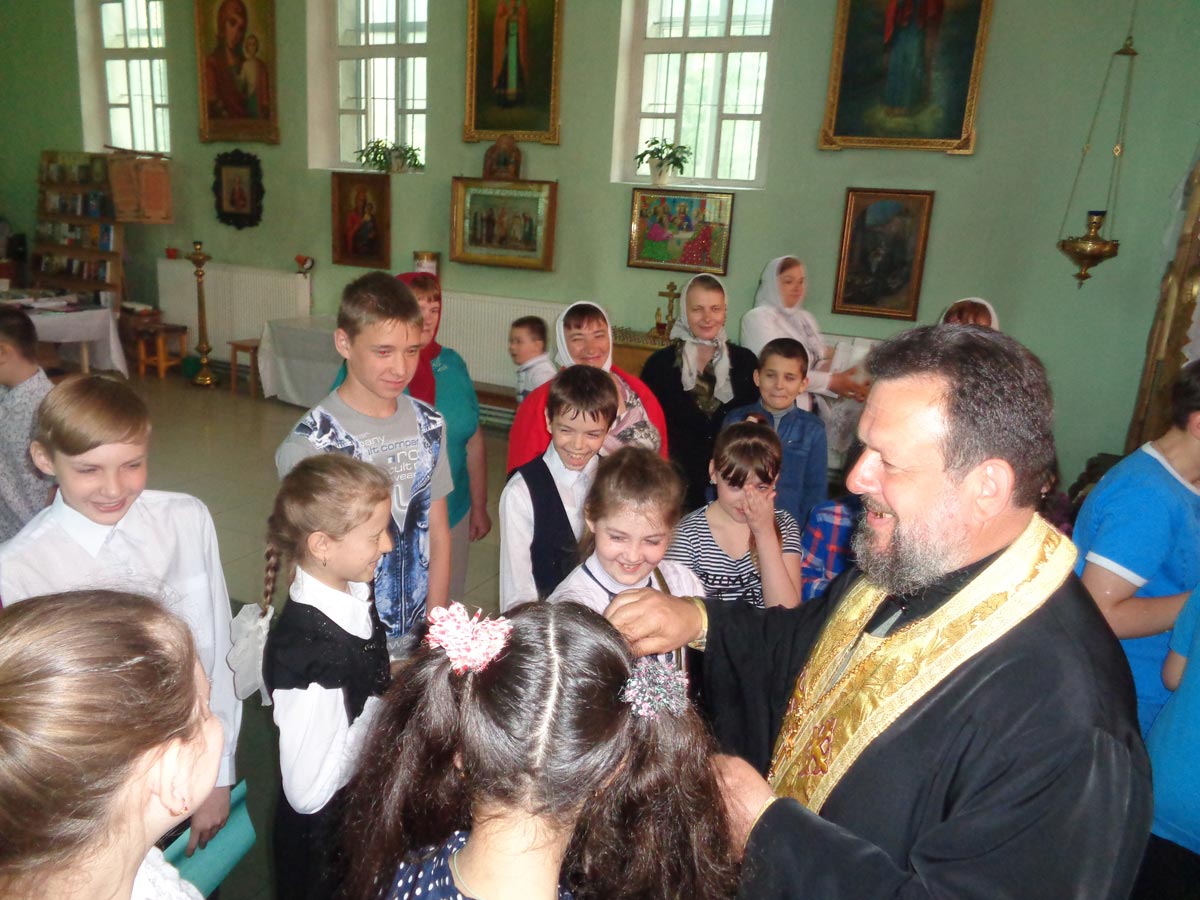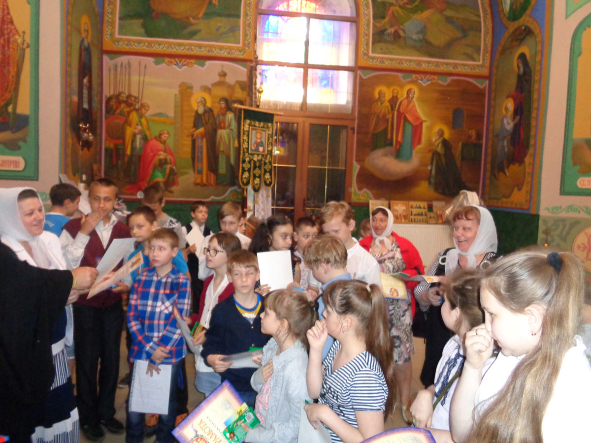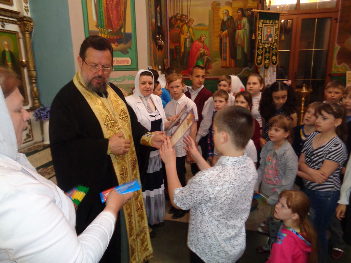 После конкурса настоятель храма протоиерей Василий Биляк отслужил благодарственный молебен за успешно прошедший учебный год в воскресной школе и поздравил всех детей и родителей с его завершением, он пожелал всем здоровья, хороших каникул, не забывать в летнее время о молитве и о посещении храма.