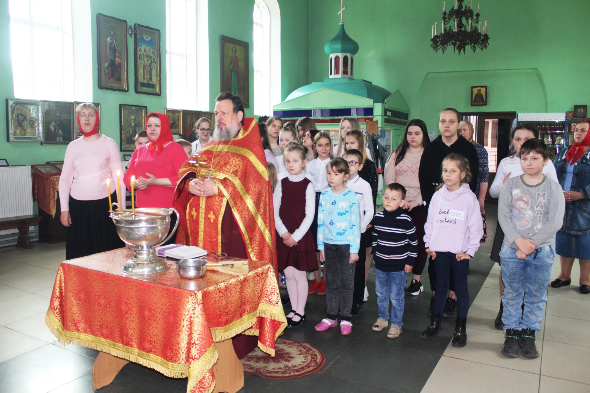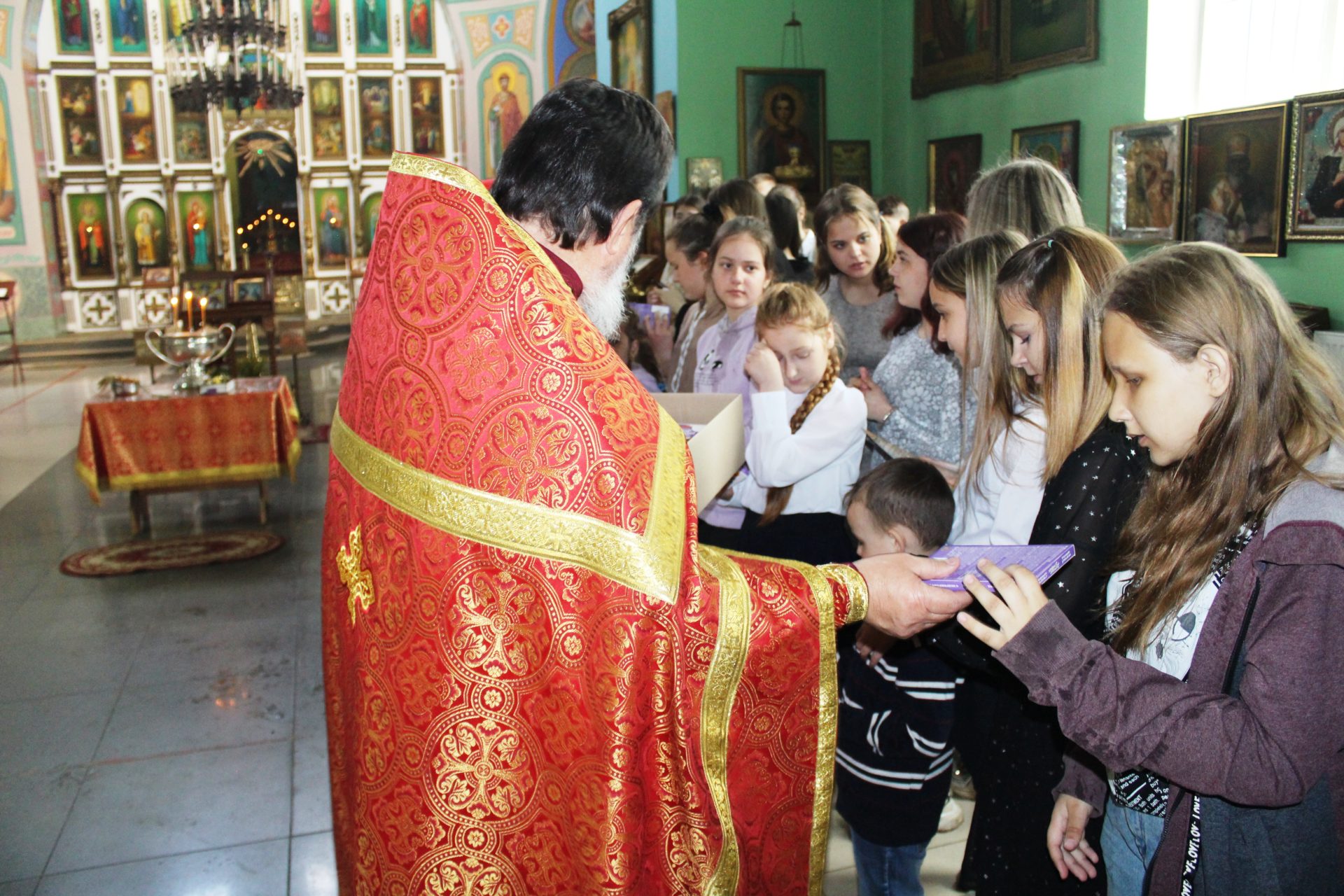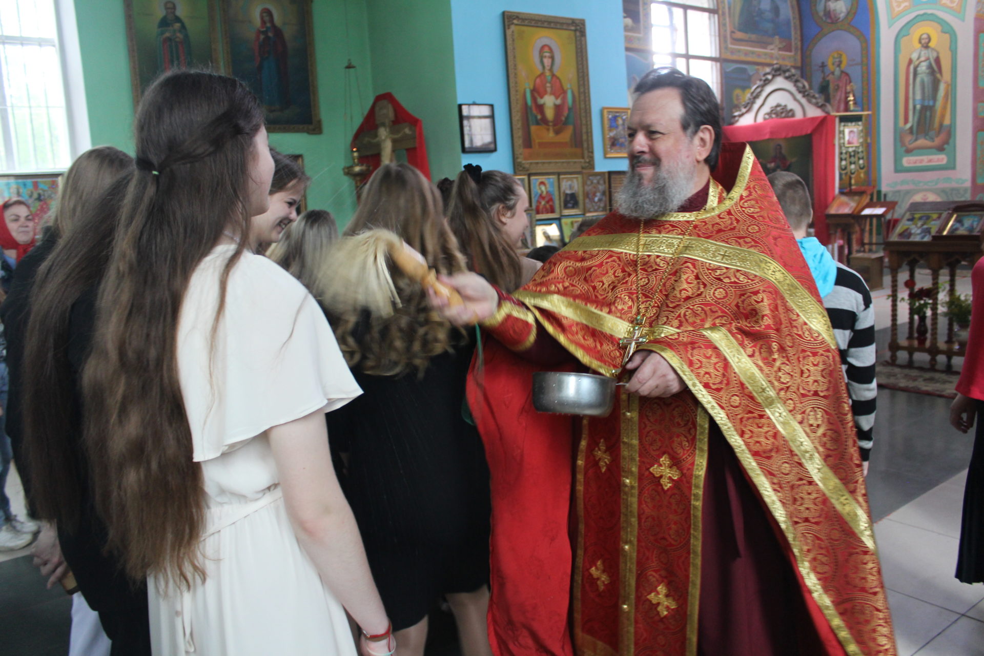 Отец Василий отслужил благодарственный молебен за успешно прошедший год обучения, по завершении которого батюшка окропил всех детей и родителей святой водой. В конце праздника отец Василий поздравил выпускников с окончанием Воскресной школы, переходом ребят на следующую ступеньку их жизни. Батюшка вручил выпускникам свидетельство об окончании Воскресной школы и пожелал, чтобы они, выйдя из ее стен, никогда не забывали то, чему их учили, пожелал помощи Божией в грядущей взрослой жизни.