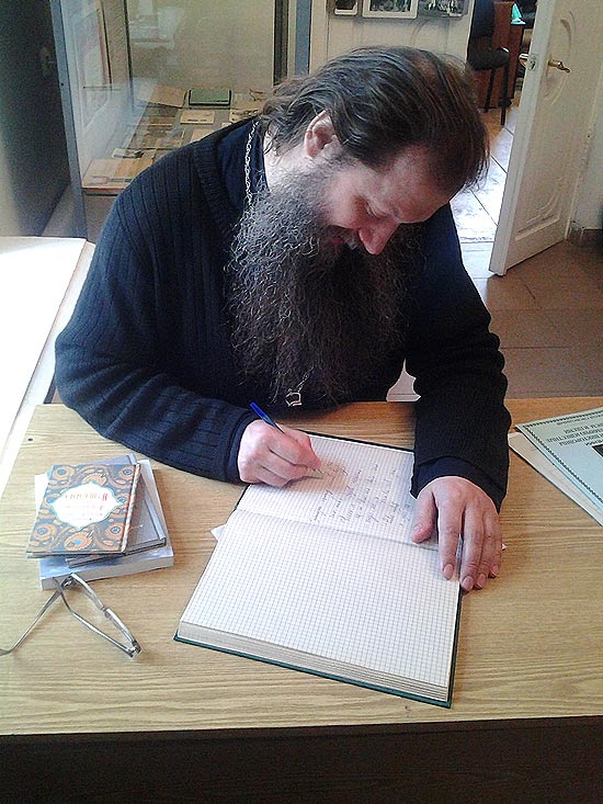 О. Артемий как поэт подарил Козельскому обществу русских литераторов свой поэтический сборник «Мосты через реку». В свою очередь Сергей Евгеньевич преподнёс ему последний выпуск альманаха «Злой Град». Директор музея Н.А.Семёнова познакомила гостей с наиболее интересными экспонатами: Козельским Крестом, диарамой, экспозициями посвящёнными Оптиной и Великой Отечественной войне. Покидая музей, о. Артемий оставил в книге отзывов стихотворную запись: