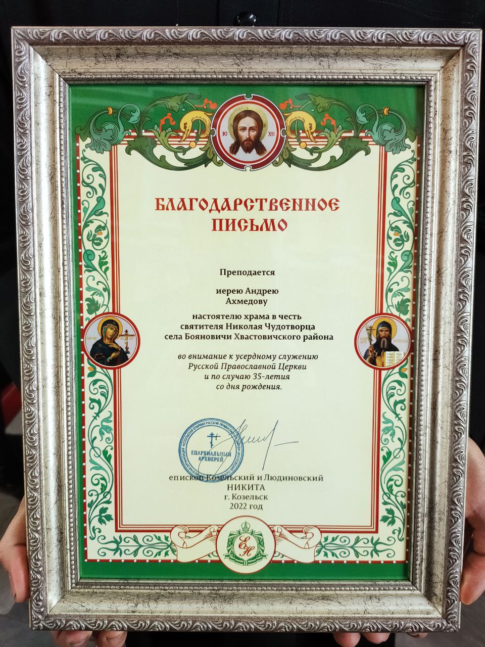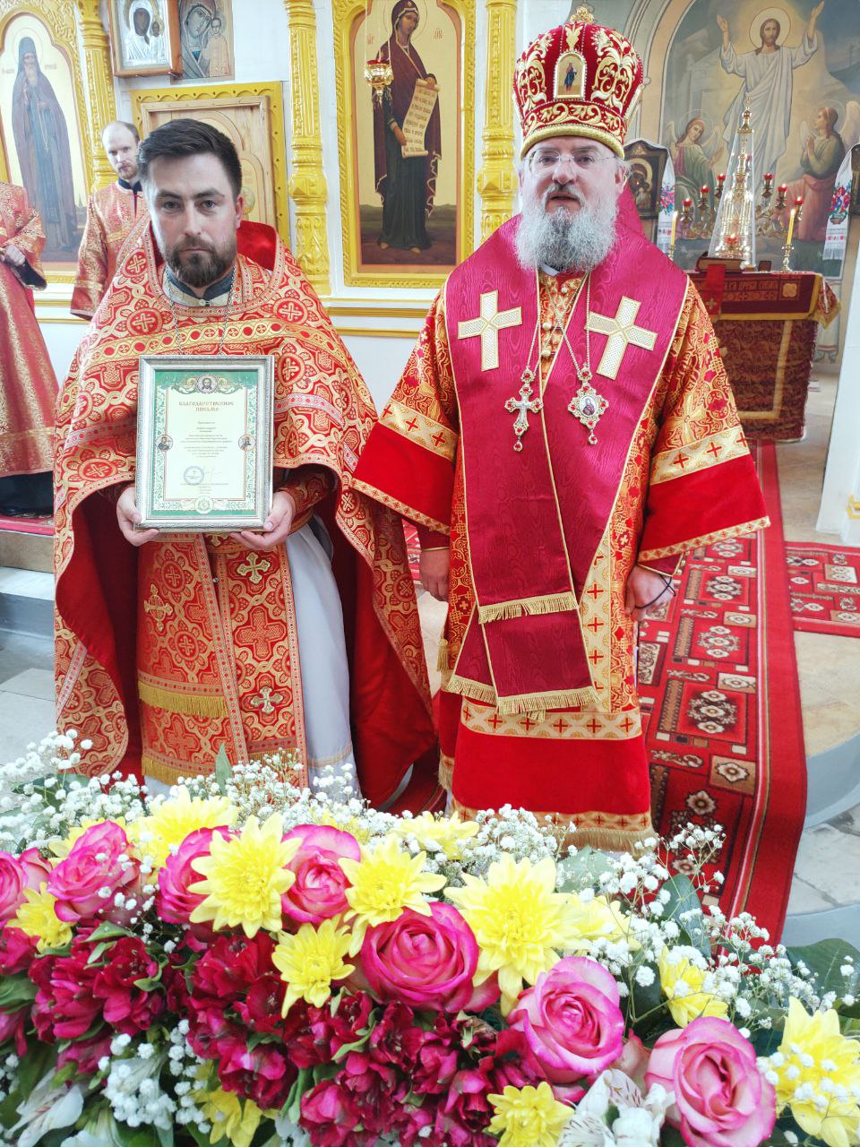 Во вниманию к усердным трудам во славу Святой Церкви и в связи с тридцатипятилетием со дня рождения епископ Никита вручил благодарственное Архиерейское письмо настоятелю прихода иерею Андрею Ахмедову.