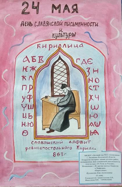 С 20 по 24 мая 2022 года по благословению епископа Козельского и Людиновского Никиты Воскресная школа «Светоч» Казанского собора города Людиново организовала интернет — акцию детских творческих работ, посвященную Дню славянской письменности и культуры «От Руси до России!» Цель акции: привлечение внимания к празднику, посвященному Дню славянской письменности и культуры, когда в России почитают святых равноапостольных Кирилла и Мефодия. Для участия в акции были приглашены воспитанники детских садов с родителями и ученики воскресной школы «Светоч» Казанского собора города Людиново. Участникам было предложено выполнить творческие работы и сфотографировать их, а затем переслать на почту собора. Для выполнения творческих работ участникам акции были предложены следующие темы: «БУКВИЦА», «ИЗ ЖИТИЯ СВЯТЫХ КИРИЛЛА И МЕФОДИЯ», «ХРАМЫ РОССИИ». Все постарались на славу. Каждому участнику этого доброго дела в своем учреждении будут вручены благодарственные письма за участие.