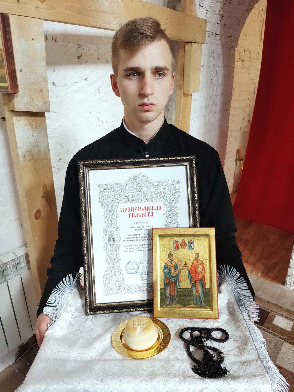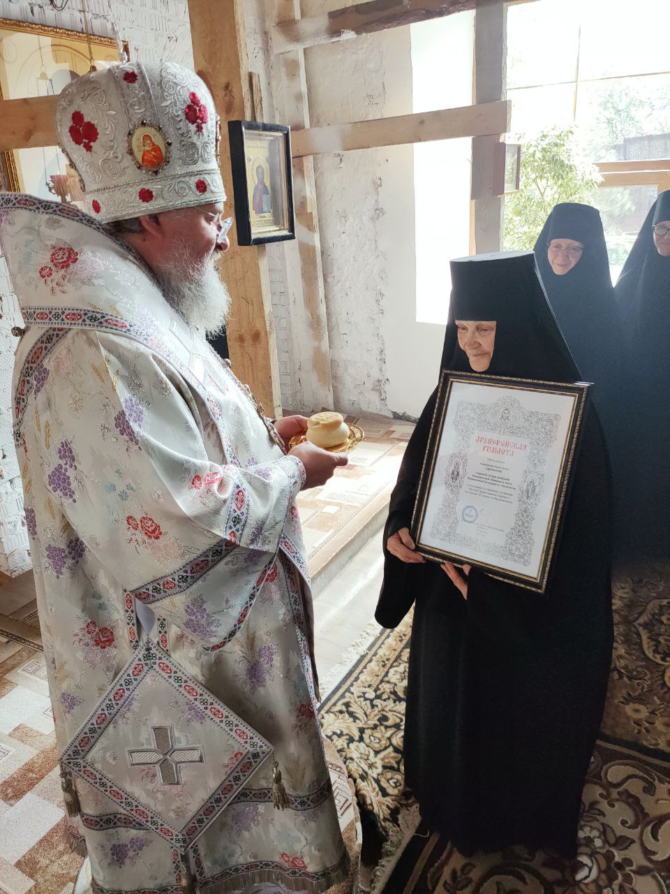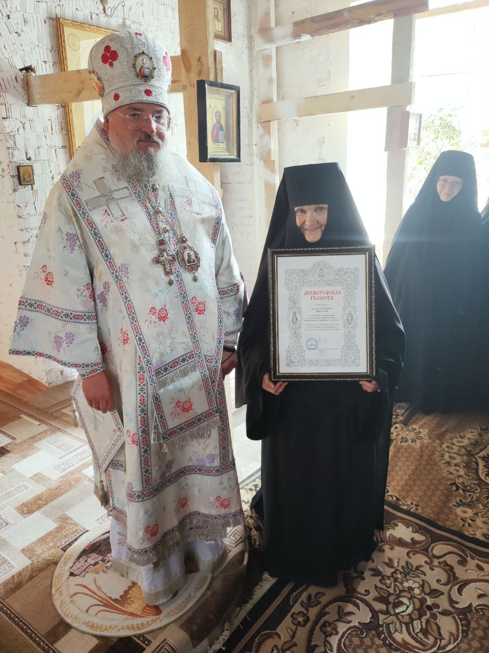 Во внимание к усердным трудам во славу Святой Церкви и в связи с 70летием со дня рождения владыка вручил монахине Анастасии (Дреминой) благодарственную Архиерейскую грамоту, святую просфору и икону святителей Николая Мирликийского и Спиридона Тримифунтского.