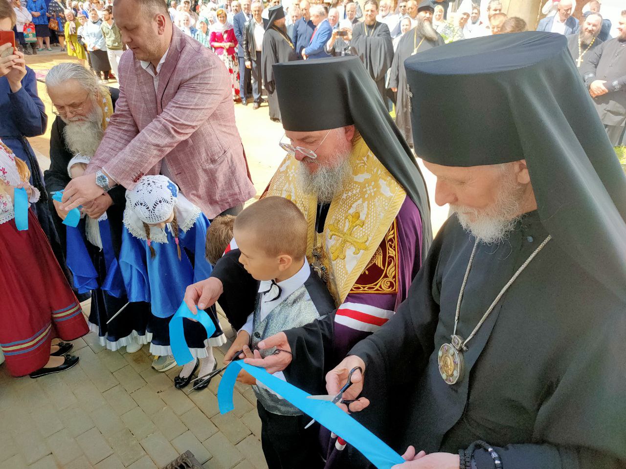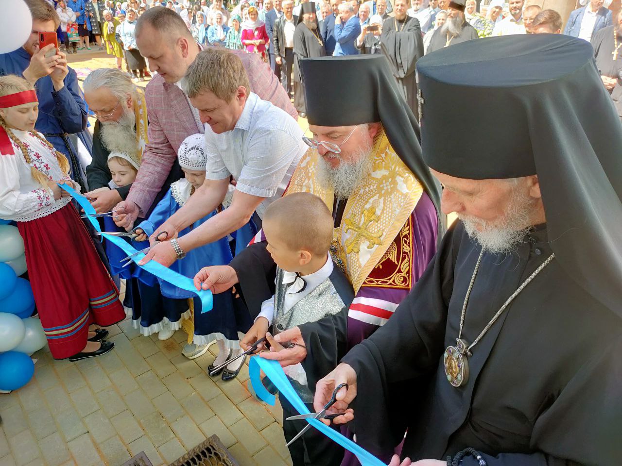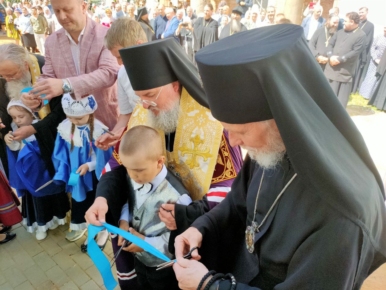 По доброй традиции перерезать ленточку предоставили присутствующим архиереям владыке Максимилану и владыке Никите, а также настоятелю собора протоиерею Алексию Жиганову, благотворителям храма и помощникам в строительстве центра Потапову Олегу Анатольевичу, Хопченко Алексею Евгеньевичу и деткам из Воскресной школы «Светоч».