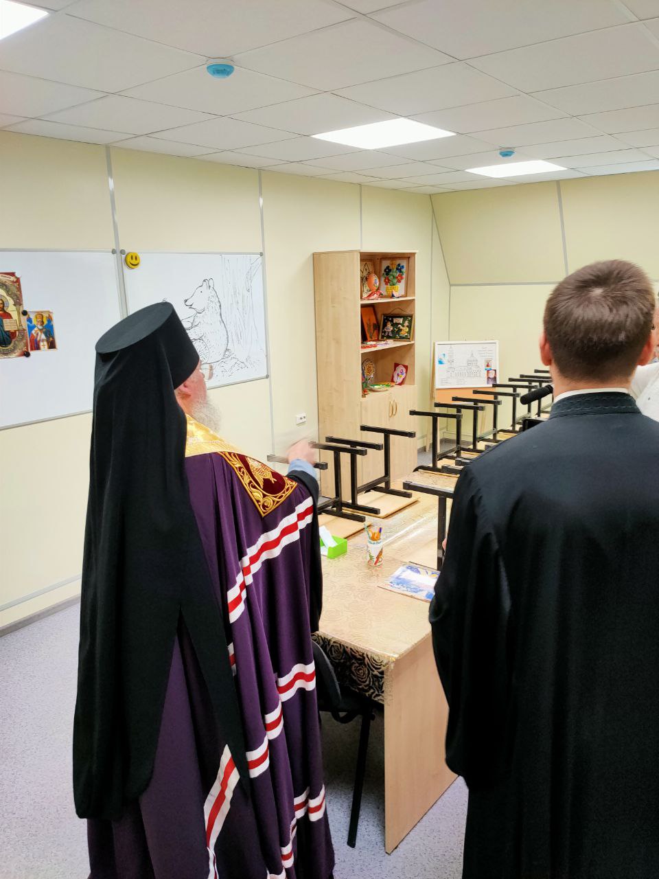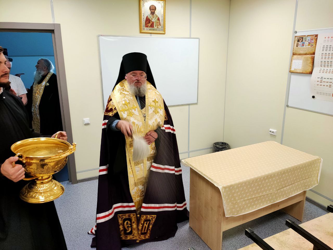 Перед началом освящения слово предоставили правящему архиерею Козельской епархии владыке Никите. Его Преосвященство поздравил всех присутствующих со знаменательным событием, которое с нетерпением ждали все. Пожелал, чтобы за лето все было подготовлено к началу занятий, и дети, да и взрослые смогли с сентября обучаться в таком прекрасном здании.