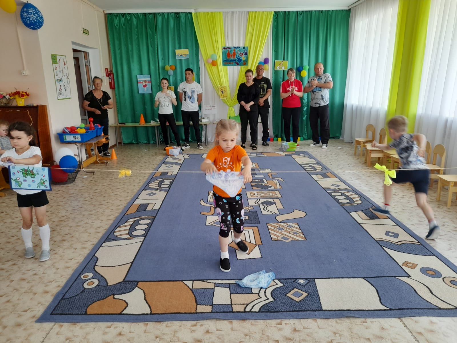 Инструктор по физической культуре детсада Арбузова Т А. подготовила и провела соревнования «папа, мама, я — спортивная семья». В соревнованиях приняли участие три семьи: Кашавкиных, Балабаевых и Ермаковых- Никитиных. К состязаниям подготовились папы, мамы и по одному ребёнку в команде. Младшие группы радостно приветствовали выступающих. По результатам более 10 конкурсов и состязаний определились победители, которым были вручены дипломы и сладкие призы.
