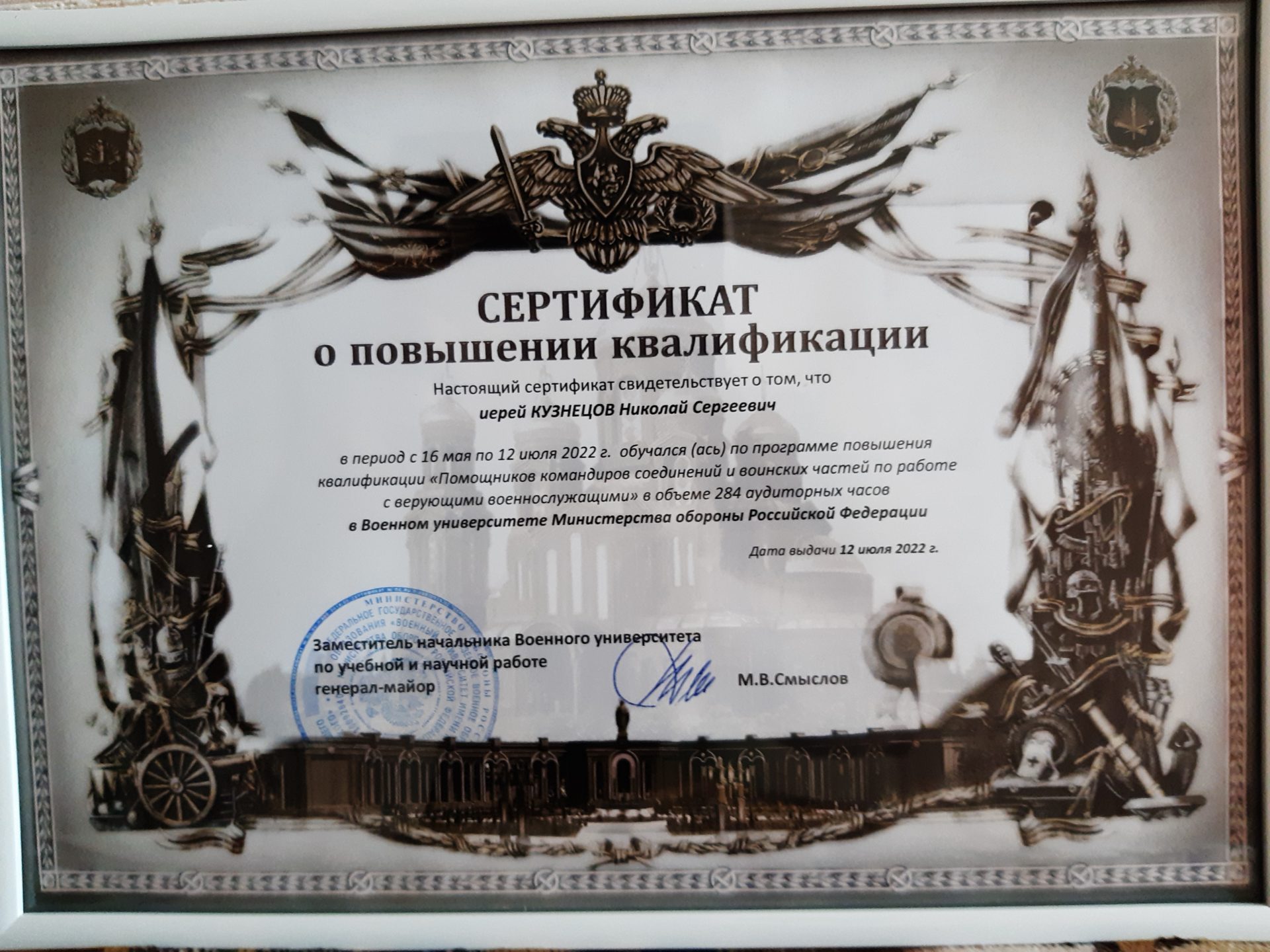 Руководитель епархиального отдела по взаимодействию с Вооруженными Силами и правоохранительными органами Козельской епархии завершил обучение на курсах повышения квалификации помощников командиров воинских частей