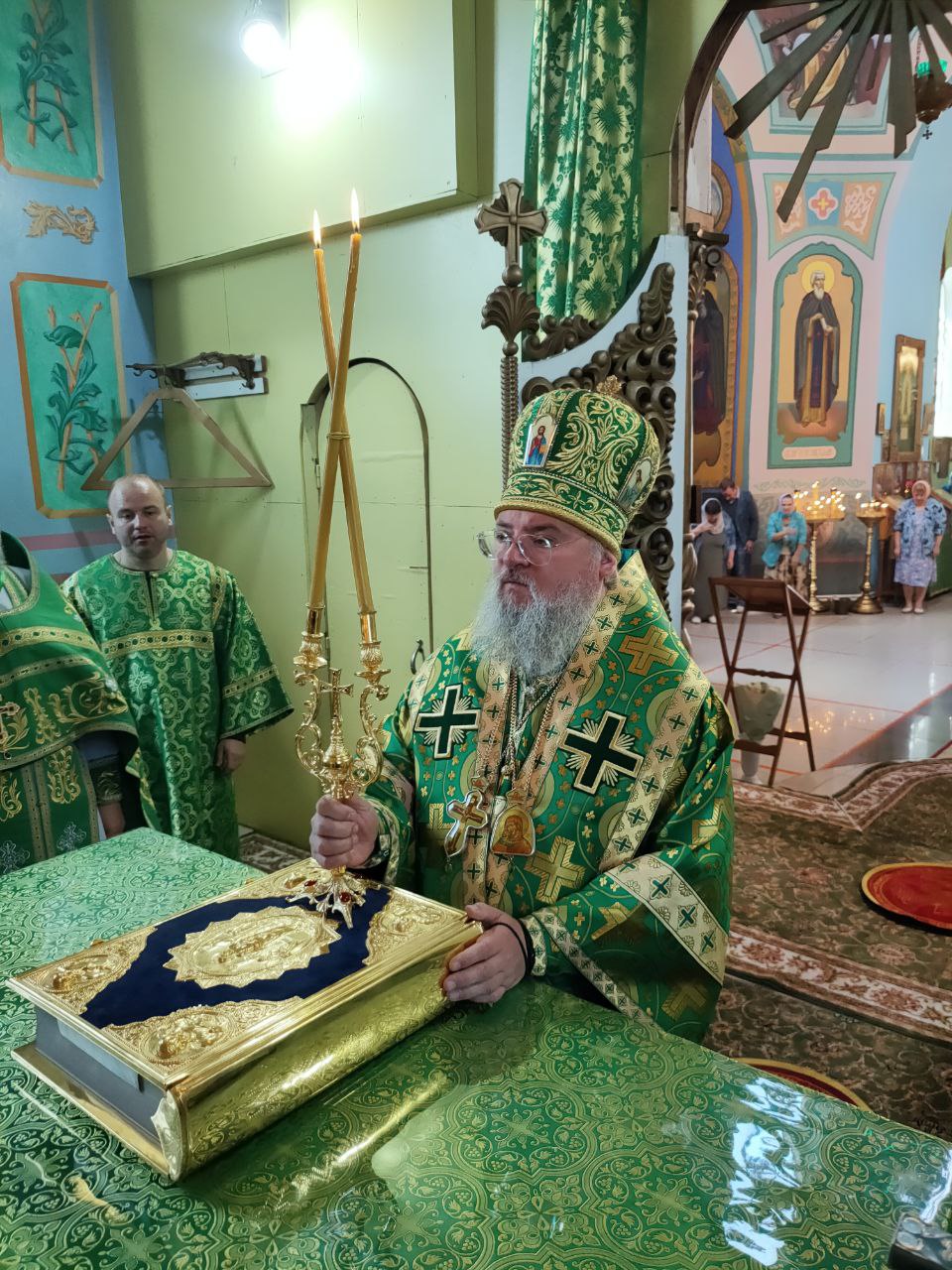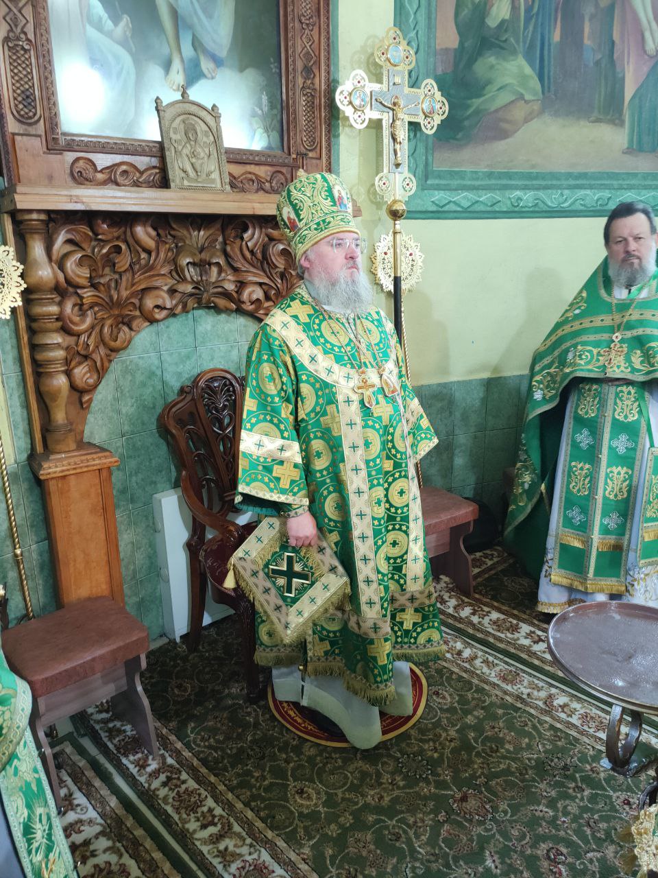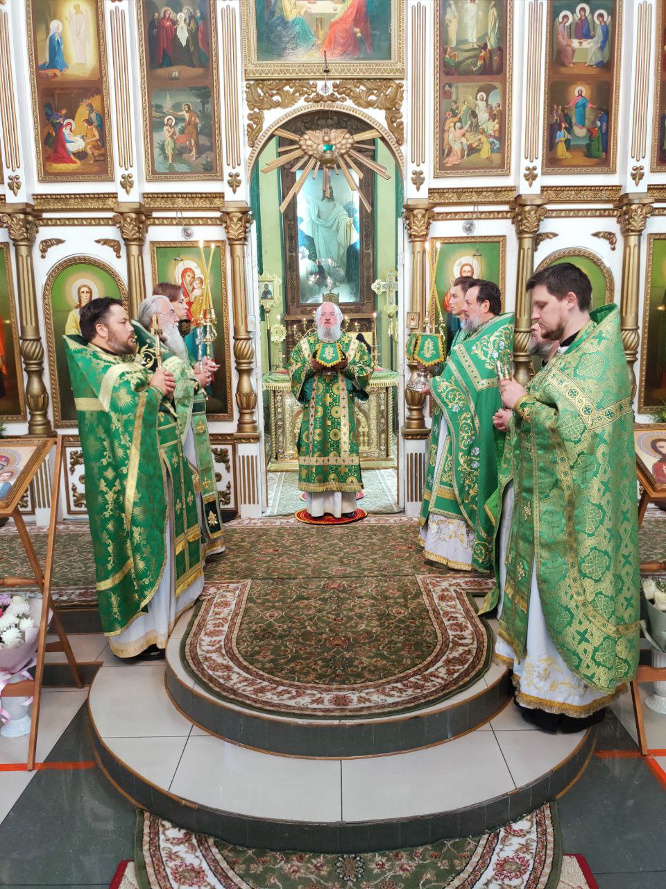 Преосвященному владыке сослужили: настоятель храма протоиерей Василий Биляк, протоиерей Алексий Жиганов – духовник епархии, благочинный округа, протоиерей Михаил Карпенко, протоиерей Антоний Хатунцев, иерей Иоанн Майоров, диакон Евгений Ковригин и диакон Андрей Соколов.