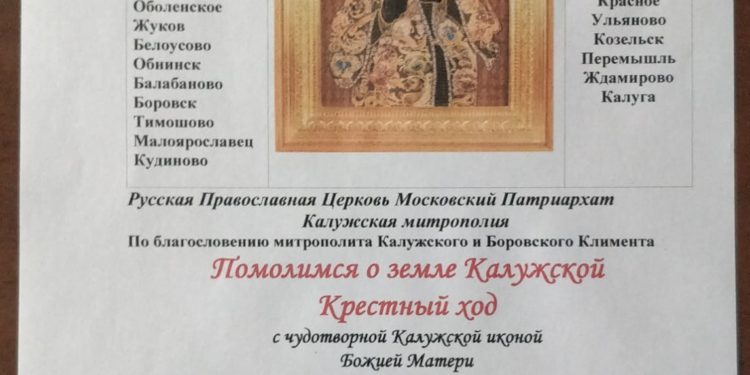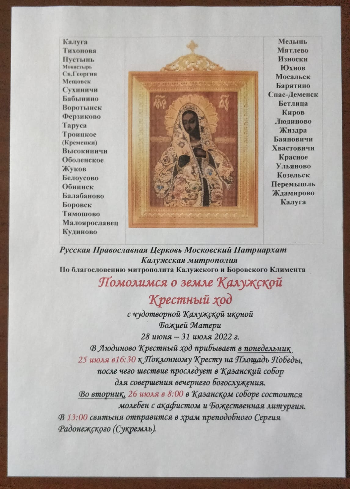 По благословению митрополита Калужского и Боровского Климента в Калужской митрополии с 28 июня по 31 июля 2022 года совершается ежегодный Крестный ход «Помолимся о земле Калужской» с чудотворной Калужской иконой Божией Матери, а также иконой новомучеников и исповедников Церкви Русской пострадавших на Калужской земле.
