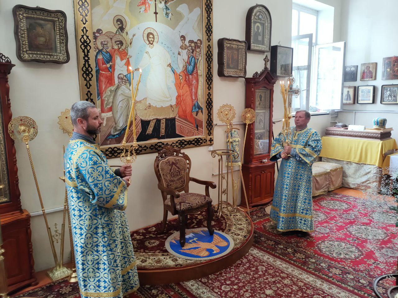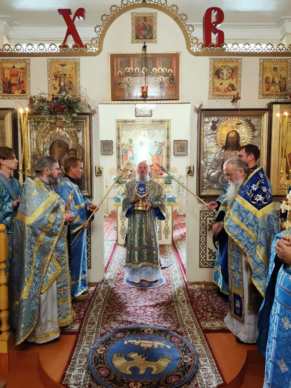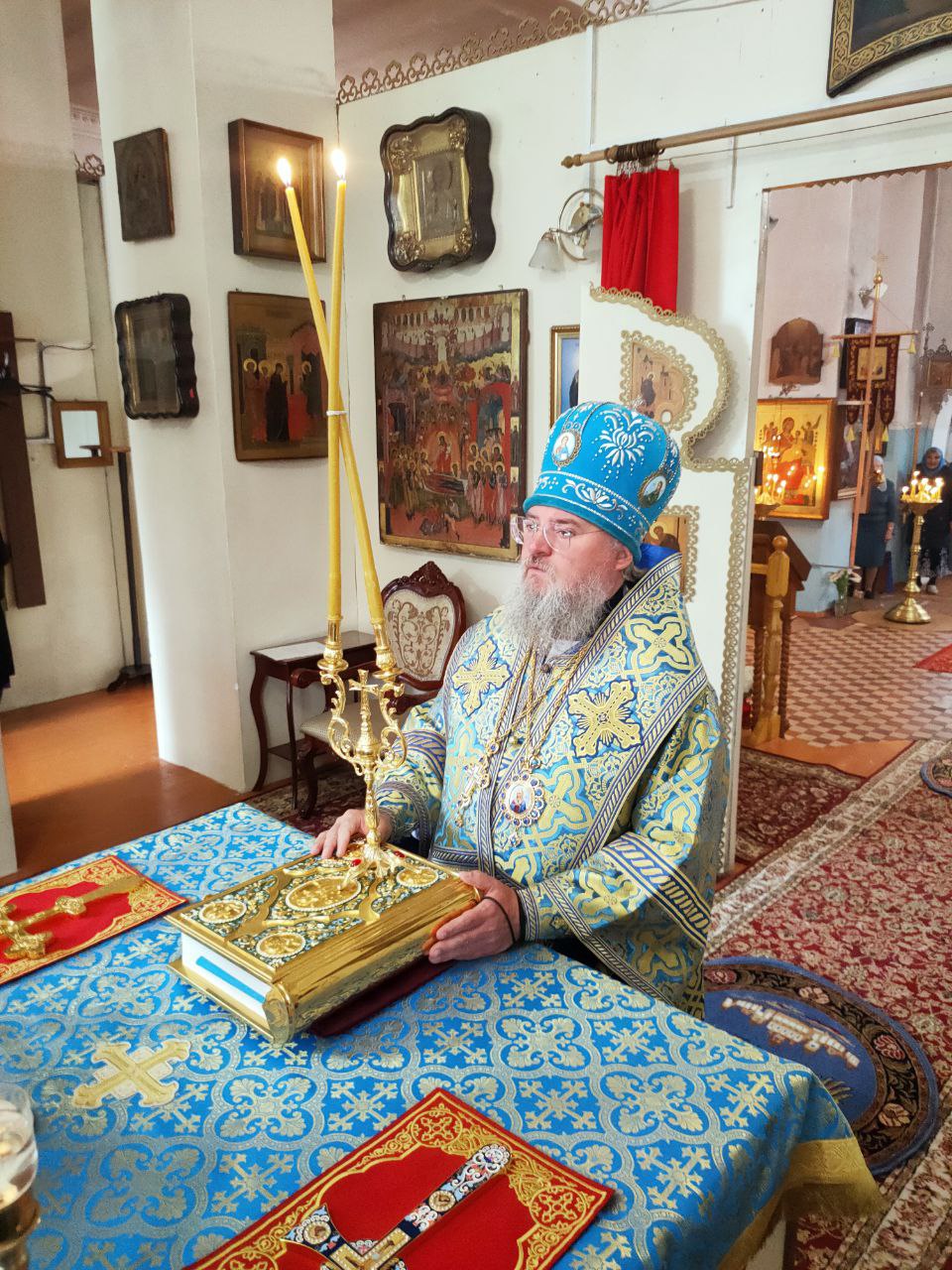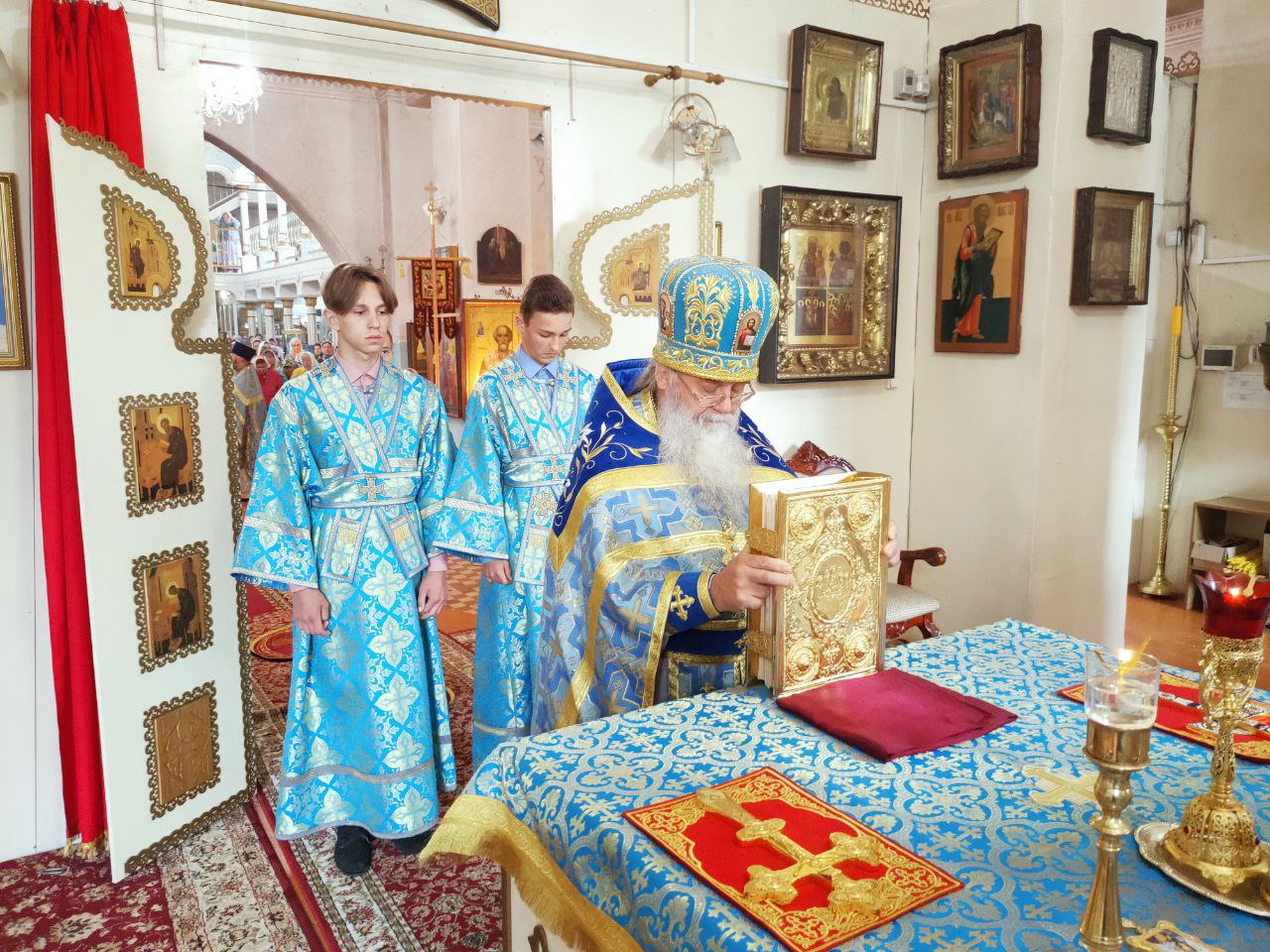 Преосвященному владыке сослужили: благочинный округа, настоятель собора, духовник епархии митрофорный протоиерей Алексий Жиганов, протоиерей Михаил Карпенко, протоиерей Антоний Хатунцев, диакон Евгений Ковригин и диакон Андрей Соколов.