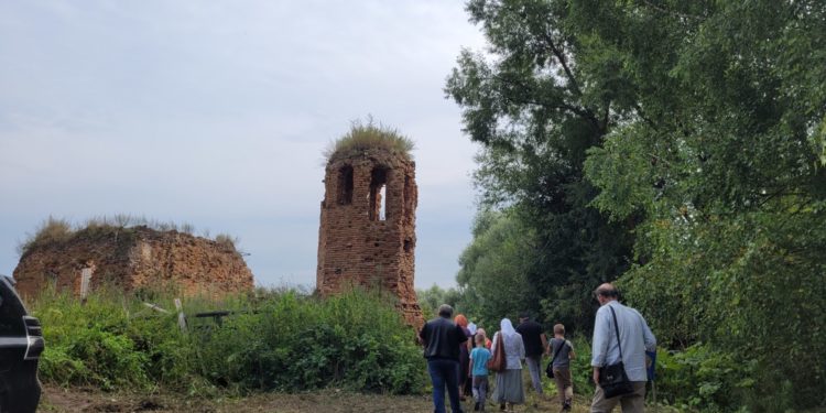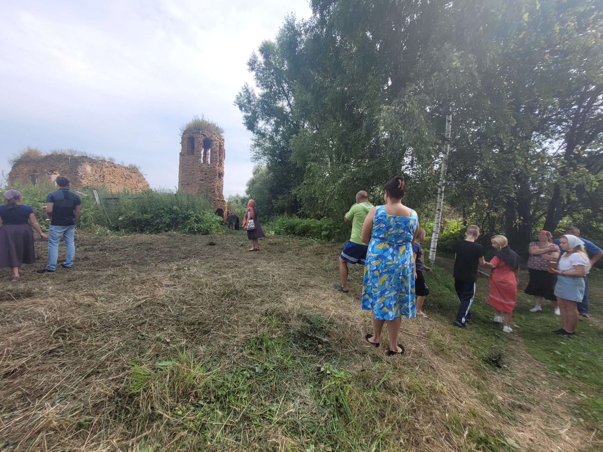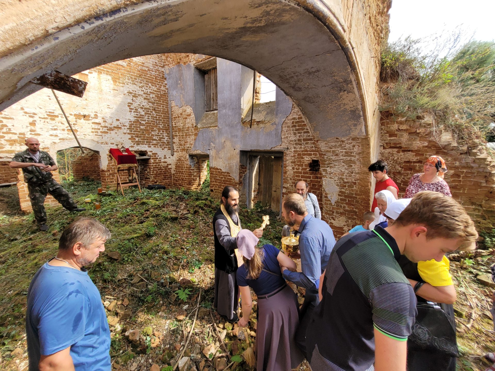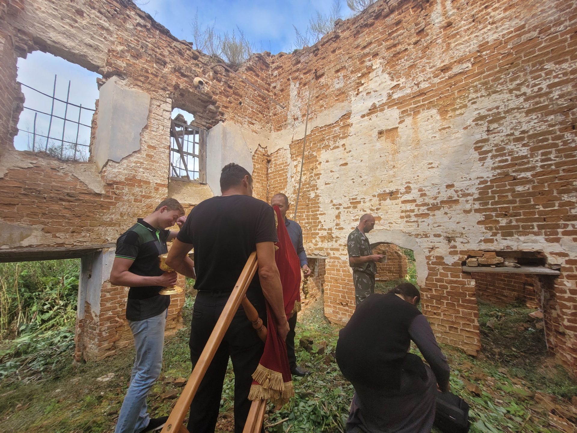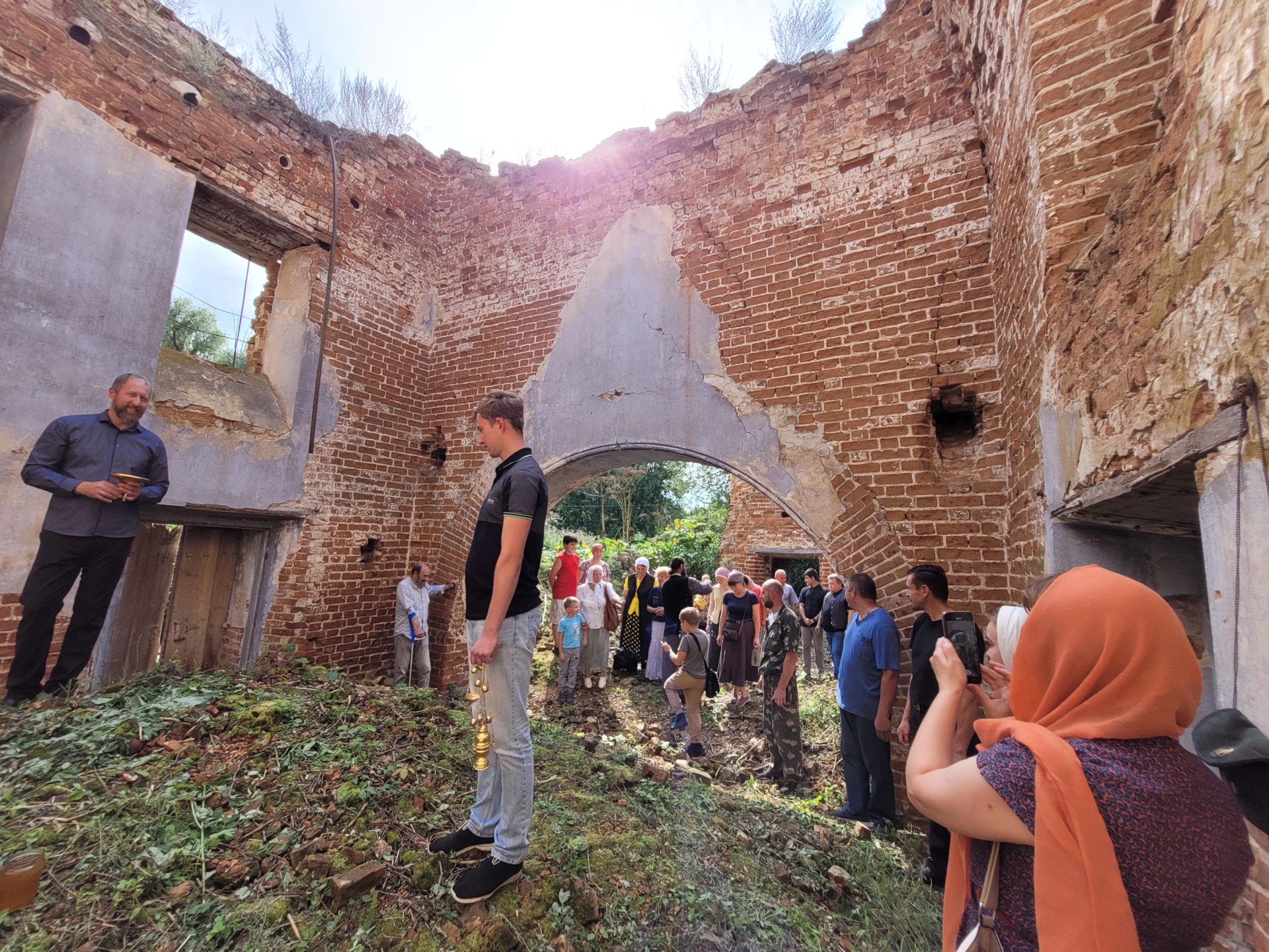 Местные жители села  Хозцы, их всего два человека, также жители соседних деревень и прихожане Предтеченского прихода собрались в разрушенном храме вознести хвалебную песнь Божией Матери под открытым небом.