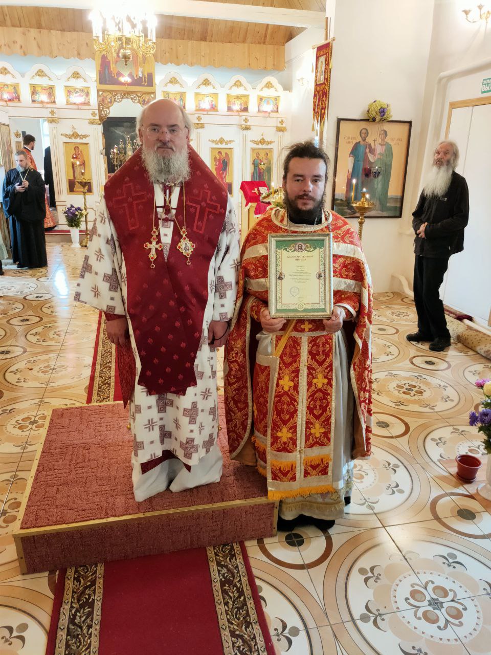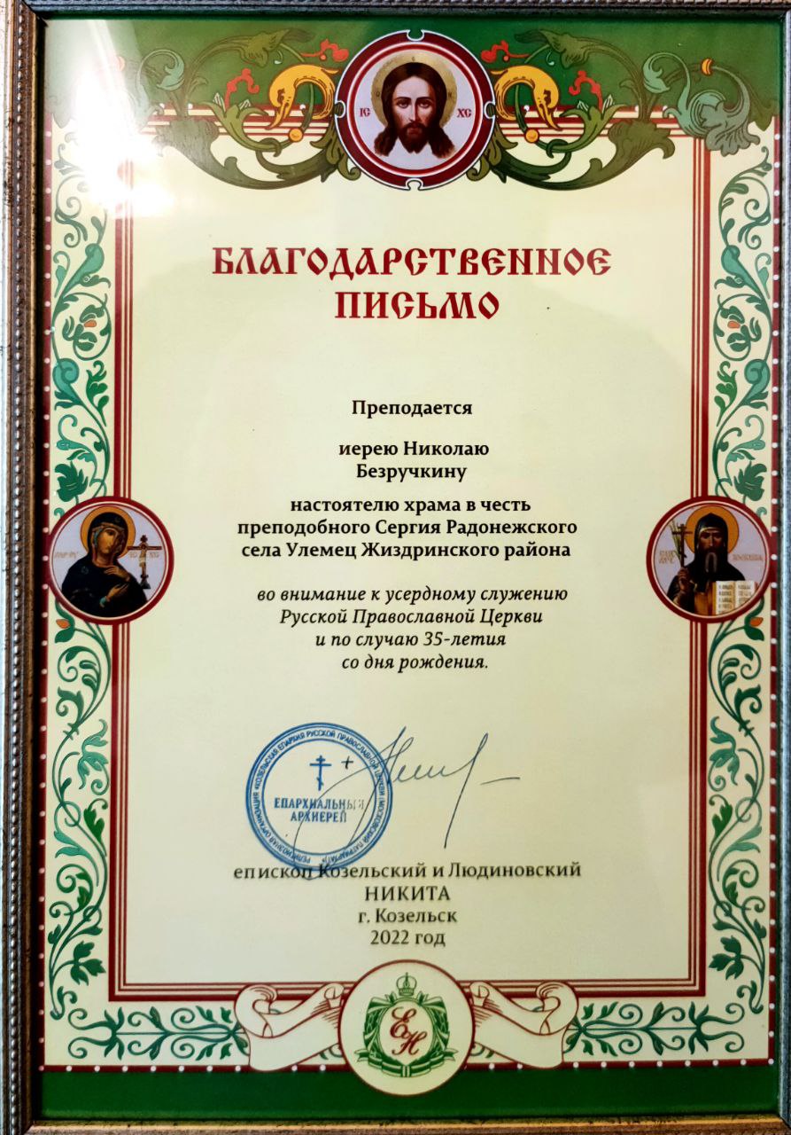 Архипастырь поздравил настоятеля храма преподобного Сергия Радонежского в селе Улемец иерея Николая Безручкина с тридцатипятилетием со дня рождения и вручил ему благодарственное Архиерейское письмо.