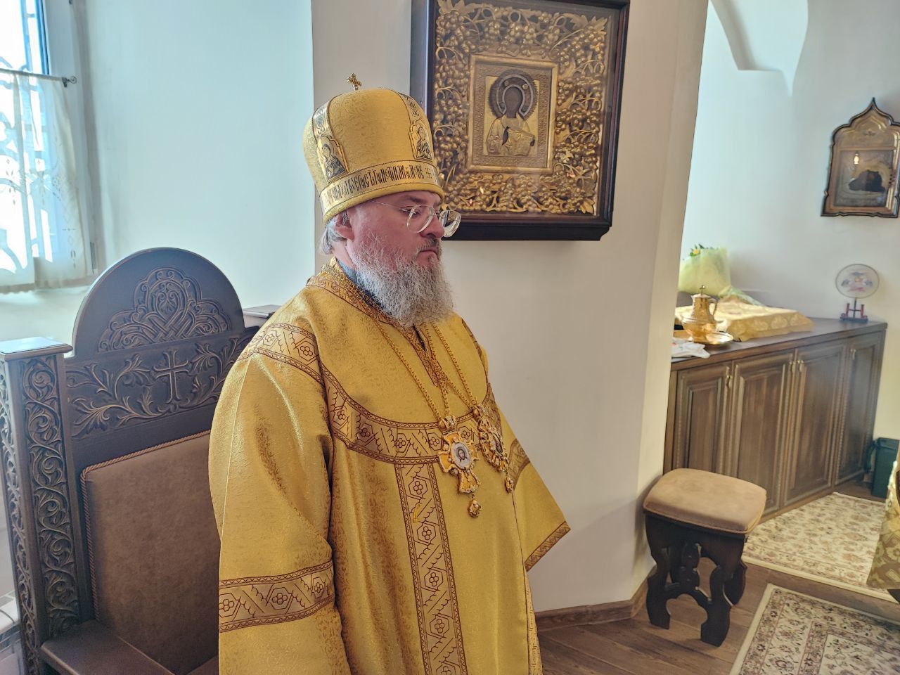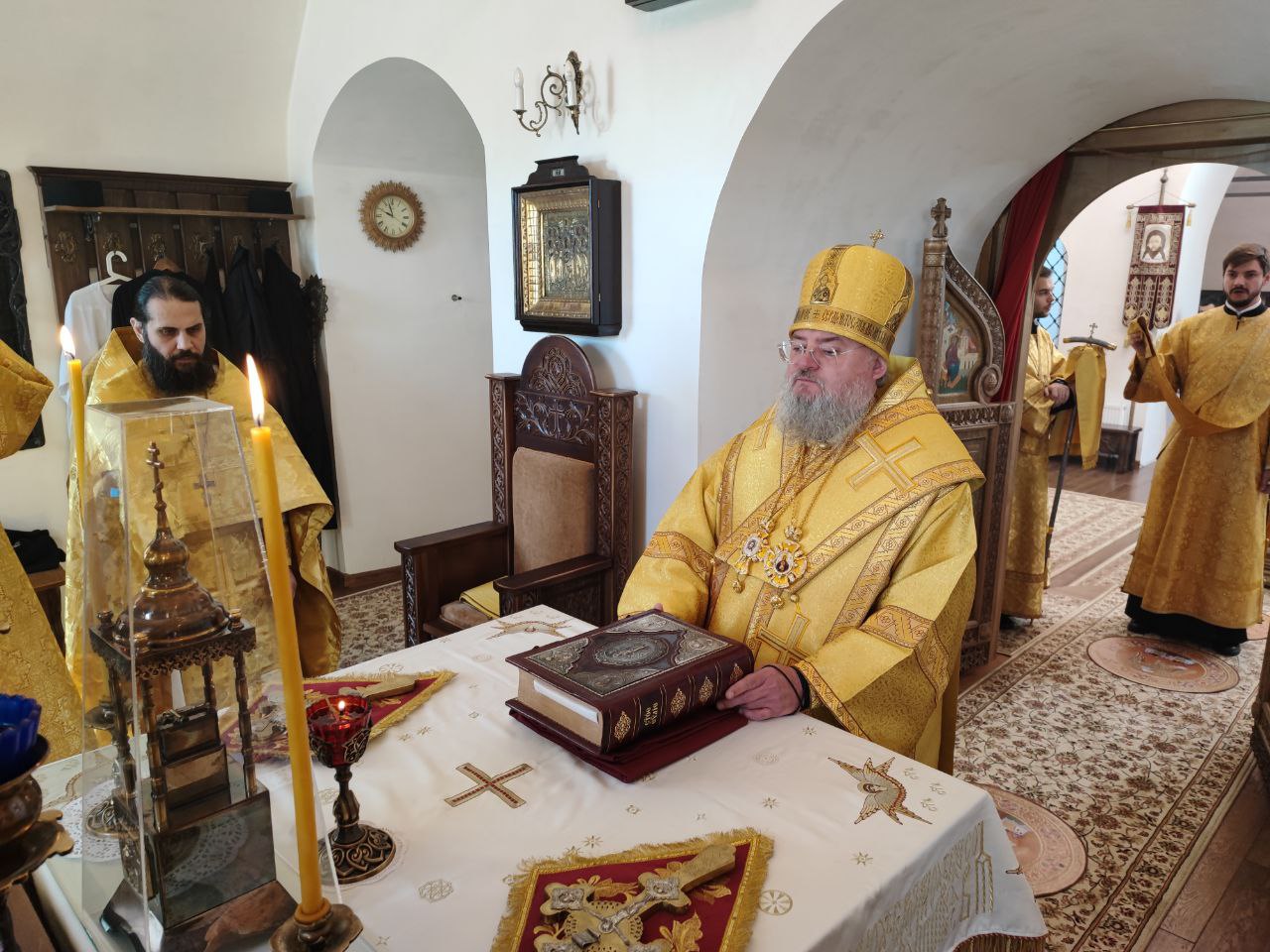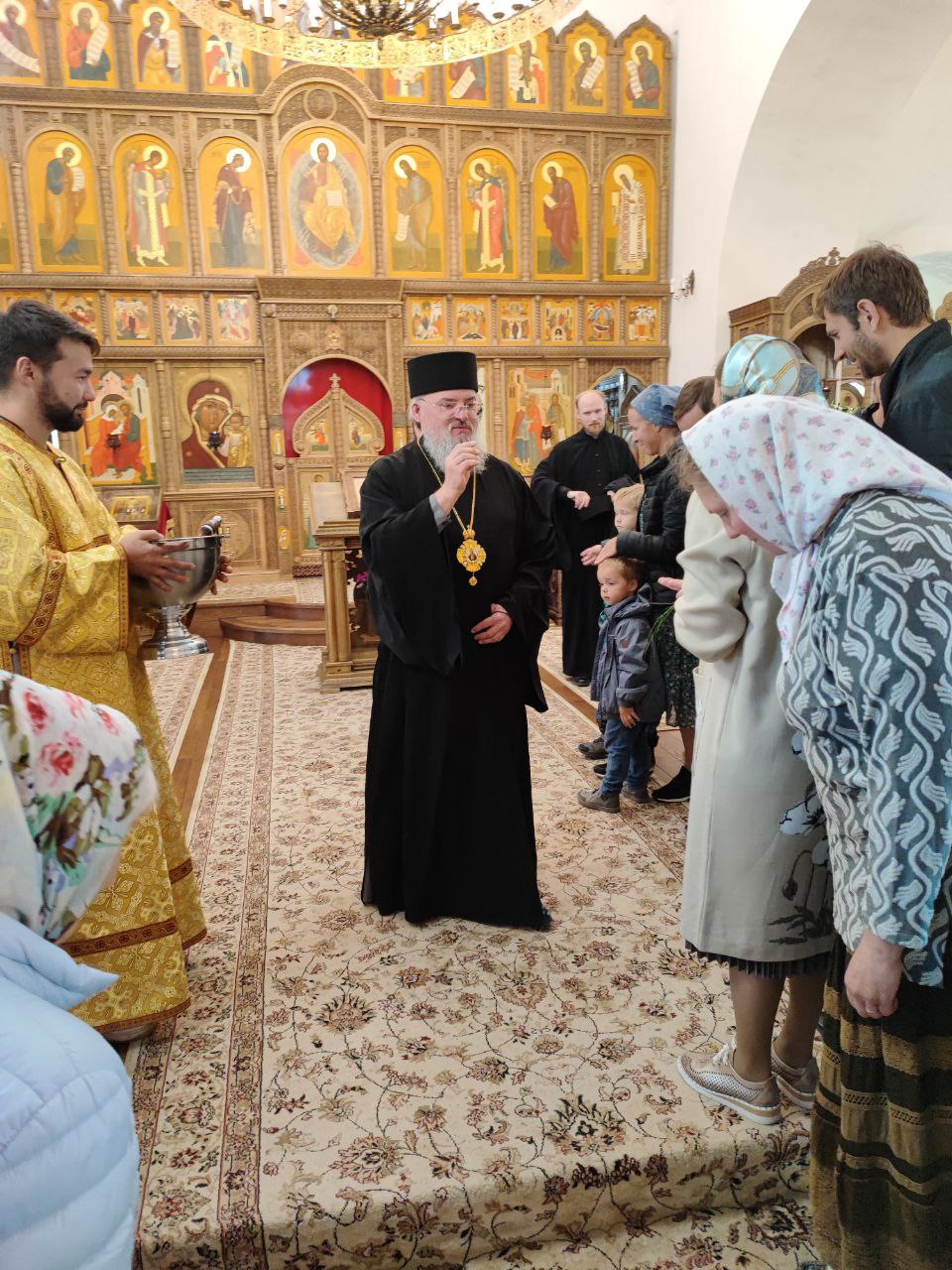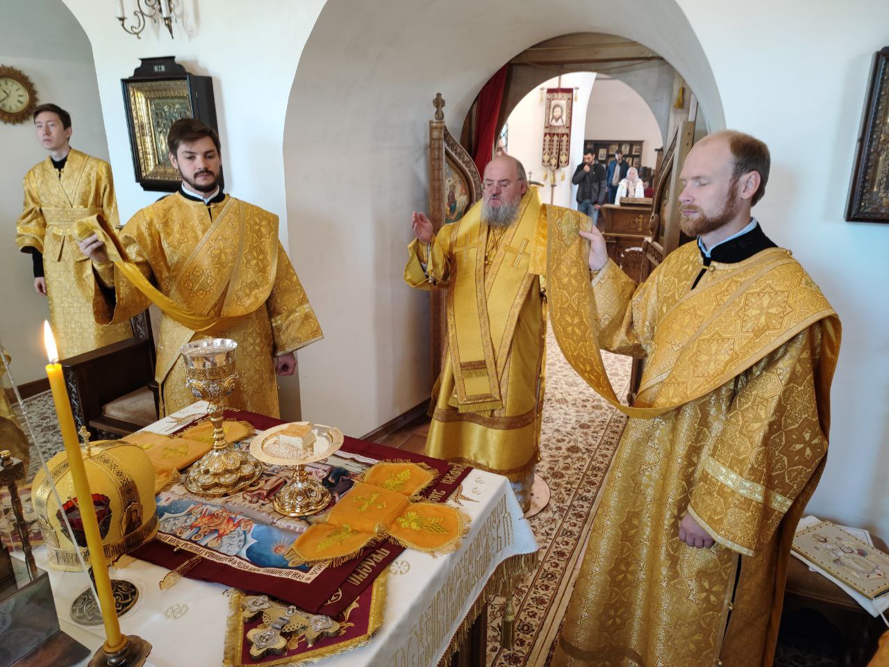 После сугубой ектении епископ Никита вознес молитву о скорейшем восстановлении мира. По благословению Святейшего Патриарха Московского и всея Руси Кирилла эта сугубая молитва совершается во всех храмах Русской Православной Церкви за каждым богослужением.