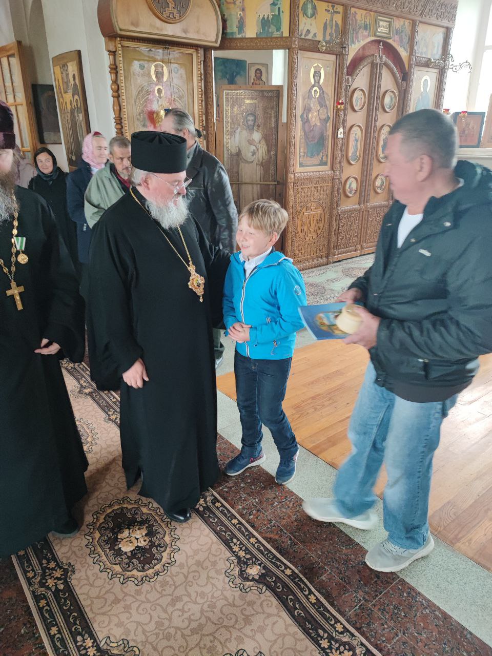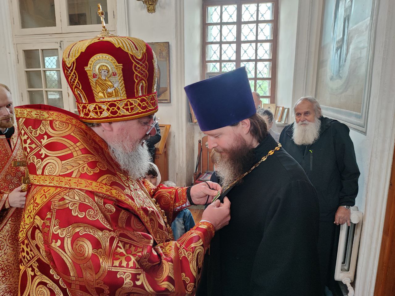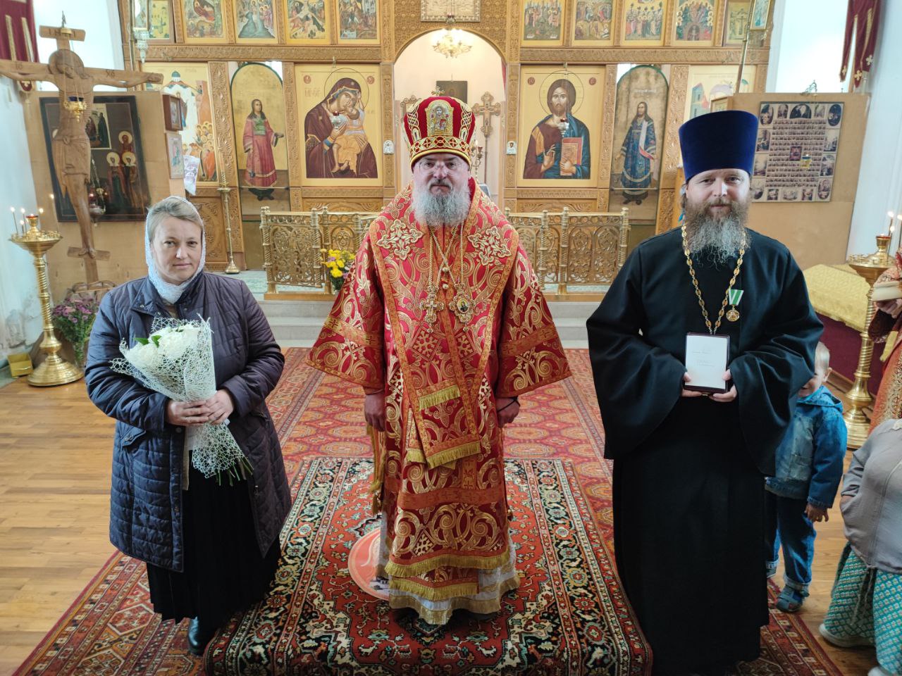 Возложив награду, владыка поздравил и поблагодарил отца Ярослава за многолетние усердное служение и вручил ему святую просфору, а его супруге матушке Серафиме букет цветов.