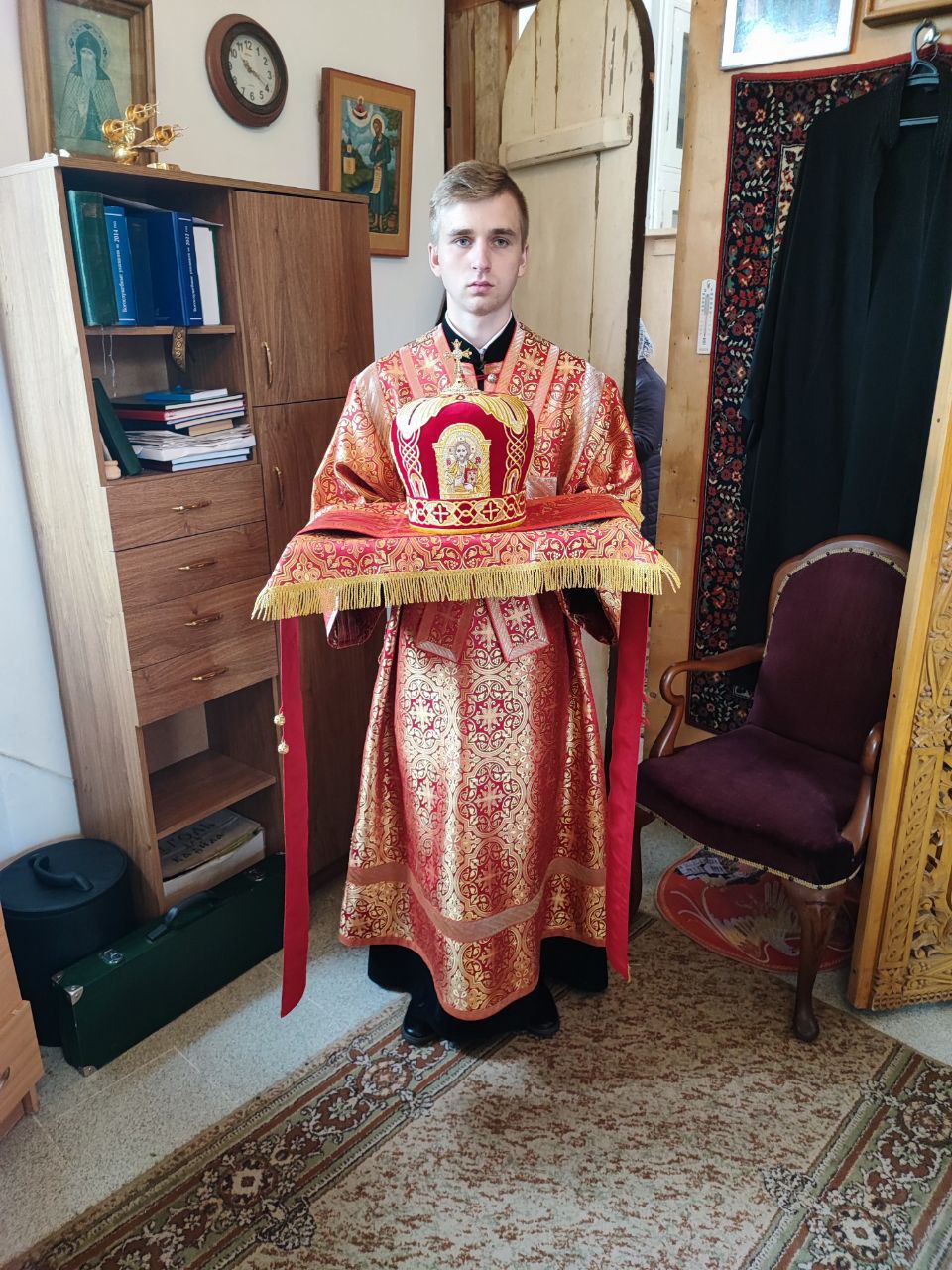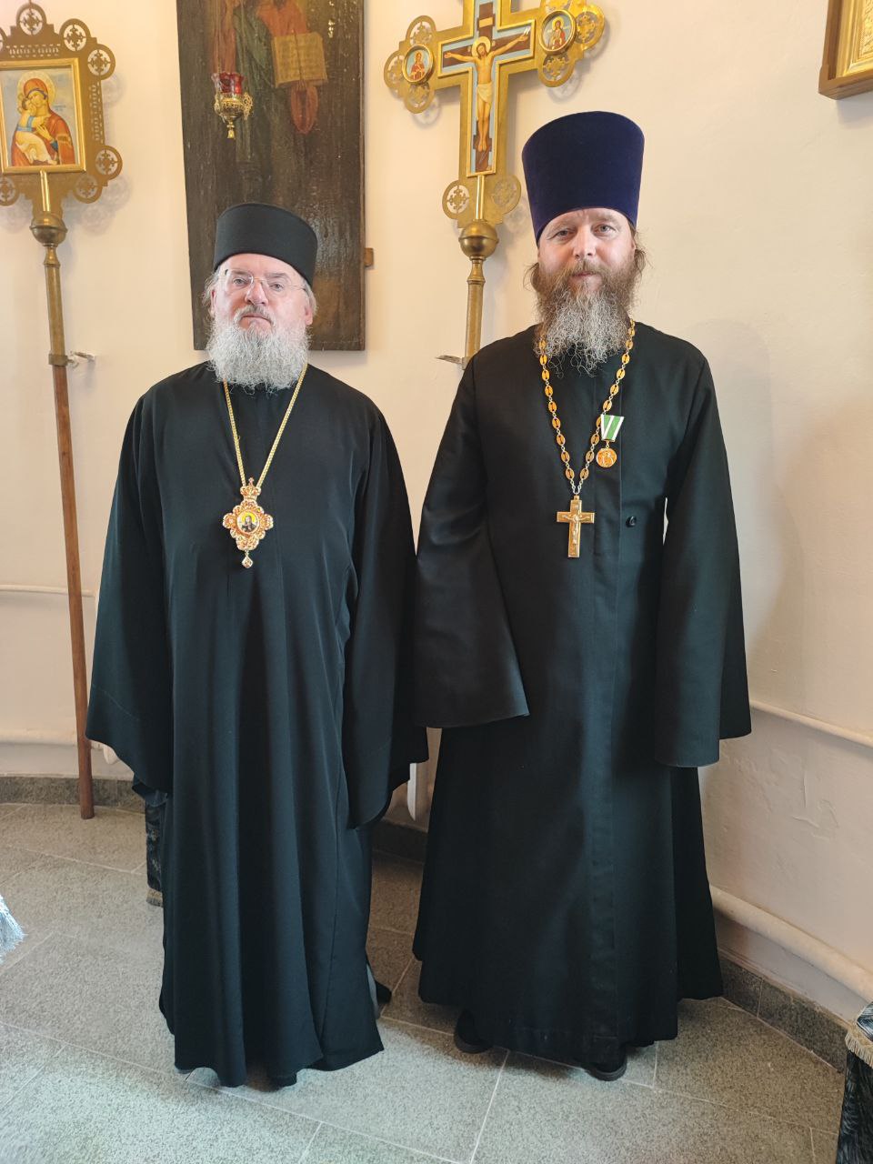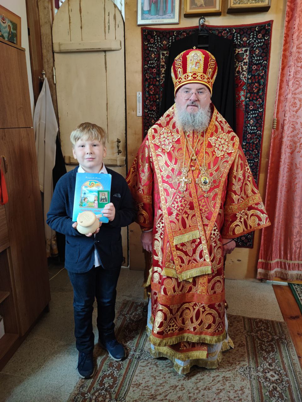 Возложив награду, владыка поздравил и поблагодарил отца Ярослава за многолетние усердное служение и вручил ему святую просфору, а его супруге матушке Серафиме букет цветов.