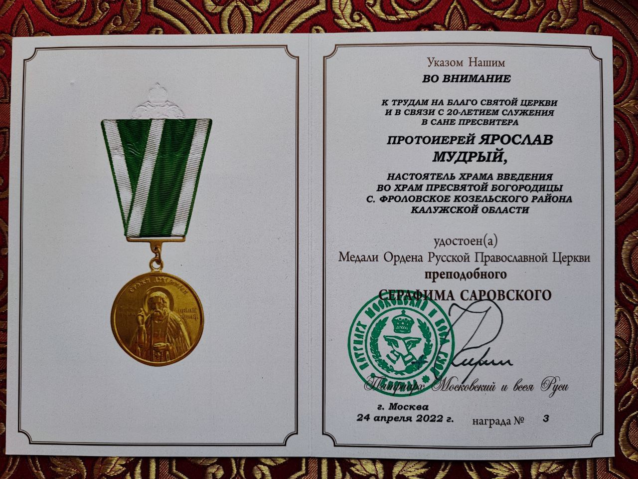 Во внимание к усердным трудам во славу Святой Церкви и в связи с 20летием служения в сане пресвитера настоятель храма протоиерей Ярослав Мудрый, по благословению Святейшего Патриарха Московского и всея Руси Кирилла, был удостоен медали Ордена Русской Православной Церкви преподобного Серафима Саровского.