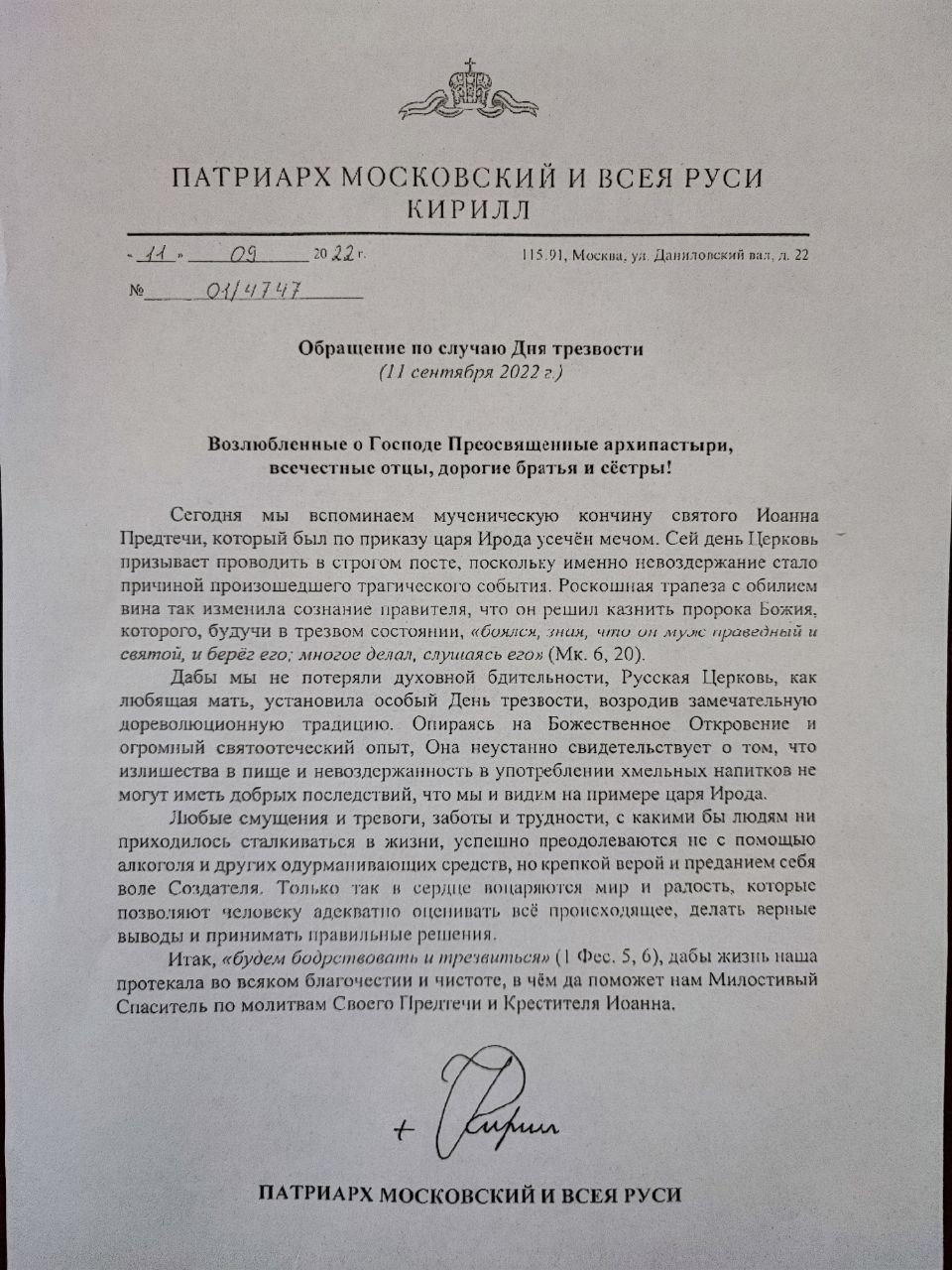 На запричастном стихе было оглашено послание Святейшего Патриарха Кирилла по случаю Дня трезвости.