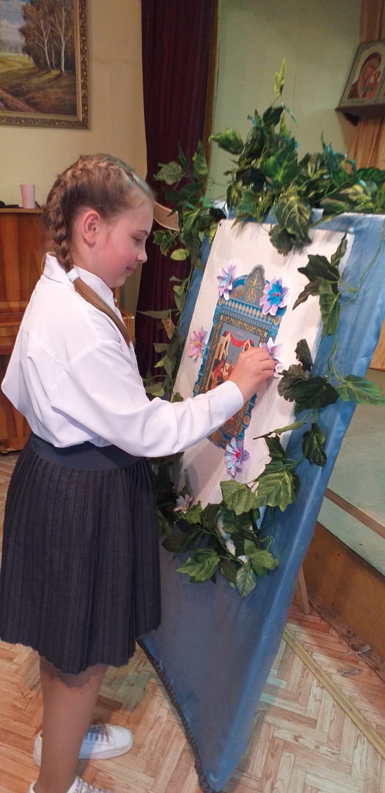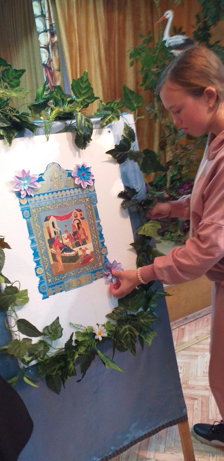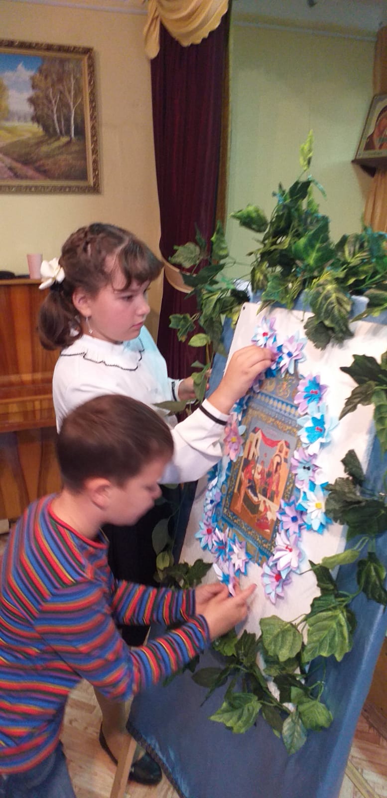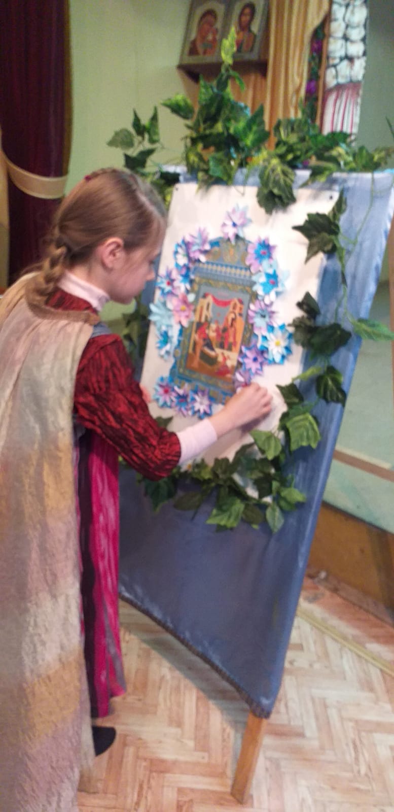 В заключении было рассказано о церковной флористике и после мастер-класса по изготовлению цветов из бумаги, дети украсили ими икону праздника Рождества Пресвятой Богородицы. На память всем участникам подарили раскраску, посвященную князю Дмитрию Донскому.