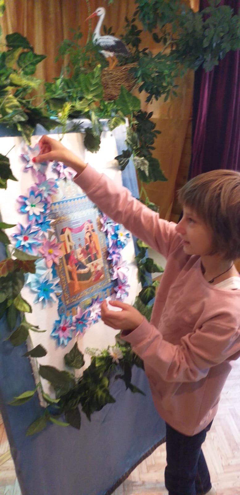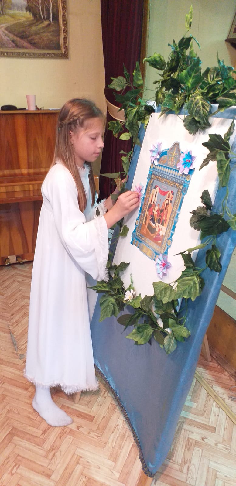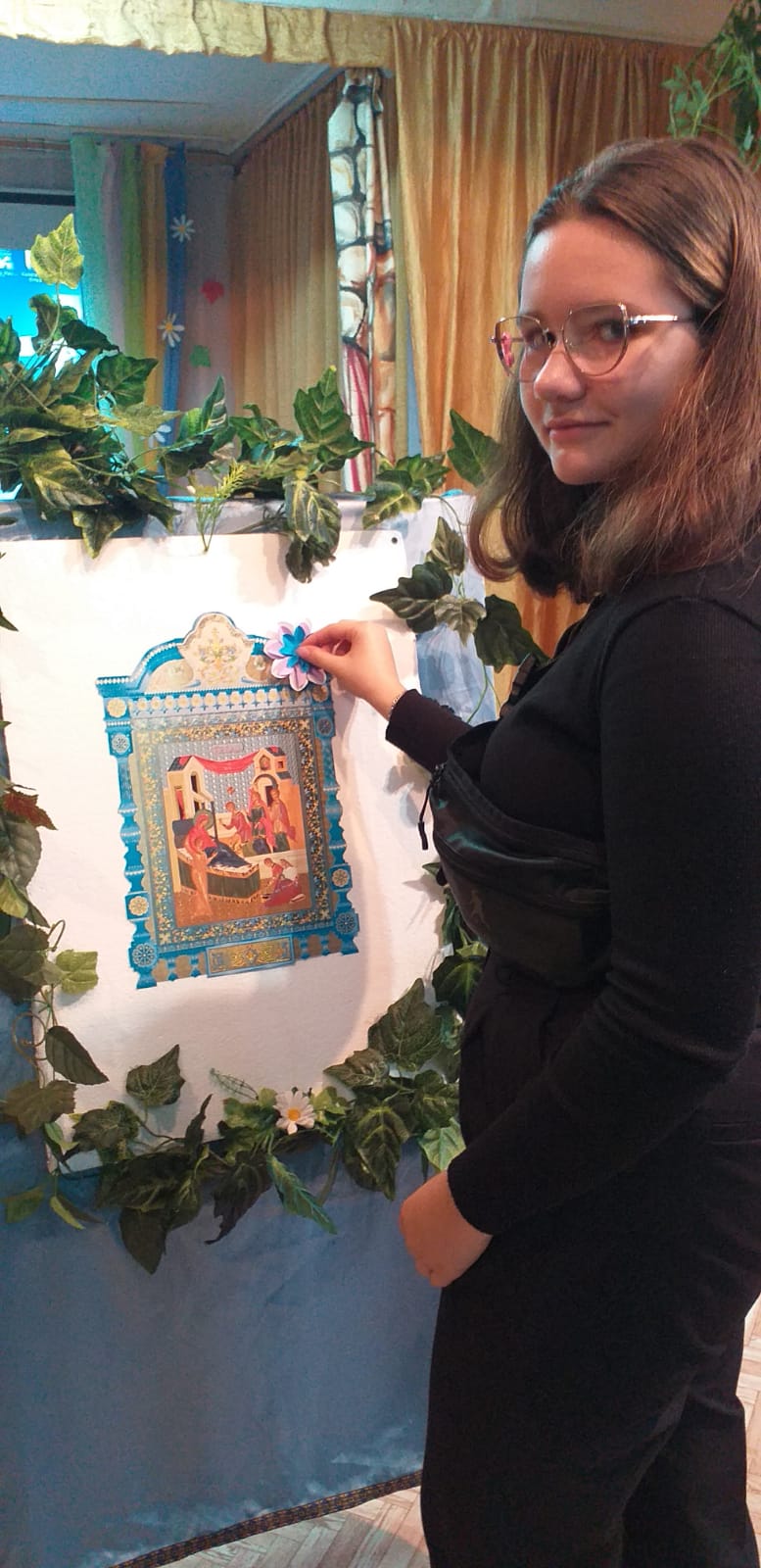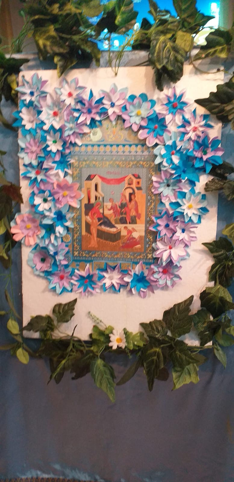 В заключении было рассказано о церковной флористике и после мастер-класса по изготовлению цветов из бумаги, дети украсили ими икону праздника Рождества Пресвятой Богородицы. На память всем участникам подарили раскраску, посвященную князю Дмитрию Донскому.