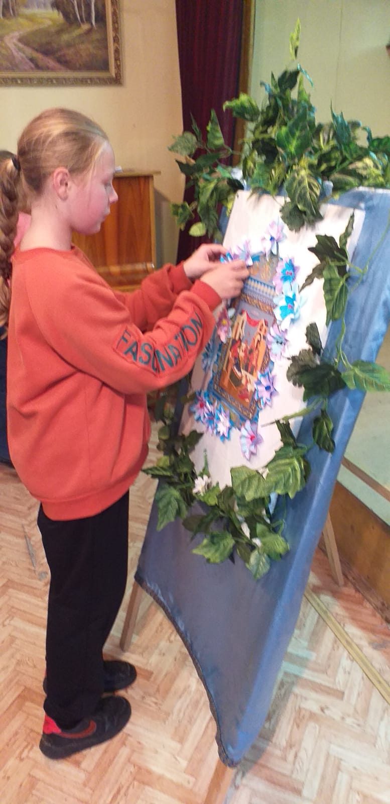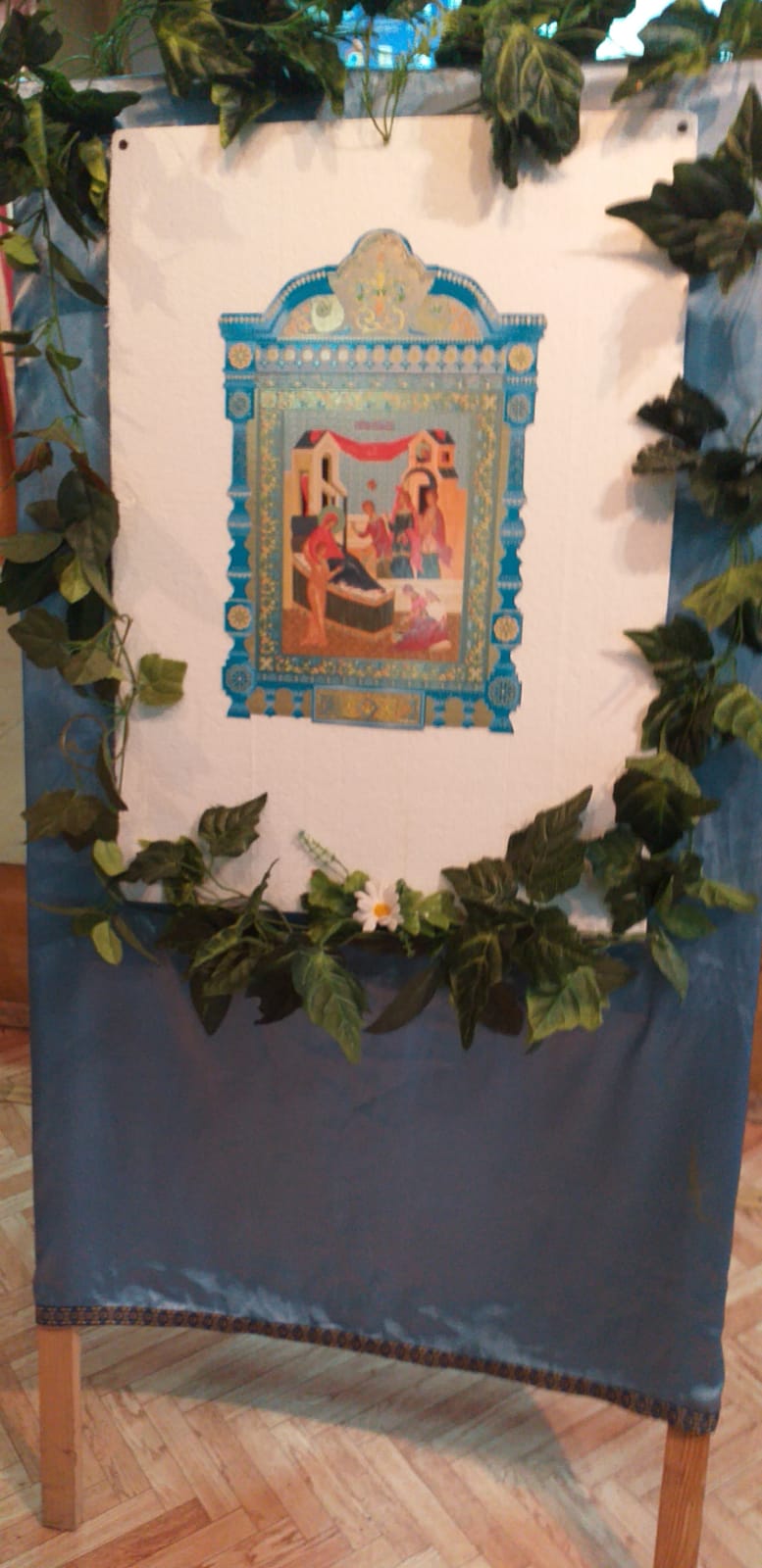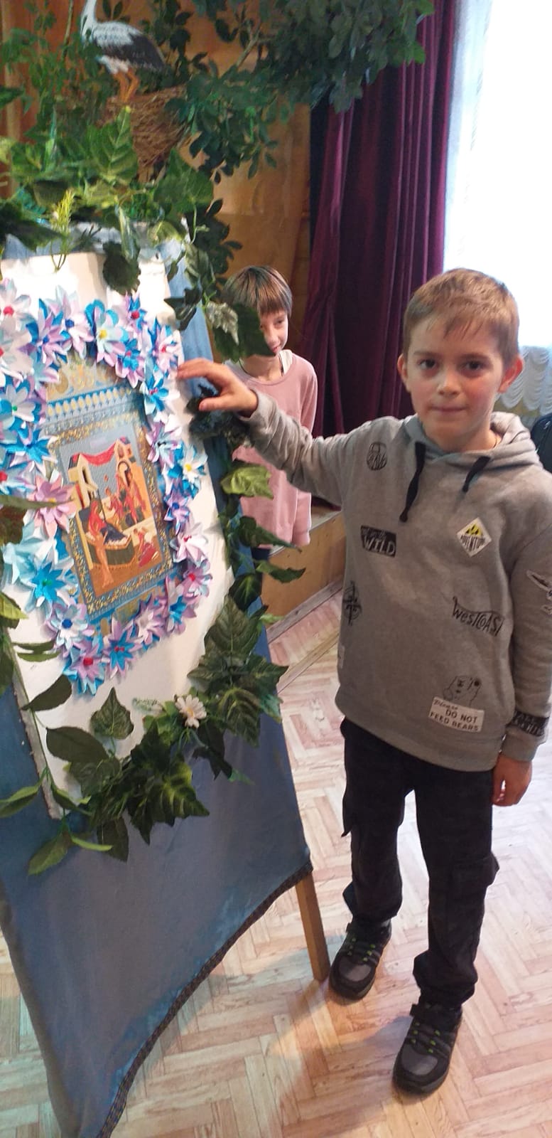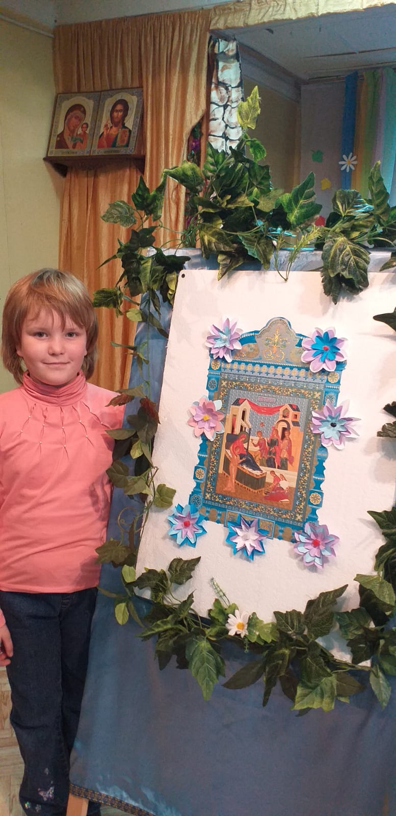В заключении было рассказано о церковной флористике и после мастер-класса по изготовлению цветов из бумаги, дети украсили ими икону праздника Рождества Пресвятой Богородицы. На память всем участникам подарили раскраску, посвященную князю Дмитрию Донскому.
