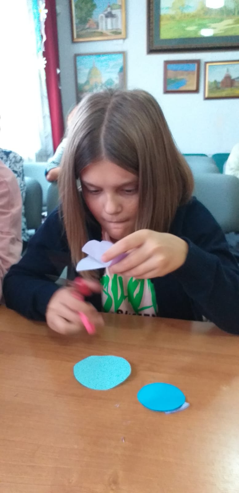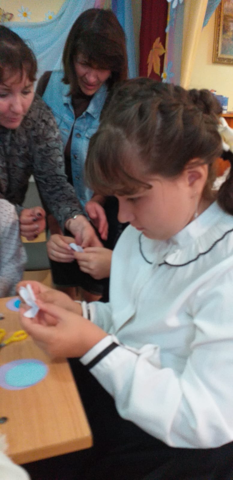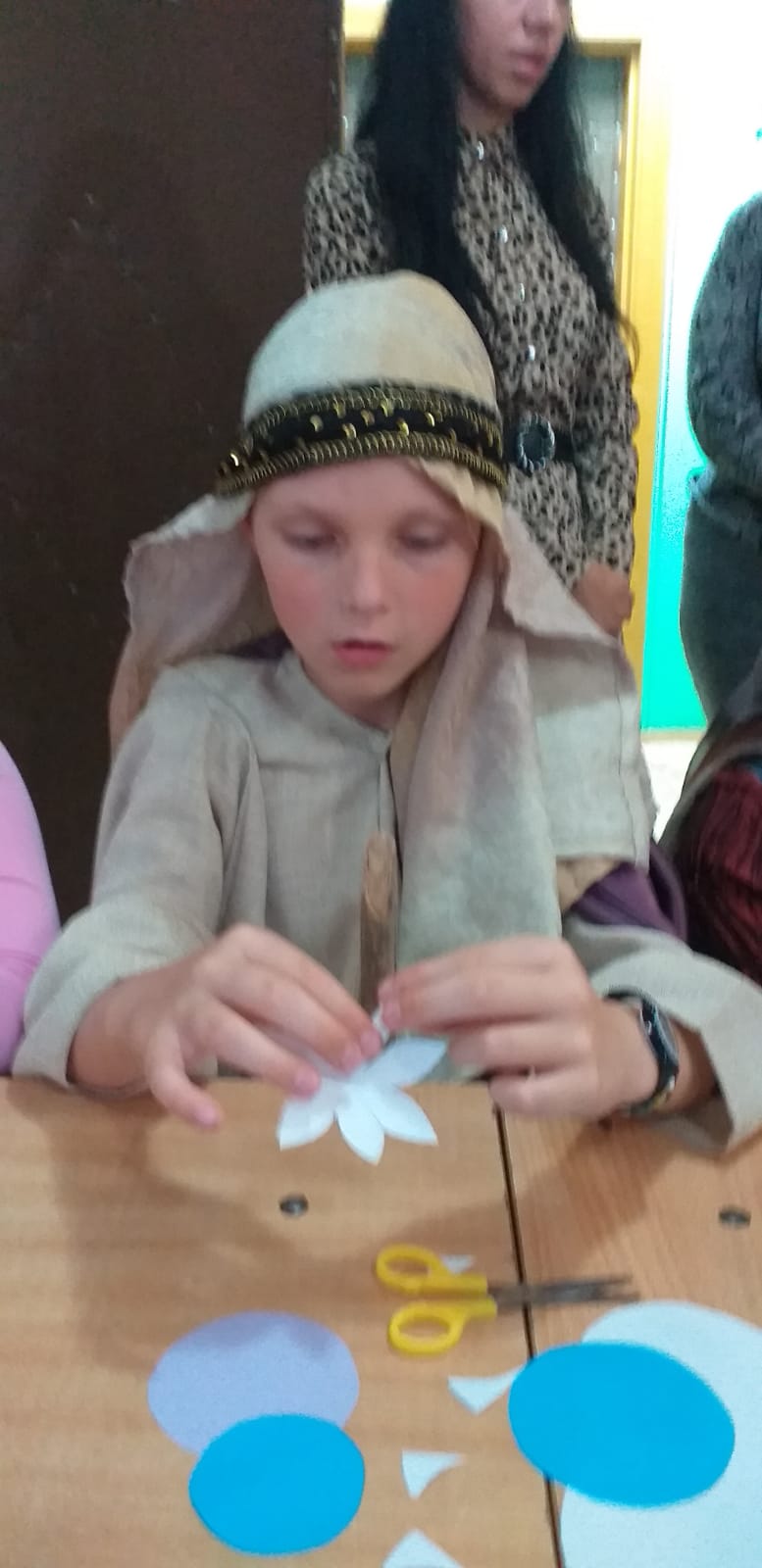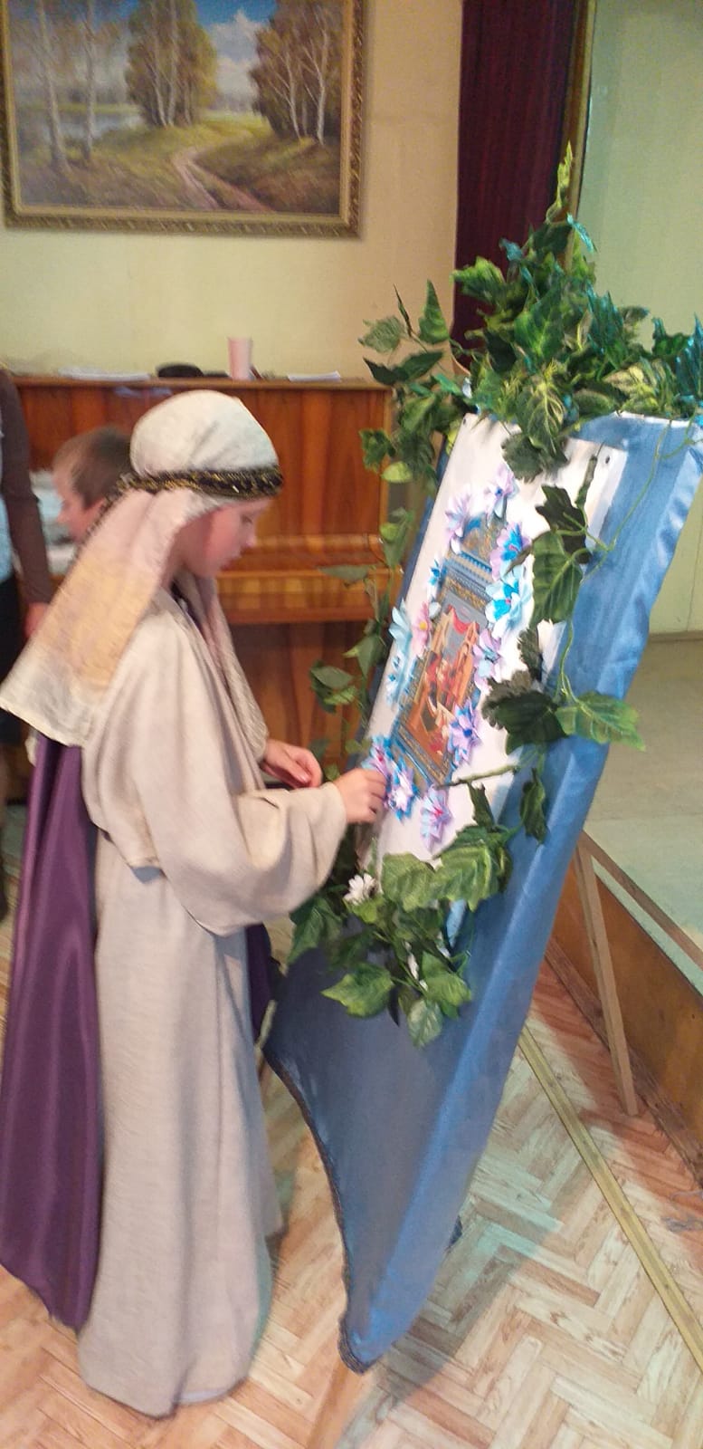 В заключении было рассказано о церковной флористике и после мастер-класса по изготовлению цветов из бумаги, дети украсили ими икону праздника Рождества Пресвятой Богородицы. На память всем участникам подарили раскраску, посвященную князю Дмитрию Донскому.