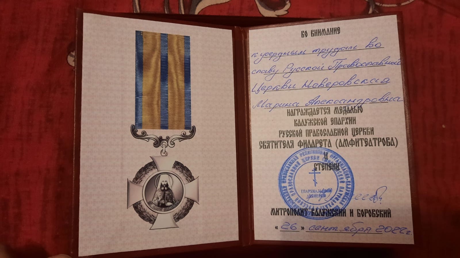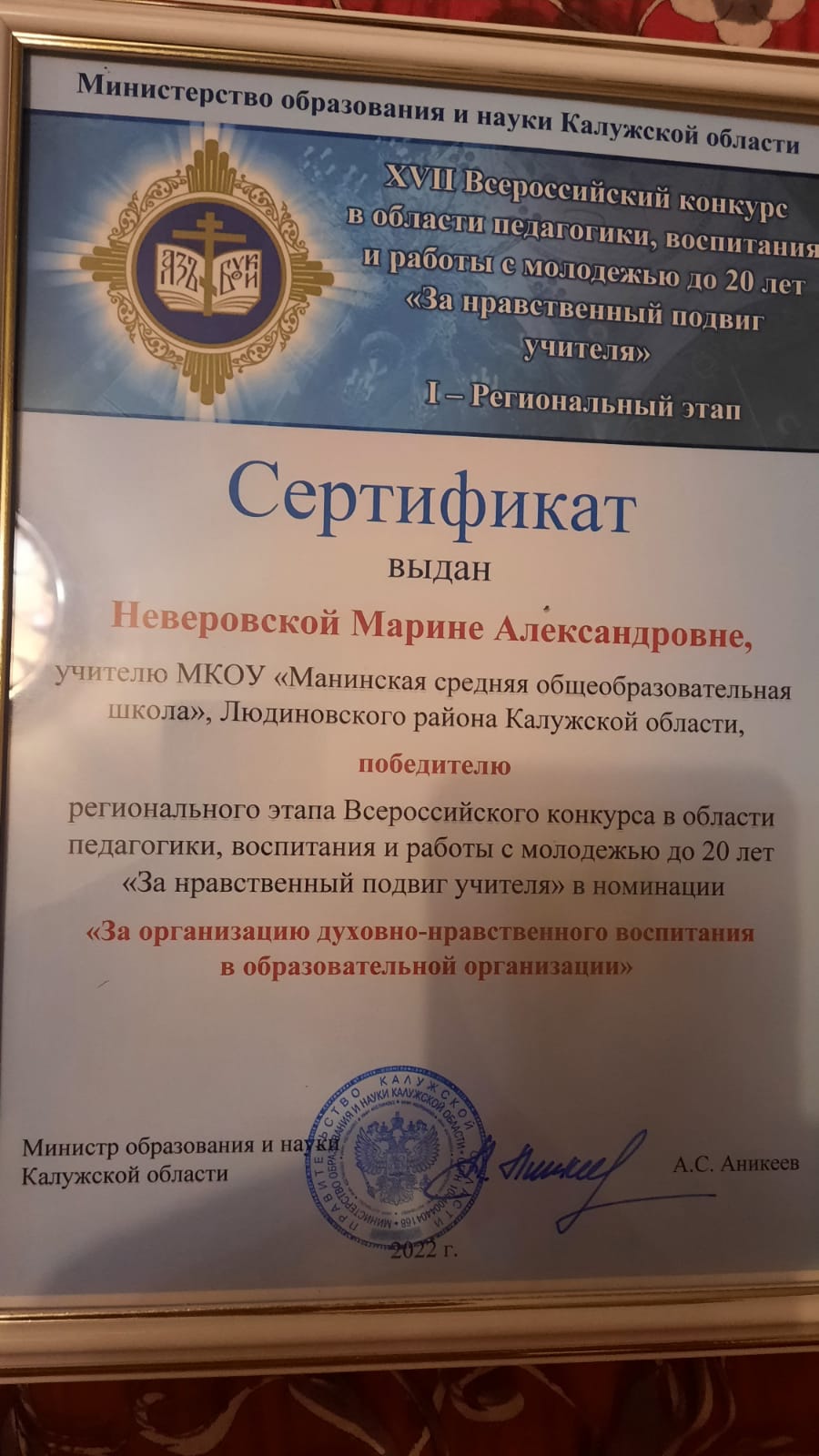 Марина Александровна Неверовская, учитель Манинской средней школы Людиновского района стала победителем регионального этапа Всероссийского конкурса  «За нравственный подвиг учителя», и была награждена медалью Калужской епархии Русской Православной Церкви Святителя Филарета (Амфитеатрова) II степени.