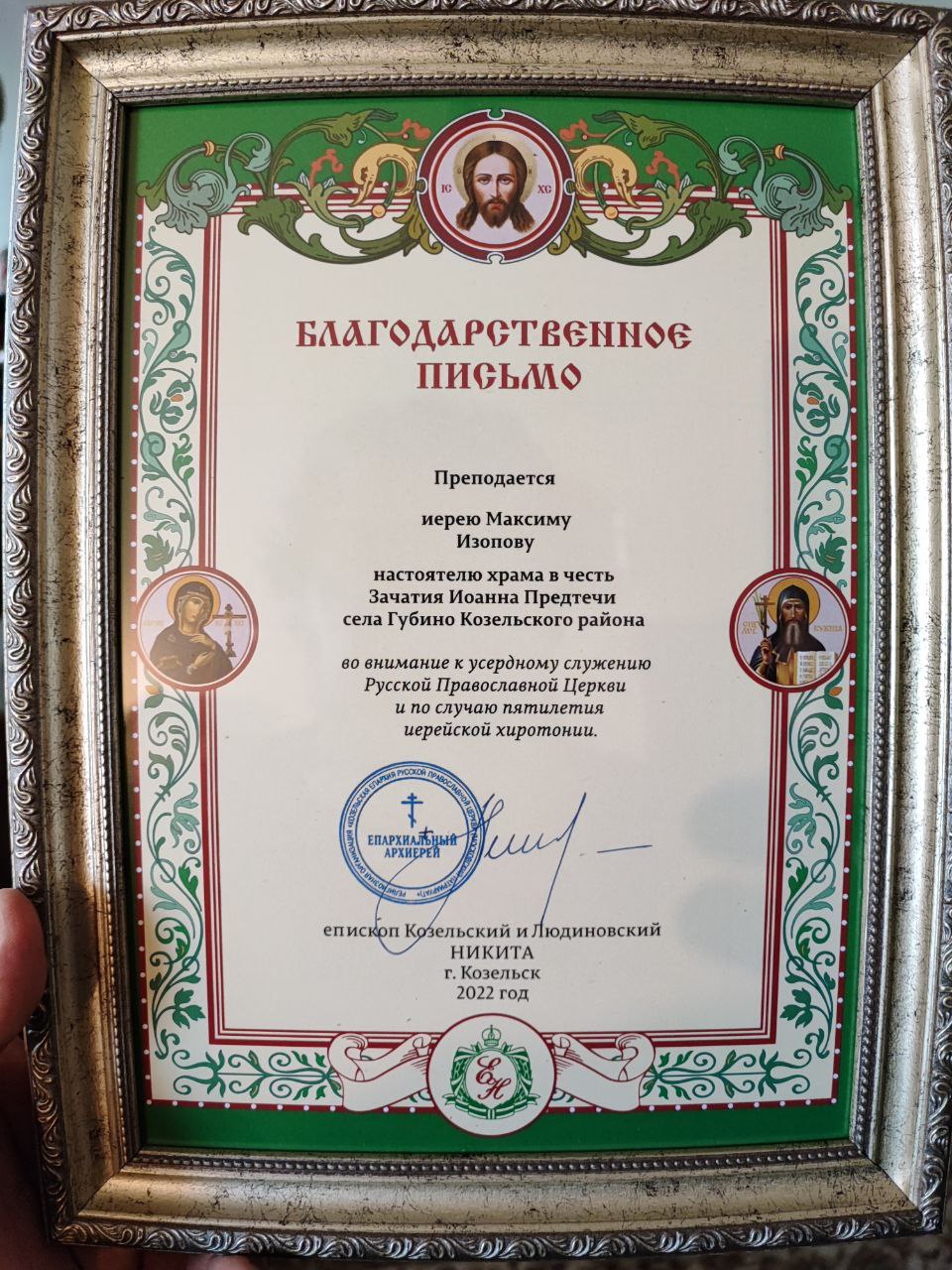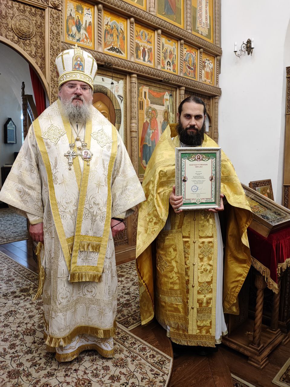 Во внимание к трудам во славу Святой Церкви и в связи с пятилетием служения в священном сане настоятель прихода иерей Максим Изопов был удостоен Благодарственного архиерейского письма.