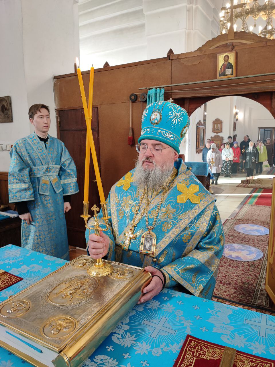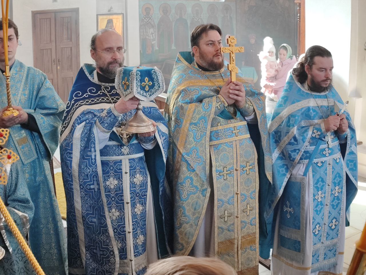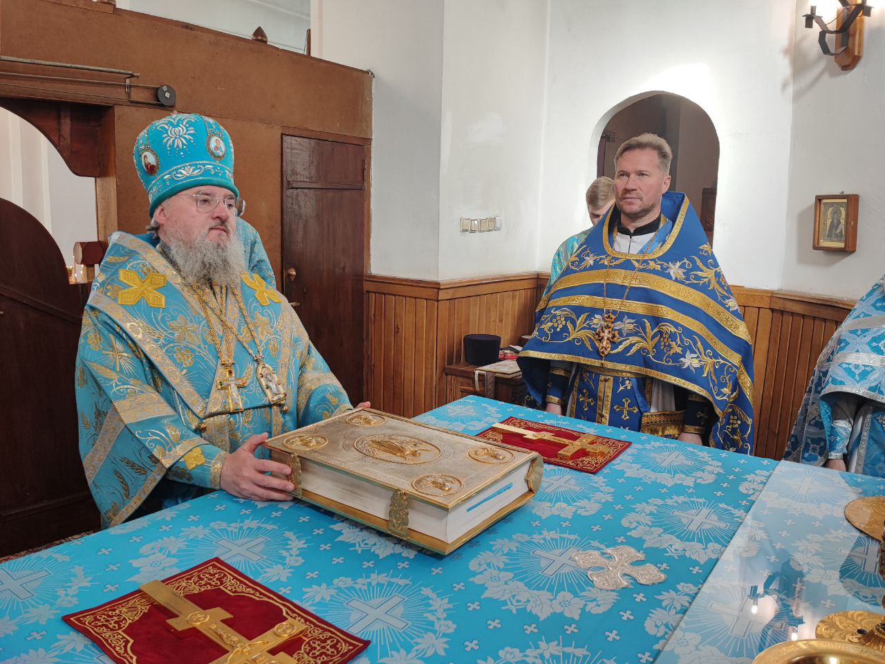 Преосвященному владыке сослужили: настоятель храма митрофорный протоиерей Константин Гипп, протоиерей Александр Карпов, протоиерей Антоний Хатунцев, иерей Алексий Ефименков – благочинный округа, иерей Николай Безручкин, диакон Евгений Ковригин и иеродиакон Лука (Старостин).