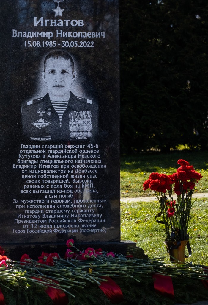 В день празднования Покрова Пресвятой Богородицы, в Козельске на площади Героев-козельчан был торжественно открыт памятник нашему земляку — Герою Российской Федерации, Гвардии старшему сержанту Владимиру Николаевичу Игнатову.