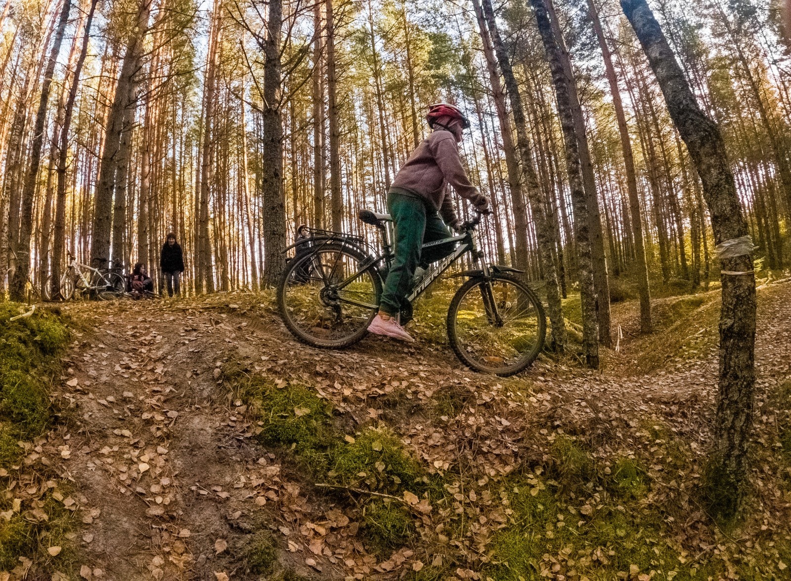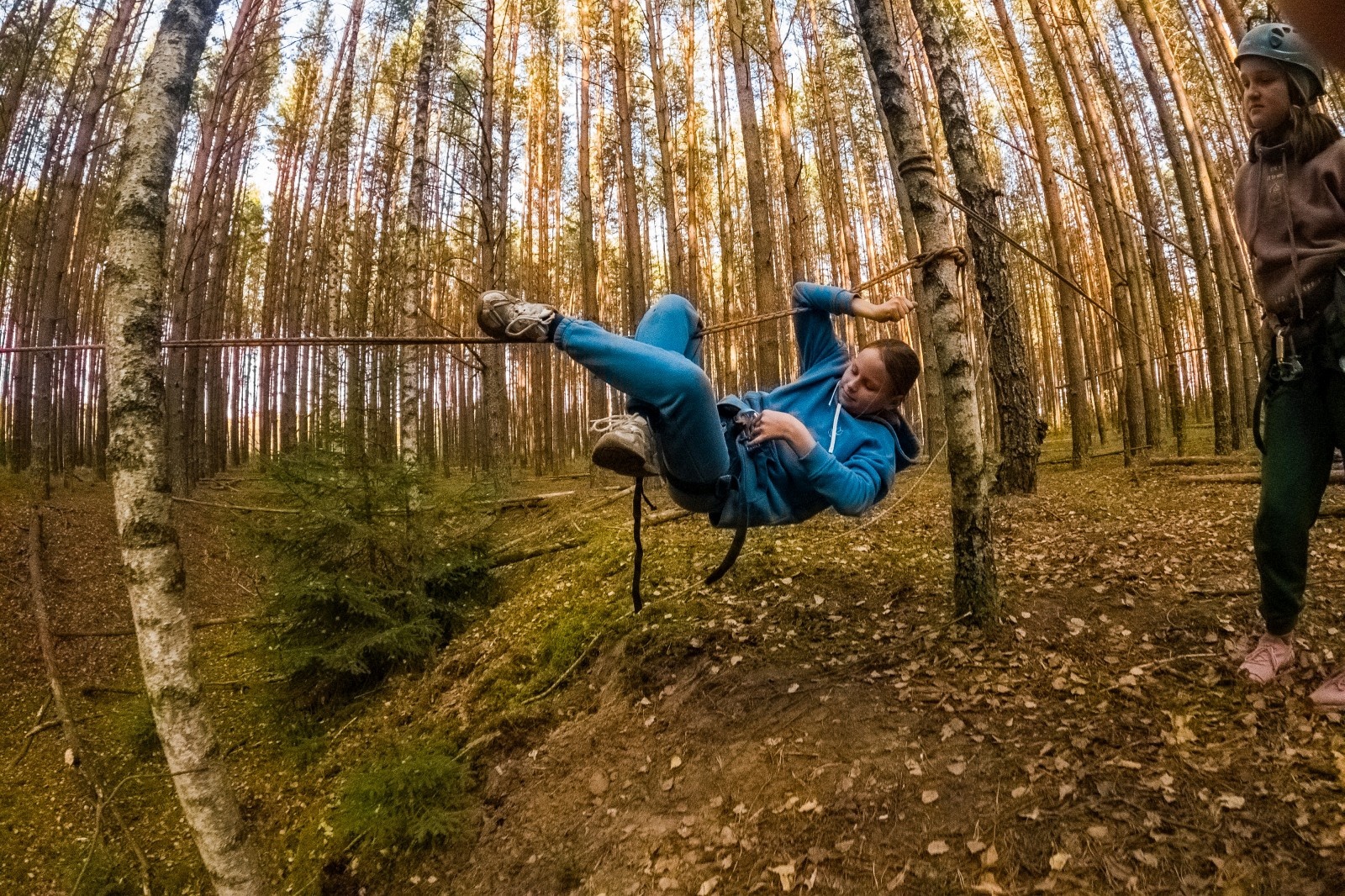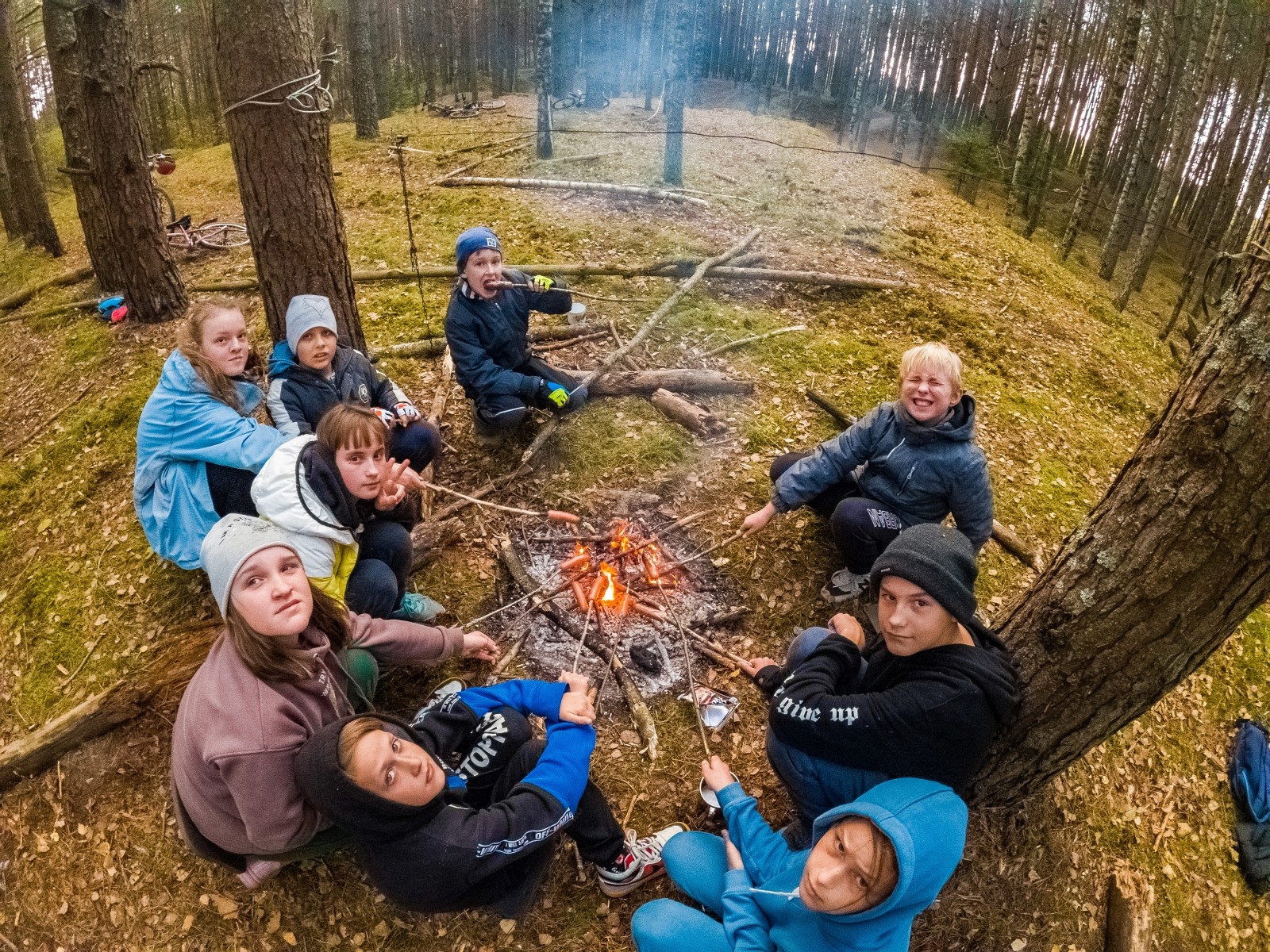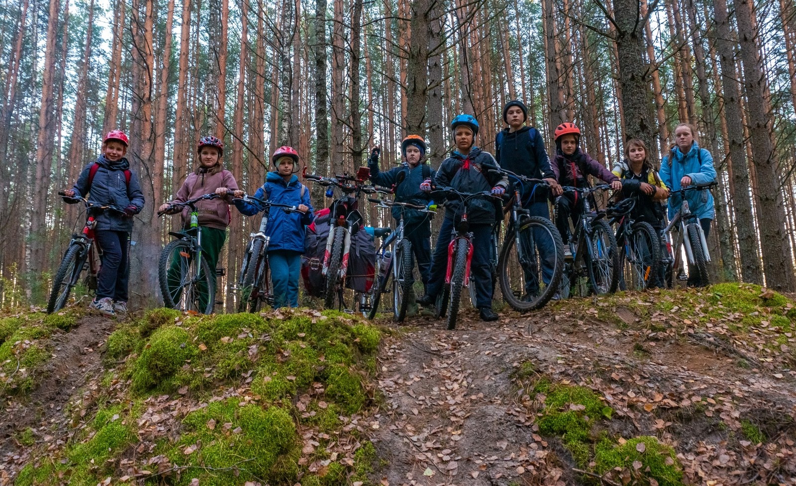 На занятии ребята практиковались в прохождении вело-трассы кросс-кантри, где учились преодолевать типичные для пересеченной местности препятствия: спуски, подъемы, песчаные участки и т. д. А также проходили навесную переправу, на этот раз она была натянута повыше, и залезть на нее было не просто. В завершении занятия было устроено традиционное лесное чаепитие.