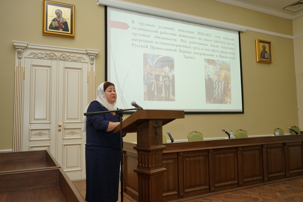 Далее, Темникова Елена Игоревна, член Общества Православных врачей во имя св. прав. Лаврентия Калужского, заслуженный врач-педиатр Калужской области, представила доклад с презентацией на тему: «Этапы взаимодействия общества Православных врачей Калужской области с НКО региона в части волонтерства и добровольчества».