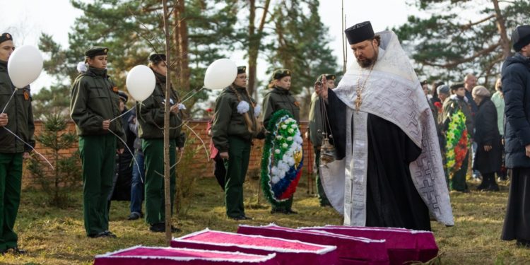 Участники поискового отряда «Мираж» под траурные звуки военного оркестра опустили в могилу, устланную алым полотном, поочередно шесть гробов. Многие люди старшего поколения не сдерживали слёз. В эти мгновения в небо взмыли шесть белых воздушных шаров, выпущенных кадетами. Они – словно знак упокоения душ бойцов, нашедших сегодня своё последнее земное пристанище.