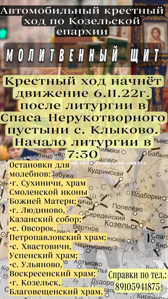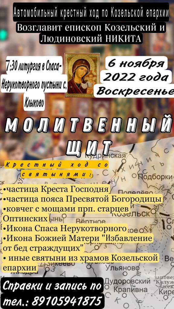 В воскресение 6 ноября 2022 года состоится автомобильный крестный ход «Молитвенный щит» по Козельской епархии