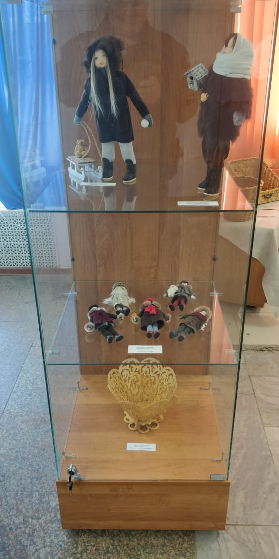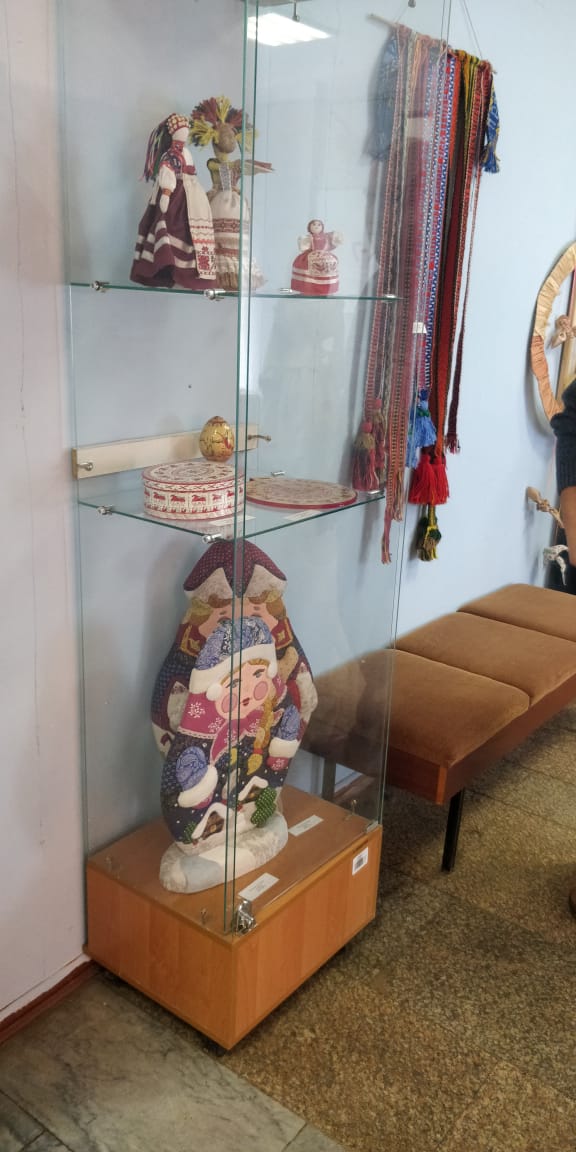 Соловьёва Ирина Анатольевна – мастер по изготовлению костюмов и кукол показала батюшке представленные на выставке старинные народные костюмы и куклы, сундук со своими работами.