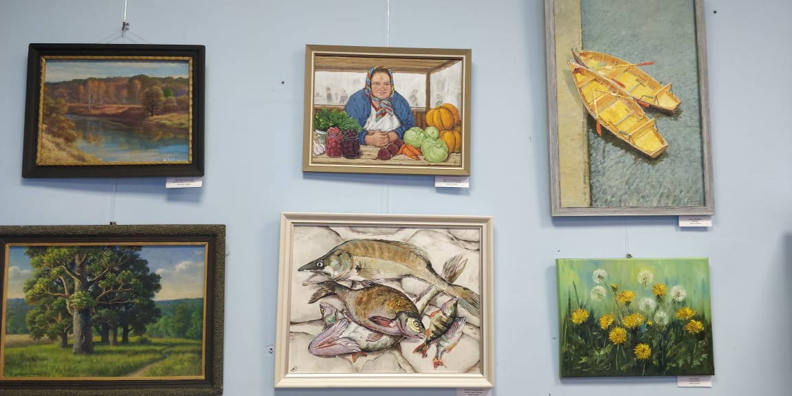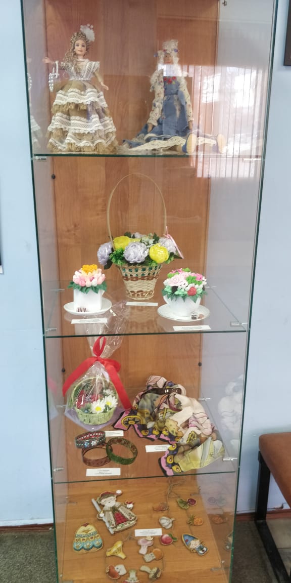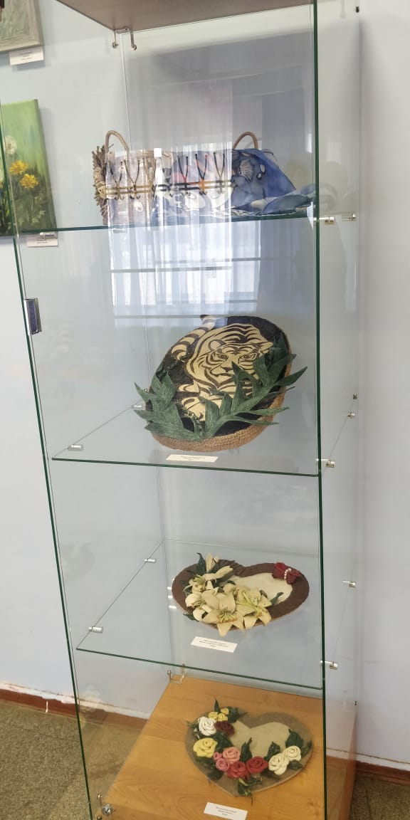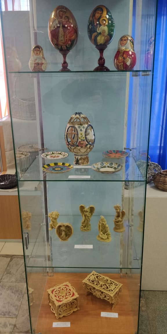 Рядом с выставкой по народным костюмам работала выставка произведений художников и мастеров декоративно – прикладного творчества Людиновского района, которую также посетил отец Алексий. Здесь Вадим Борисович Востриков – куратор выставки показал экскурсанту прекрасные изделия Людиновских мастеров.