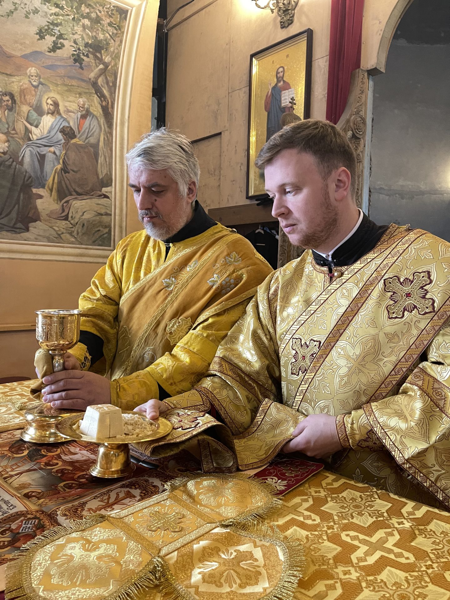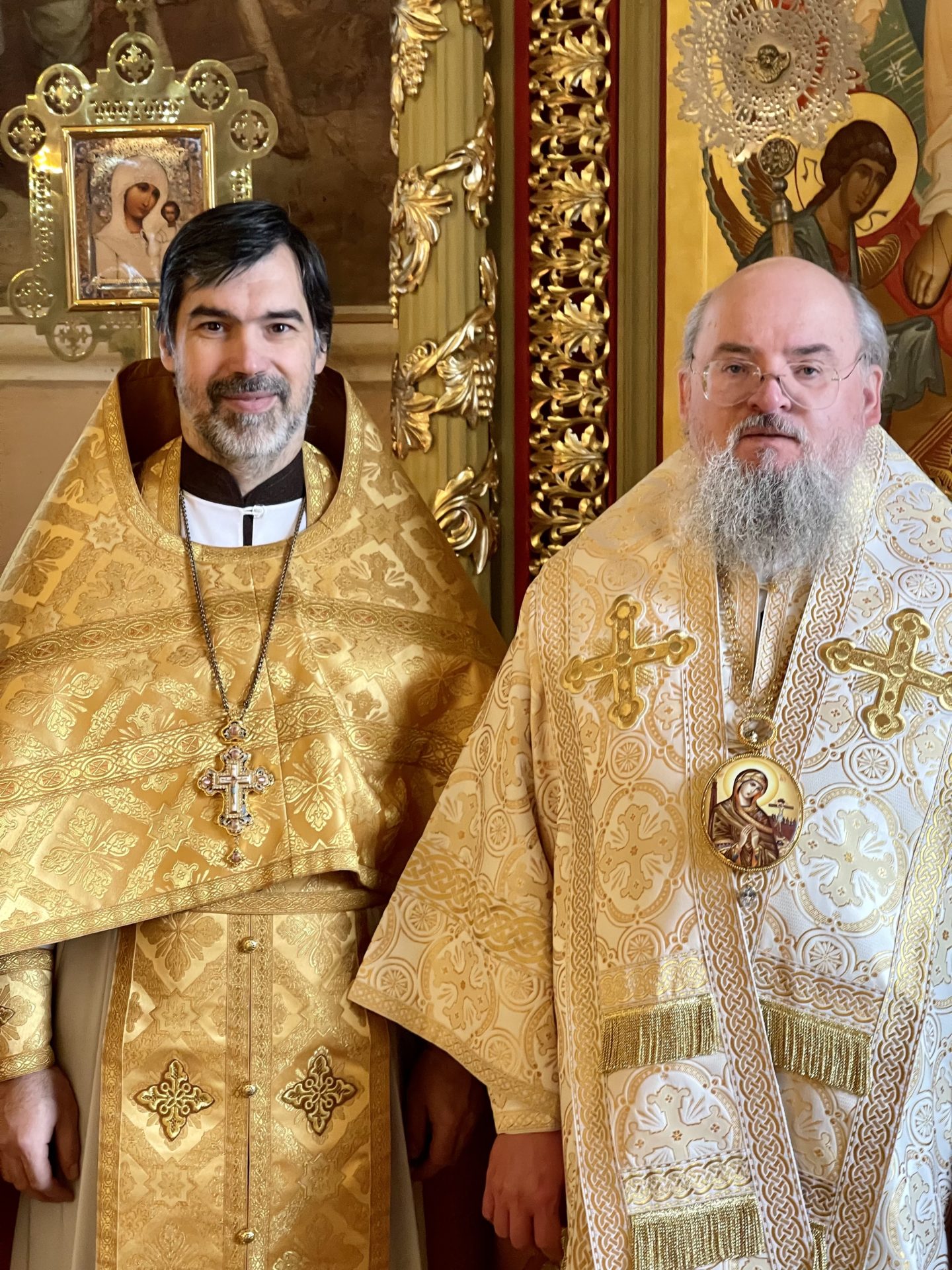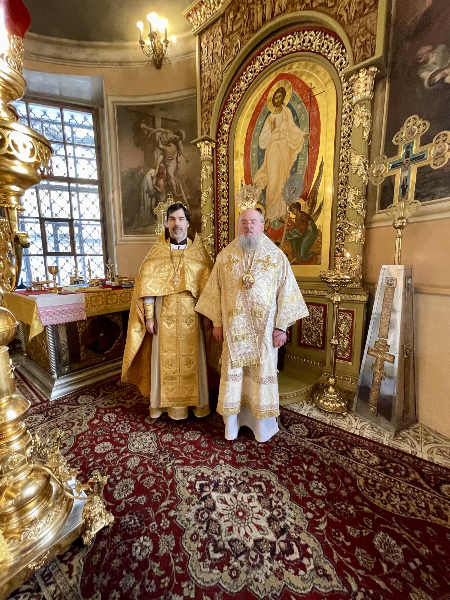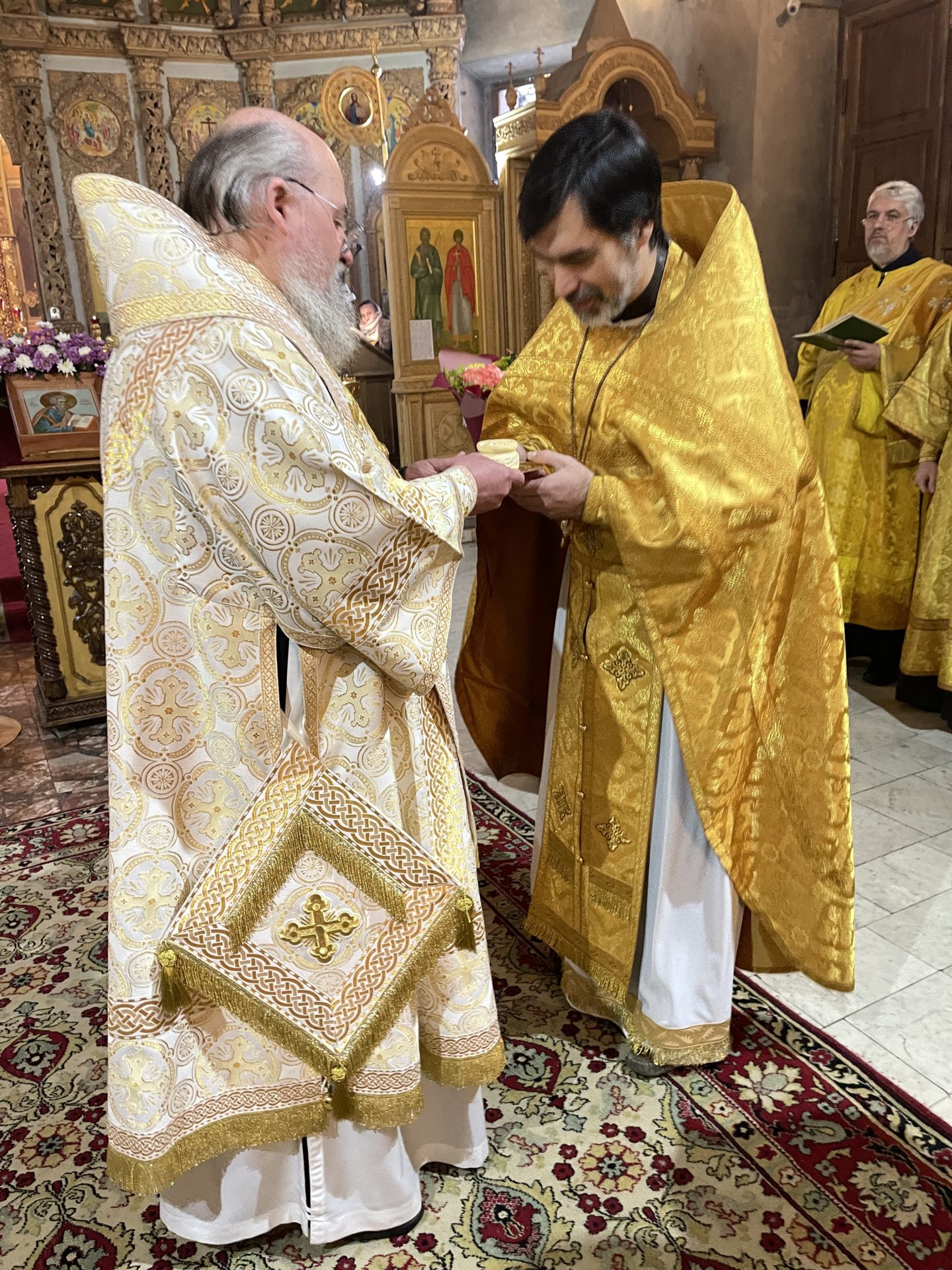 Архипастырь поздравил настоятеля храма протоиерея Вадима Кудрявцева с днем рождения, который пришёлся на этот день и преподнес ему святую просфору и букет цветов.