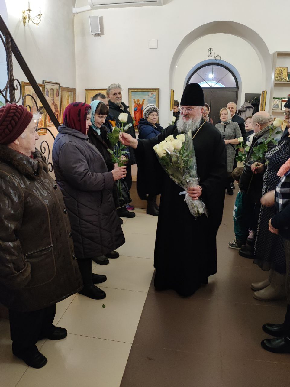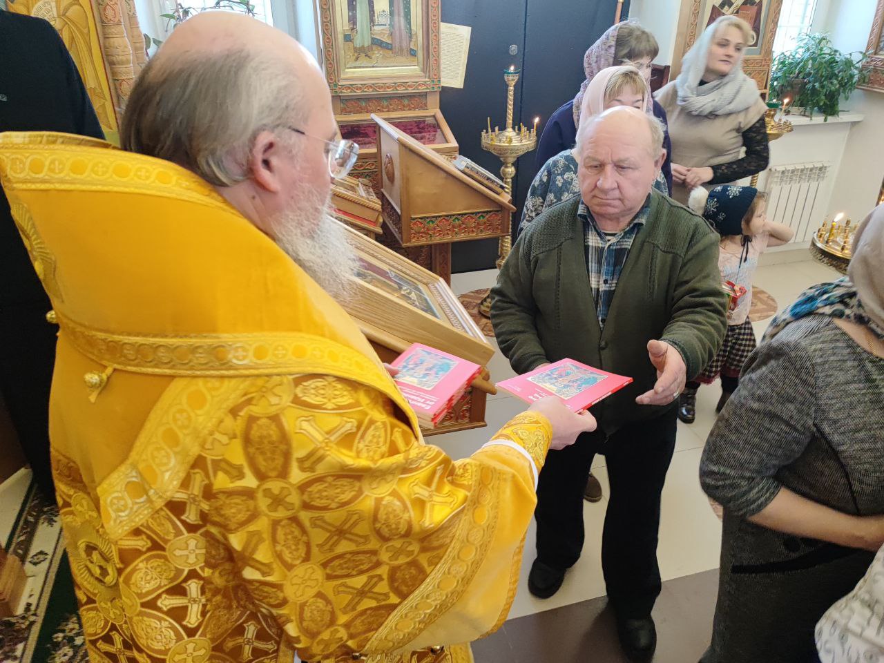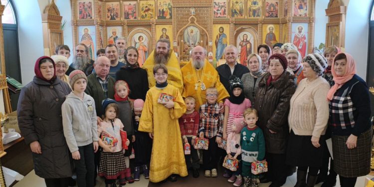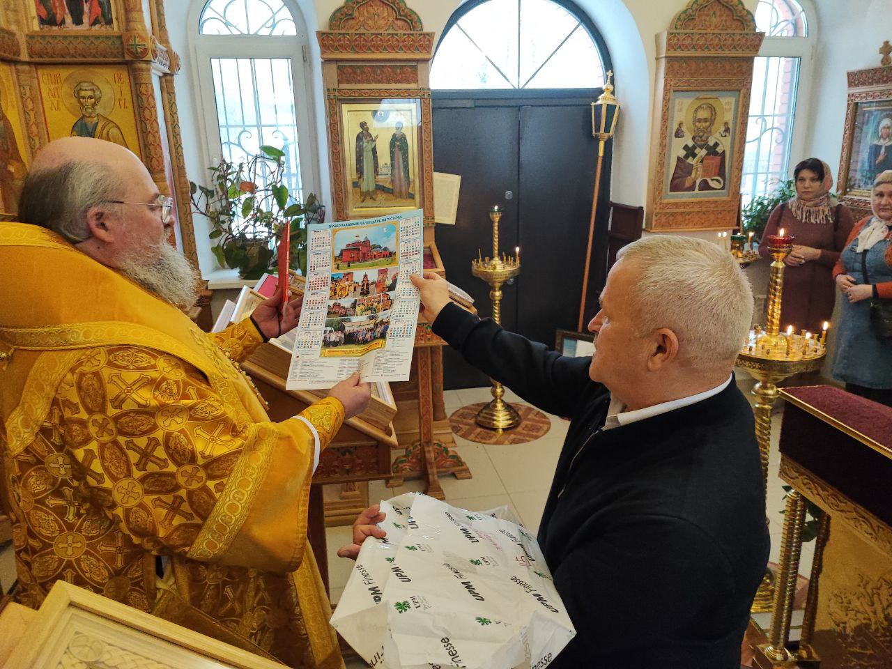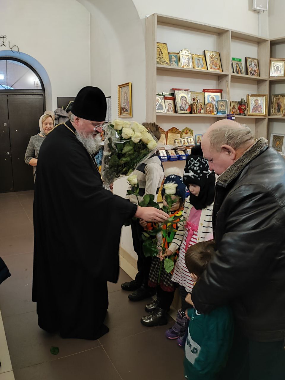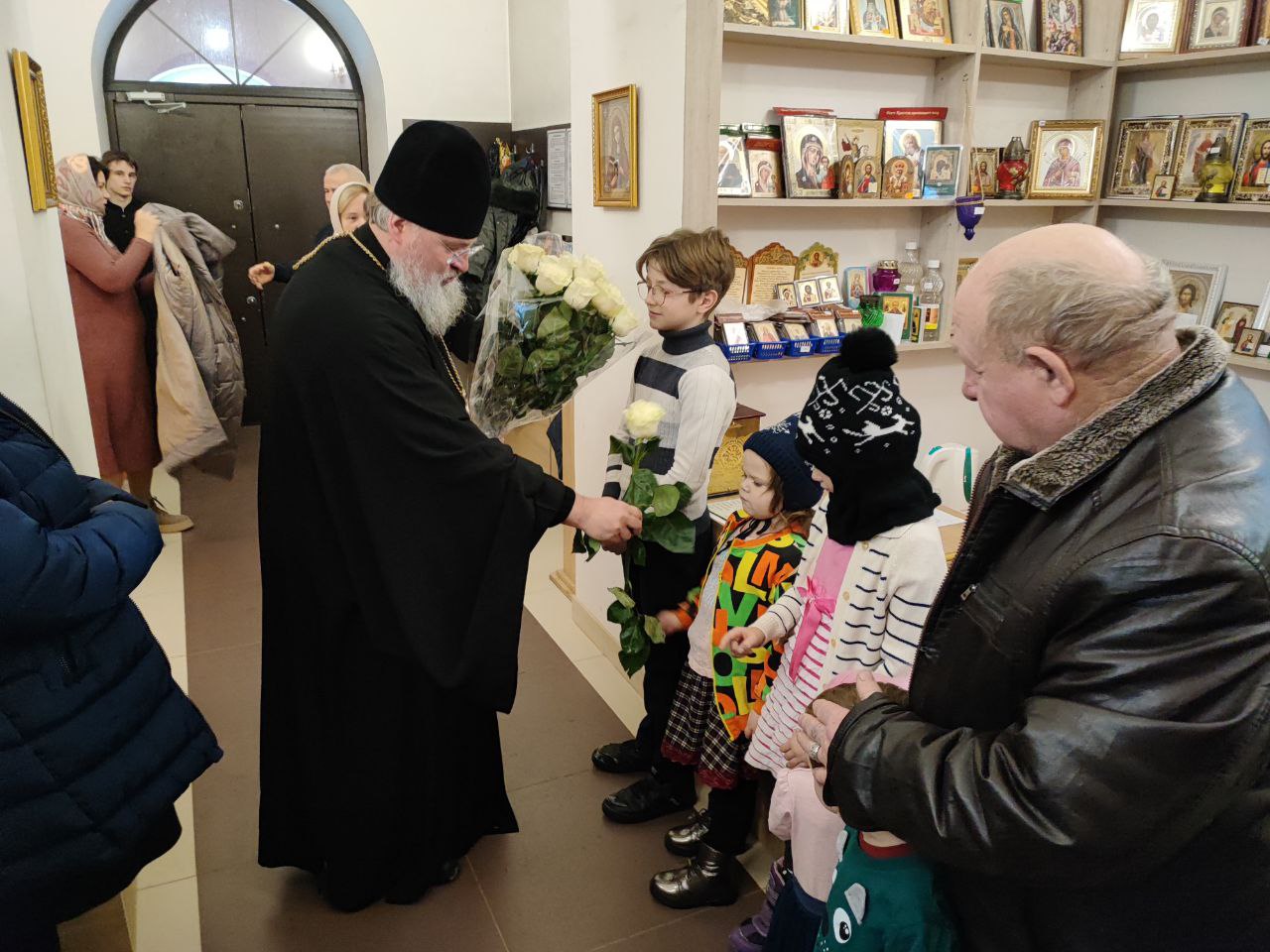 Архипастырь поздравил ктитора храма Николая Кленова с прошедшим днем рождения, который был накануне и с грядущим днем тезоименитства и преподнес ему святую просфору и памятный подарок. Всем прихожанам владыка вручил Святое Евангелие от Иоанна с толкованиями. Также все получили календари на грядущий год с видами храма, а маленькие богомольцы —  сладкие подарки.