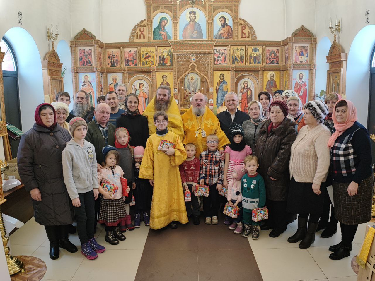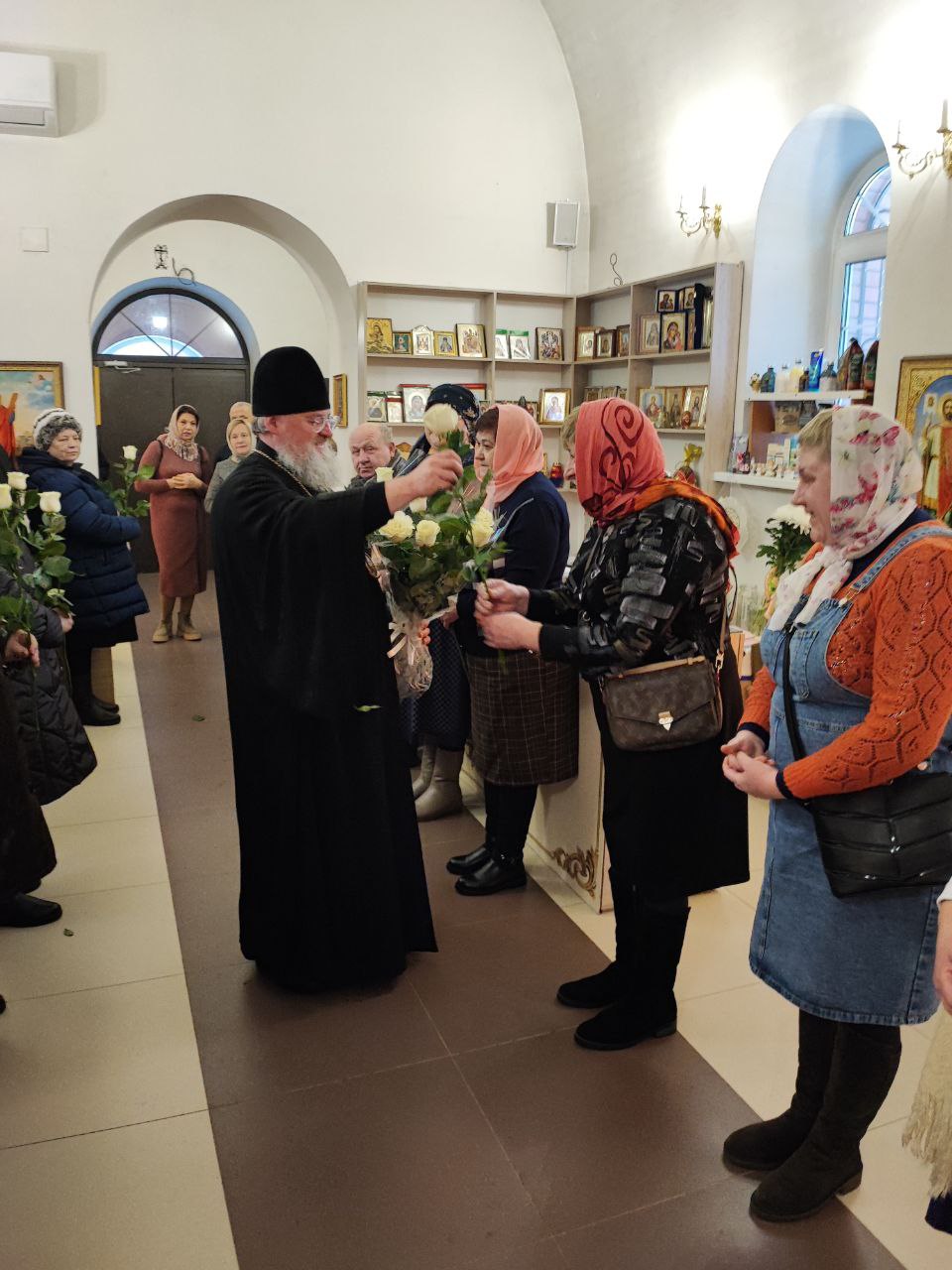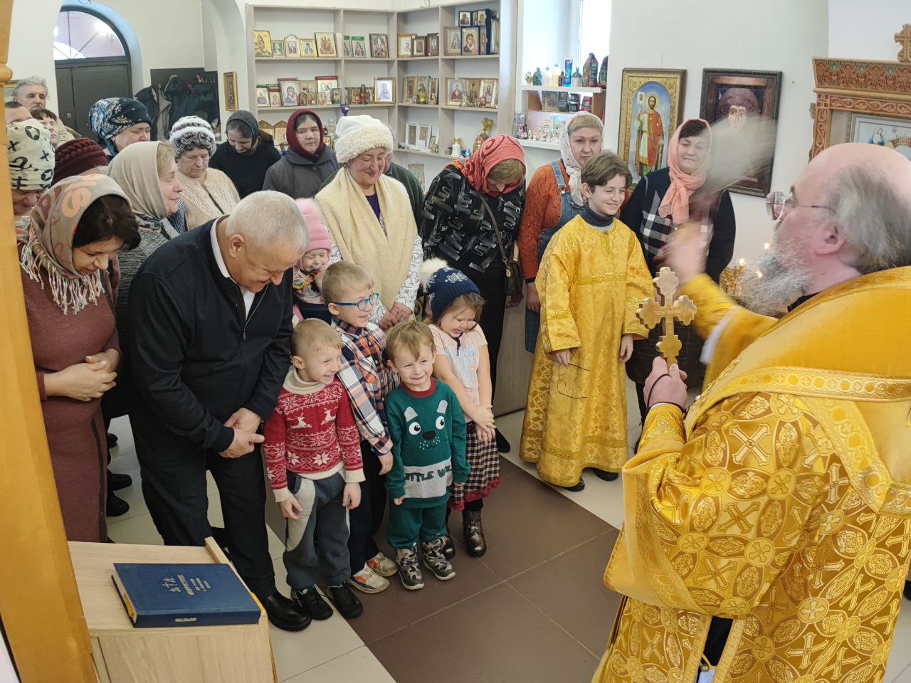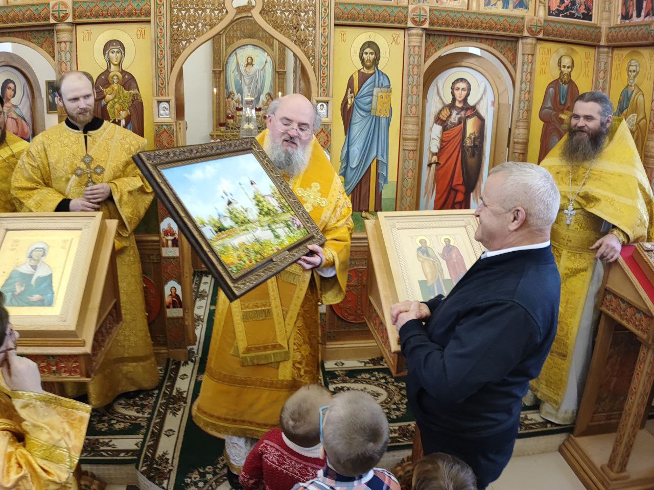 Архипастырь поздравил ктитора храма Николая Кленова с прошедшим днем рождения, который был накануне и с грядущим днем тезоименитства и преподнес ему святую просфору и памятный подарок. Всем прихожанам владыка вручил Святое Евангелие от Иоанна с толкованиями. Также все получили календари на грядущий год с видами храма, а маленькие богомольцы —  сладкие подарки.