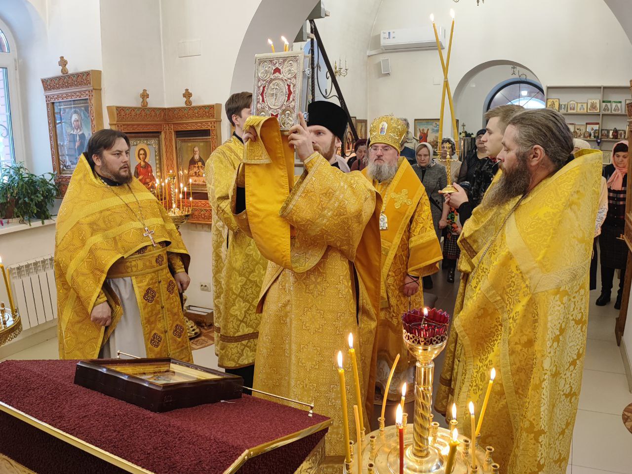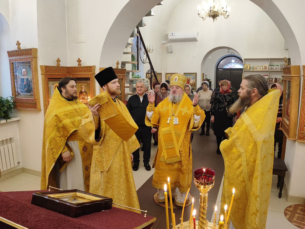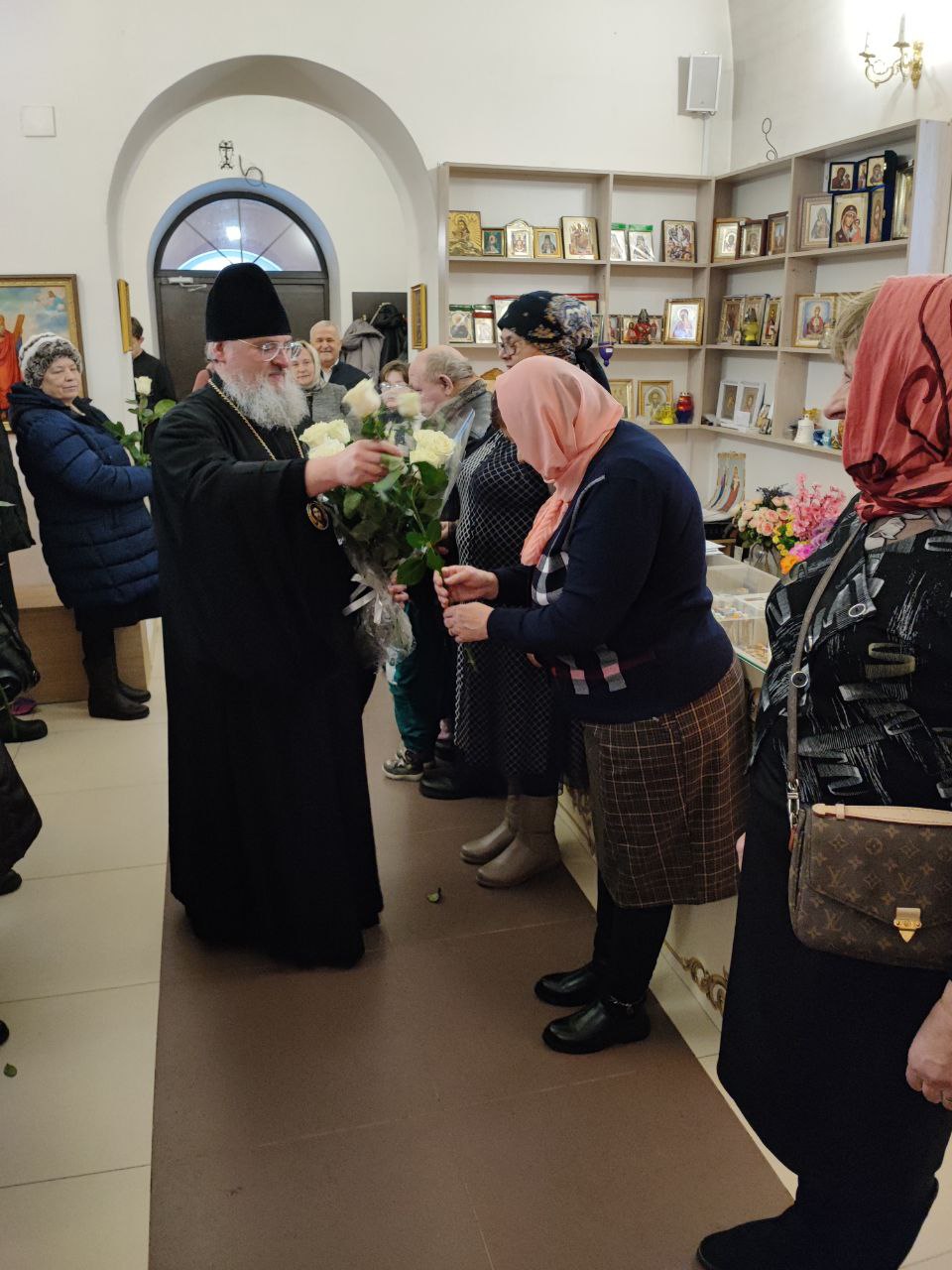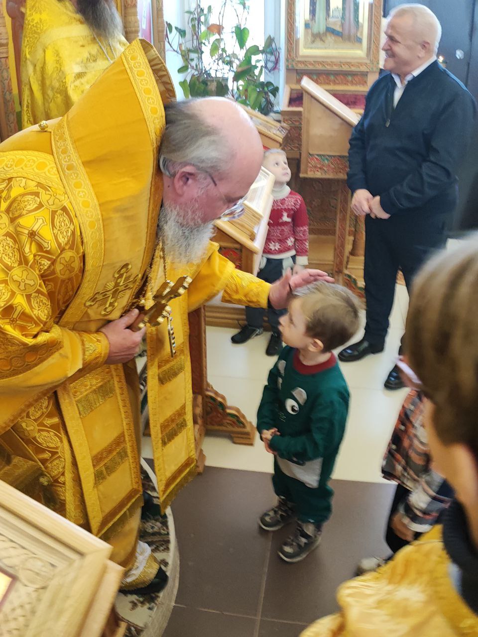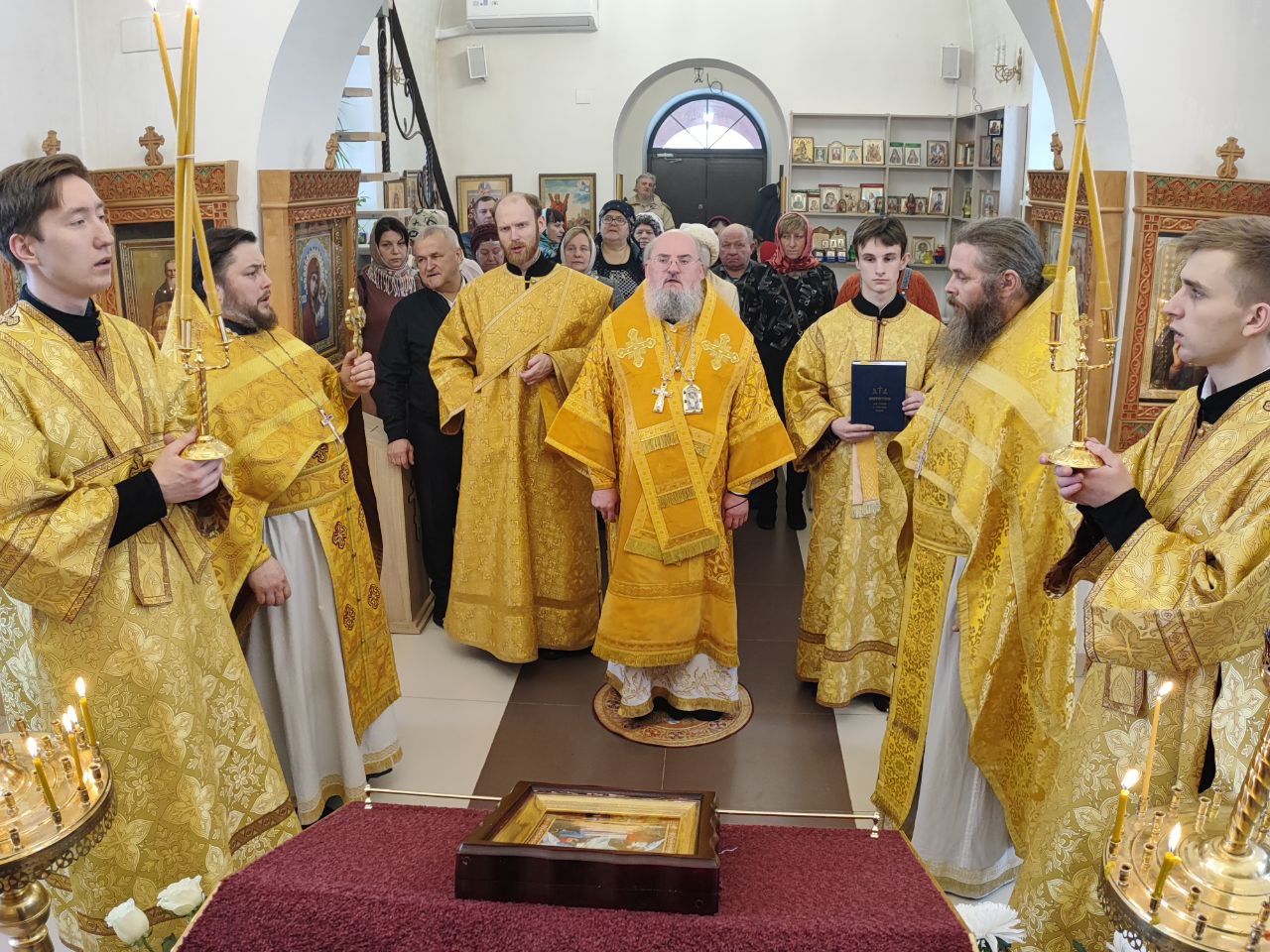 Архипастырь поздравил ктитора храма Николая Кленова с прошедшим днем рождения, который был накануне и с грядущим днем тезоименитства и преподнес ему святую просфору и памятный подарок. Всем прихожанам владыка вручил Святое Евангелие от Иоанна с толкованиями. Также все получили календари на грядущий год с видами храма, а маленькие богомольцы —  сладкие подарки.