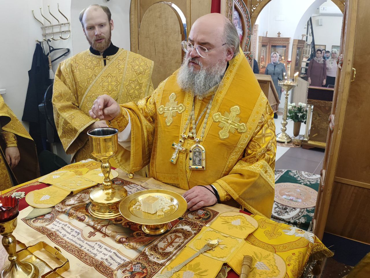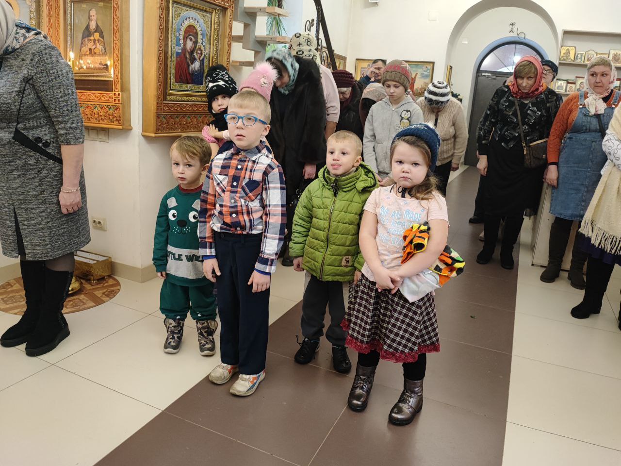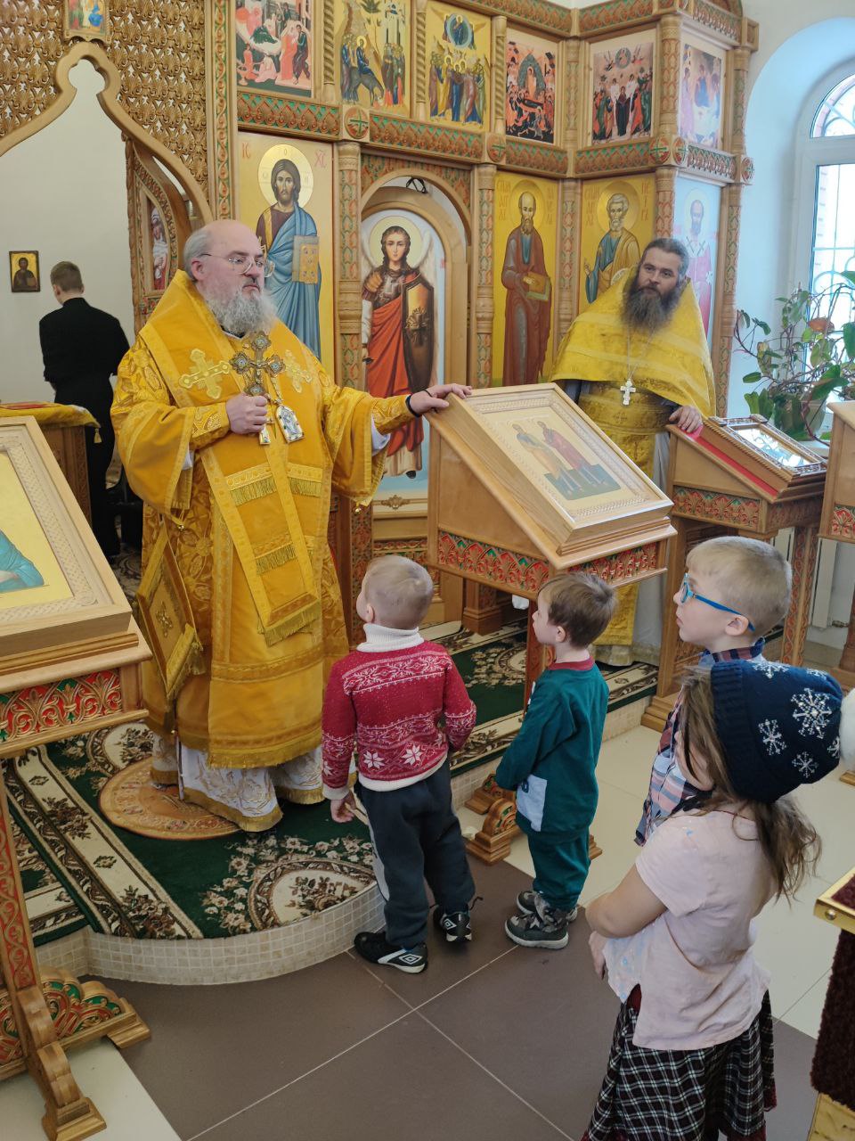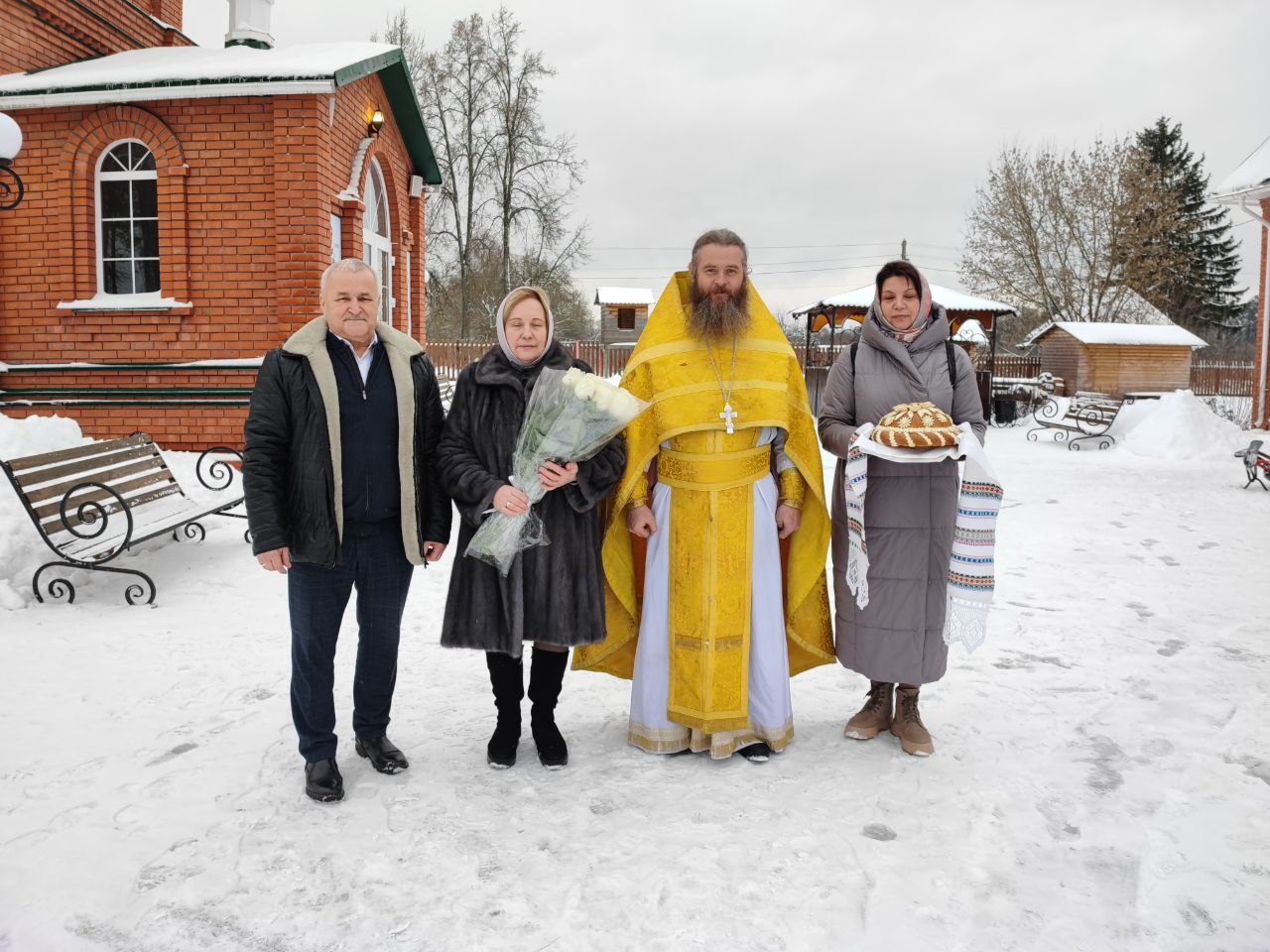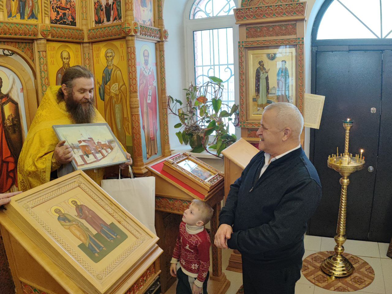 Архипастырь поздравил ктитора храма Николая Кленова с прошедшим днем рождения, который был накануне и с грядущим днем тезоименитства и преподнес ему святую просфору и памятный подарок. Всем прихожанам владыка вручил Святое Евангелие от Иоанна с толкованиями. Также все получили календари на грядущий год с видами храма, а маленькие богомольцы —  сладкие подарки.