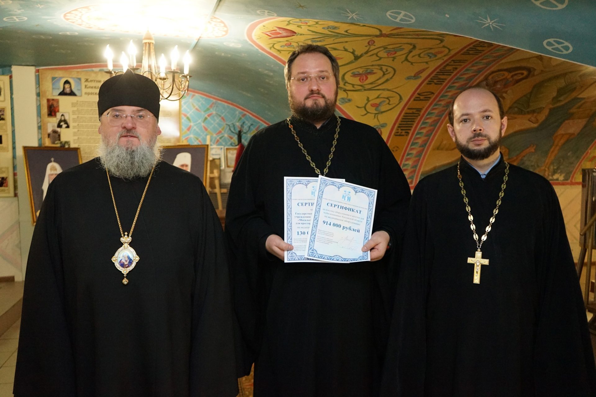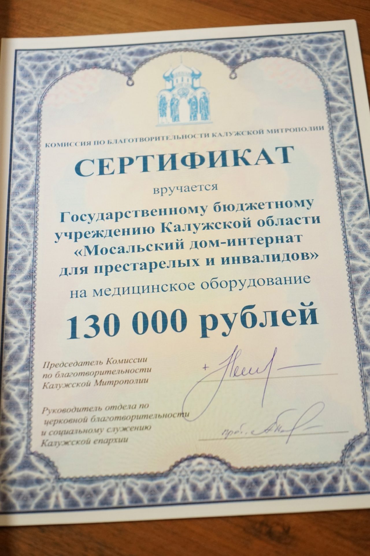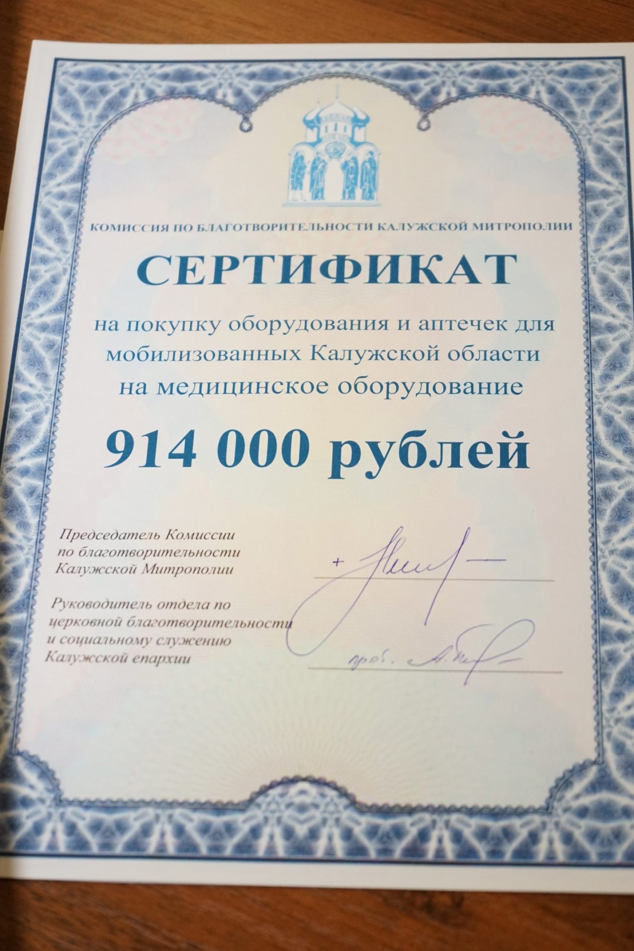 Далее просителям были вручены сертификаты на средства целевого сбора, на покупку медицинского оборудования Мосальскому дому-интернату для престарелых и инвалидов, а также на покупку оборудования и аптечек для мобилизованных Калужской области.