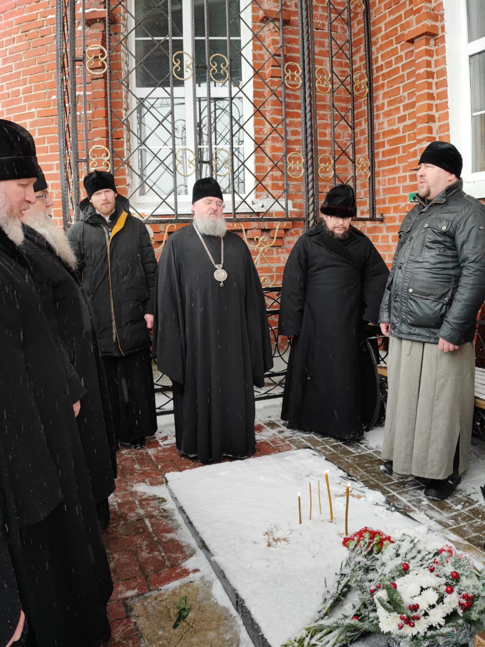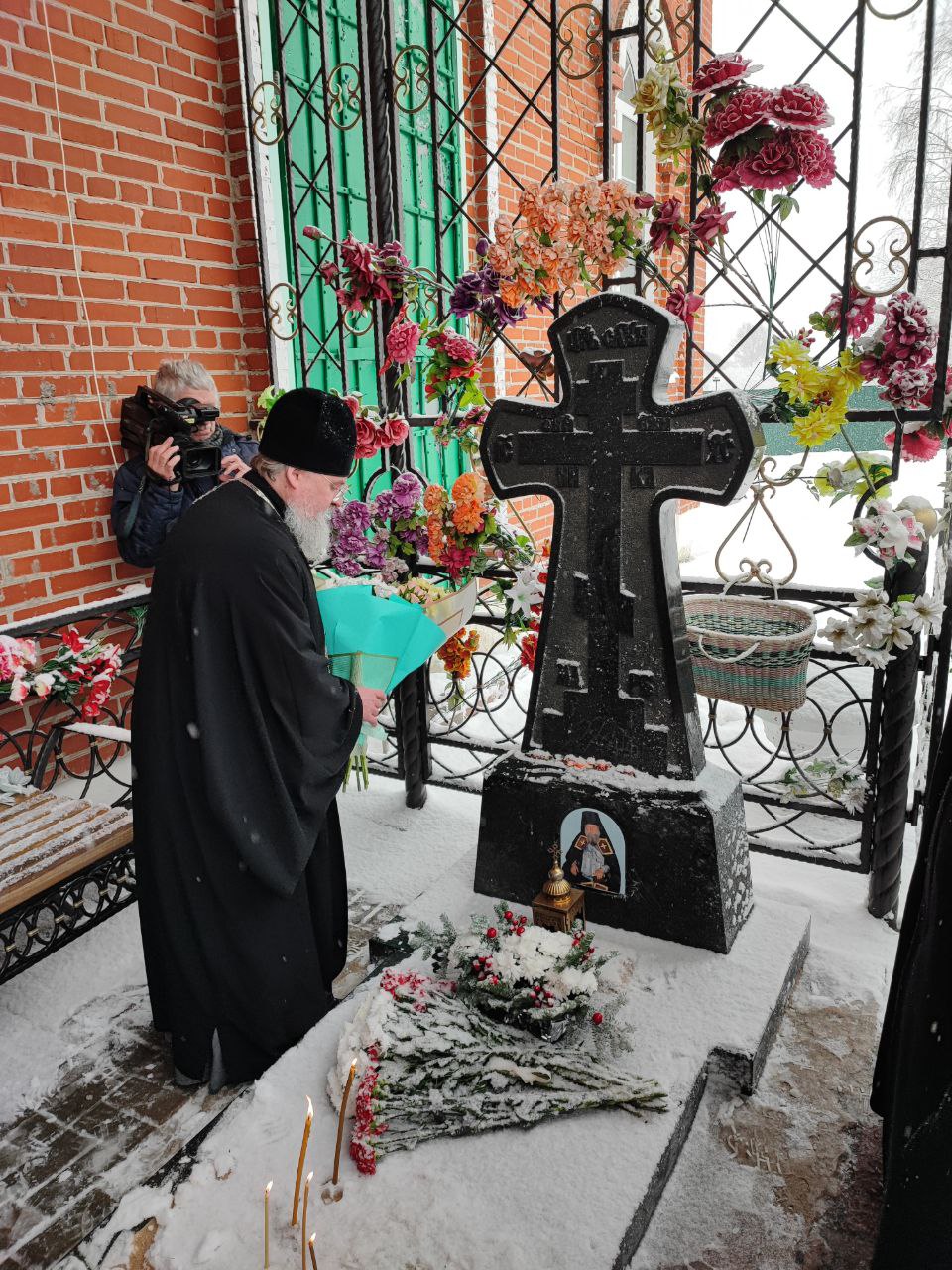 Завершая богослужения, владыка совершил  заупокойную литию на могиле отца архимандрита, погребенного у южной стороны храма, близ алтаря.