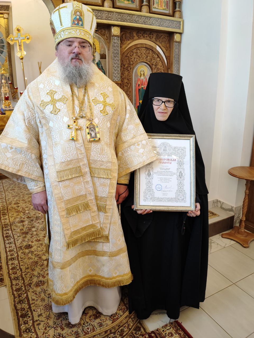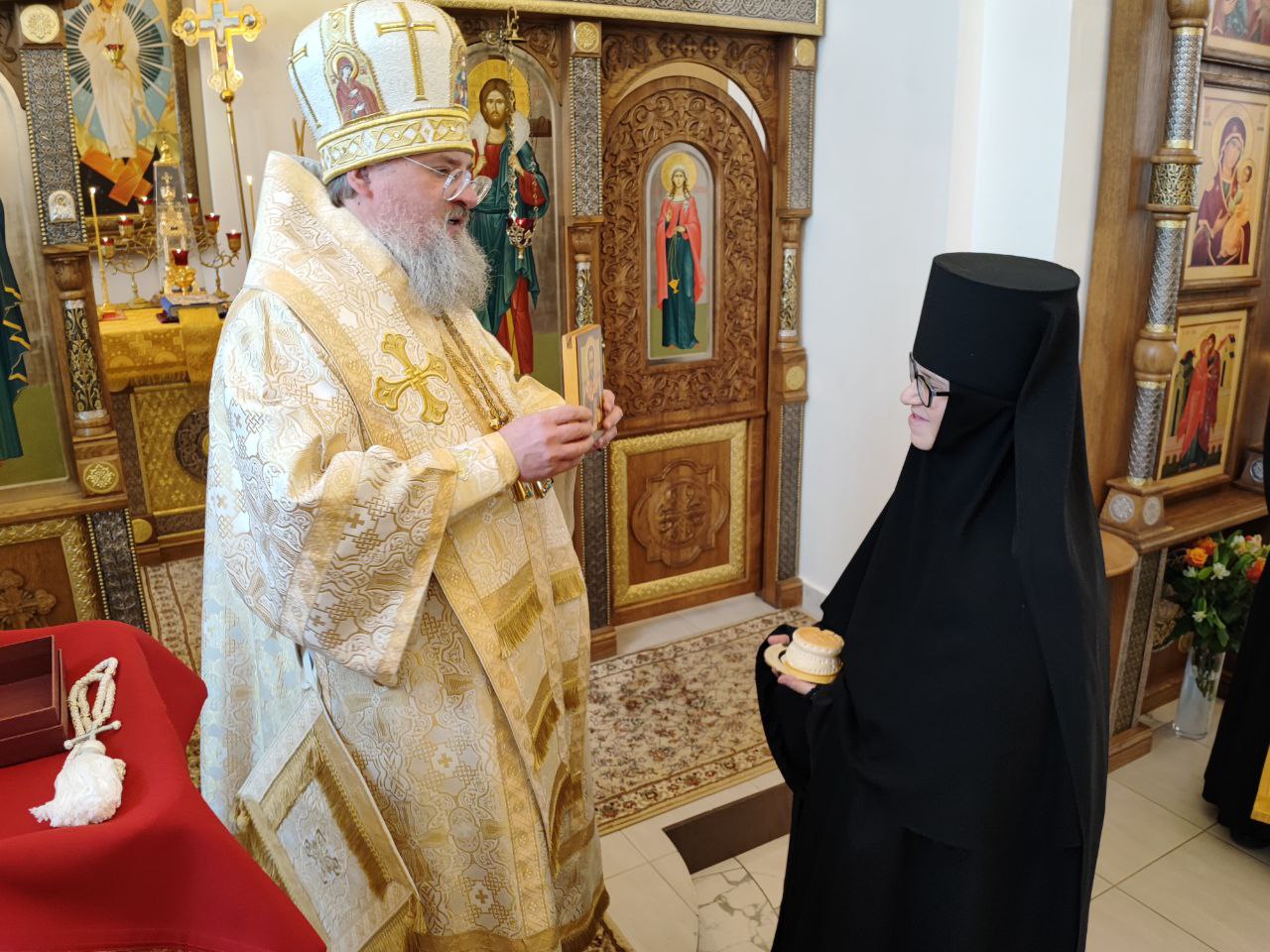 Архипастырь поздравил монахиню Николаю (Александрову) с шестидесятилетием со дня рождения, случившимся в этот день, и вручил ей Благодарственную Архиерейскую грамоту, а также преподнес святую просфору и икону святителя Николая архиепископа Мирликийского чудотворца.