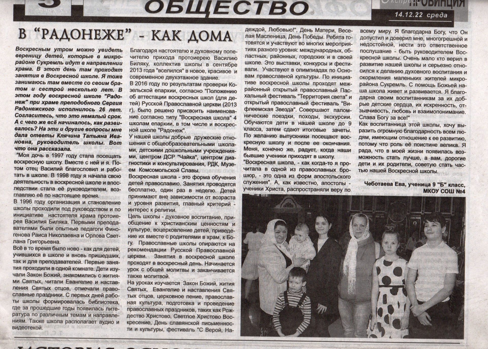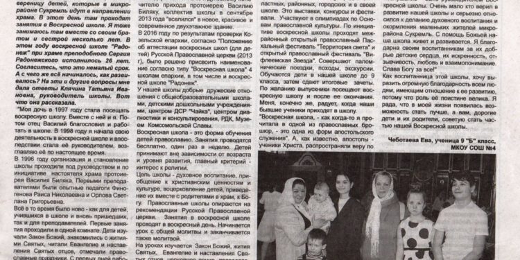 Воскресным утром можно увидеть вереницу детей, которые в микрорайоне Сукремль идут в направлении храма. В этот день там проходят занятия в Воскресной школе. я тоже занимаюсь там вместе со своим братом и сестрой несколько лет. В этом году воскресной школе «Радонеж» при храме преподобного Сергия Радонежского  исполнилось 26 лет. Согласитесь, что это немалый срок. А с чего же все начиналось, как развивалось? На эти и другие  вопросы мне дала ответы Клячина  Татьяна Ивановна, руководитель школы. Вот что она рассказала.