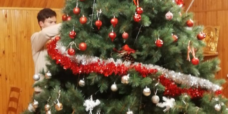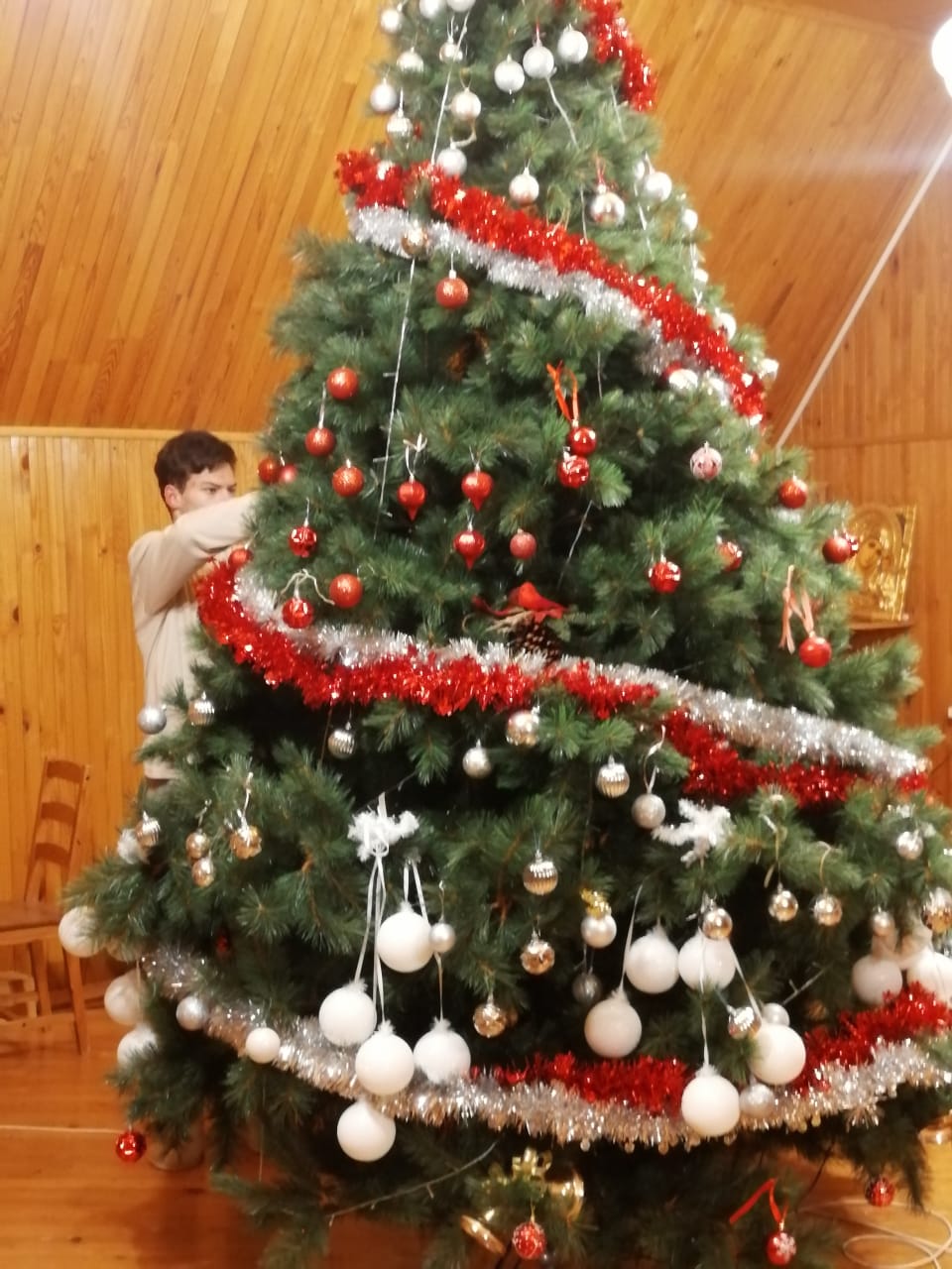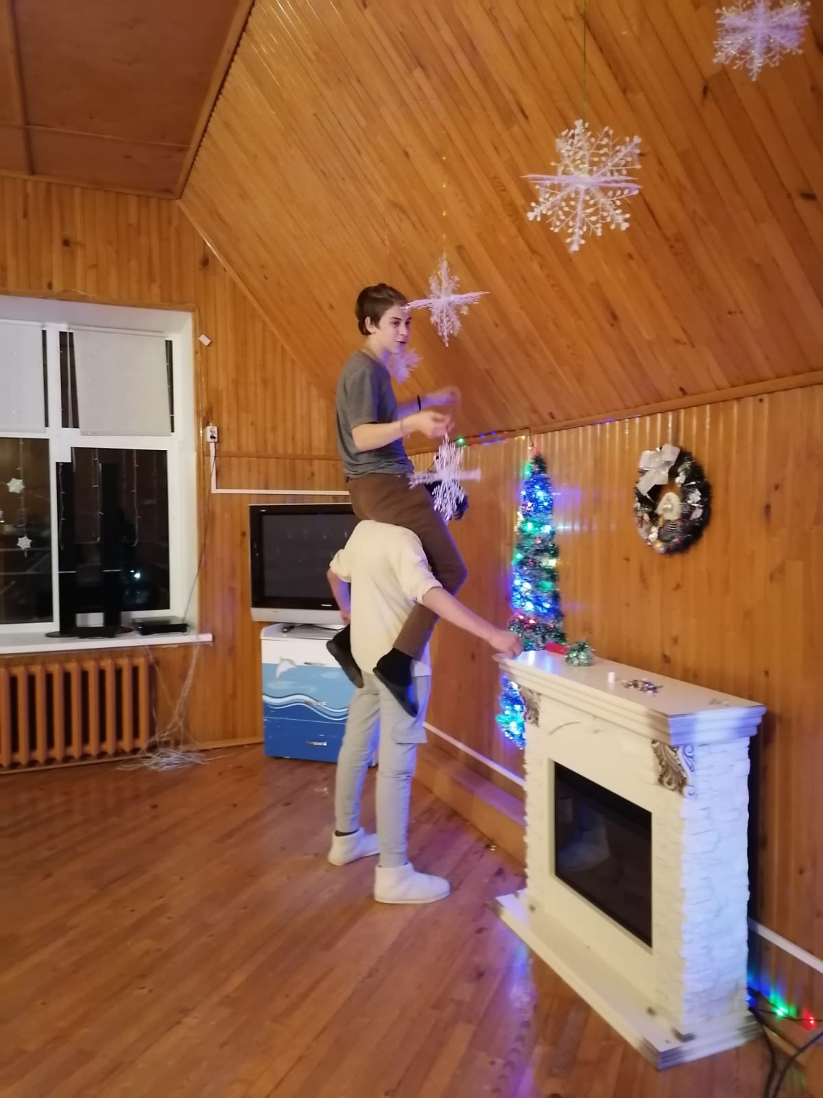 Зал к праздникам-забота старших детей. Подросли помощники нам на радость. Украсили елку и зал, игровые и коридоры. Сейчас в приюте отдыхают дети из многодетных семей. Воспитанники, кому было куда уйти-проведут каникулы с родными.