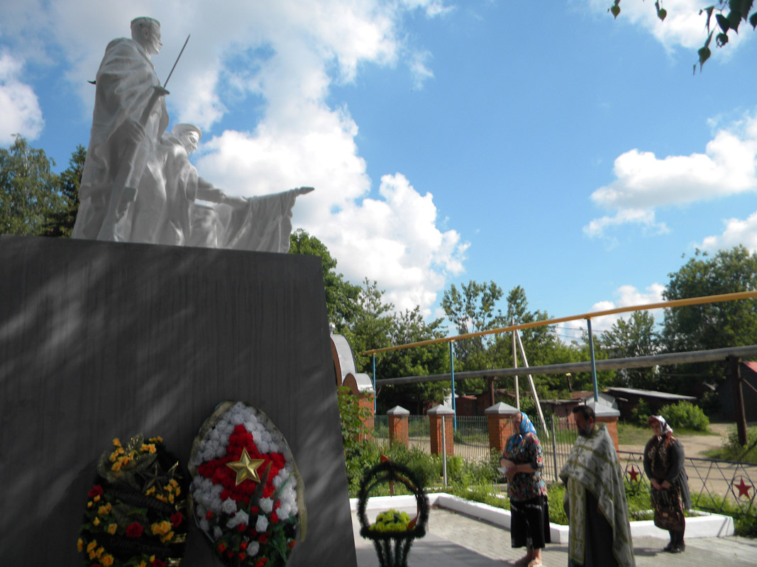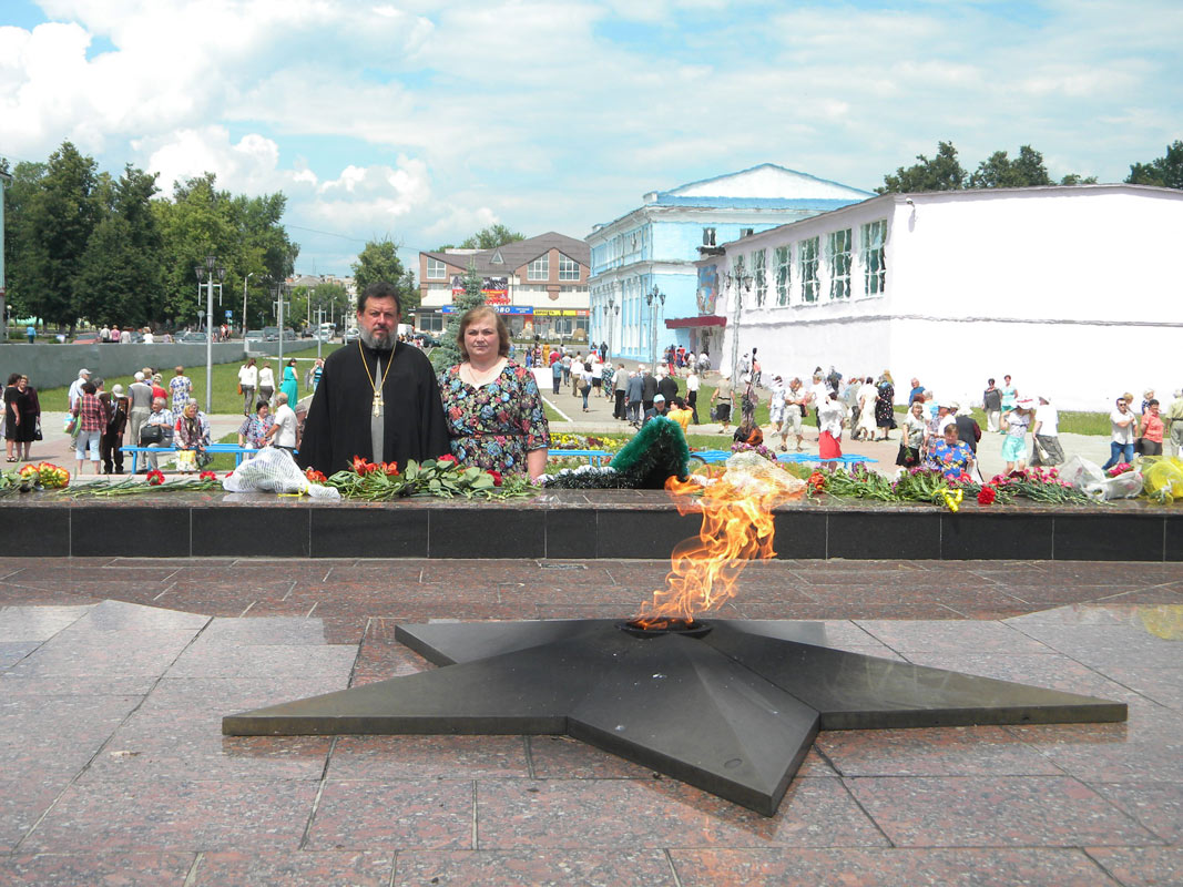 В конце митинга о.Василий возложил цветы к вечному огню. Затем батюшка отслужил панихиду по всем погибшим и пострадавшим в годы Великой Отечественной войны на братской могиле.