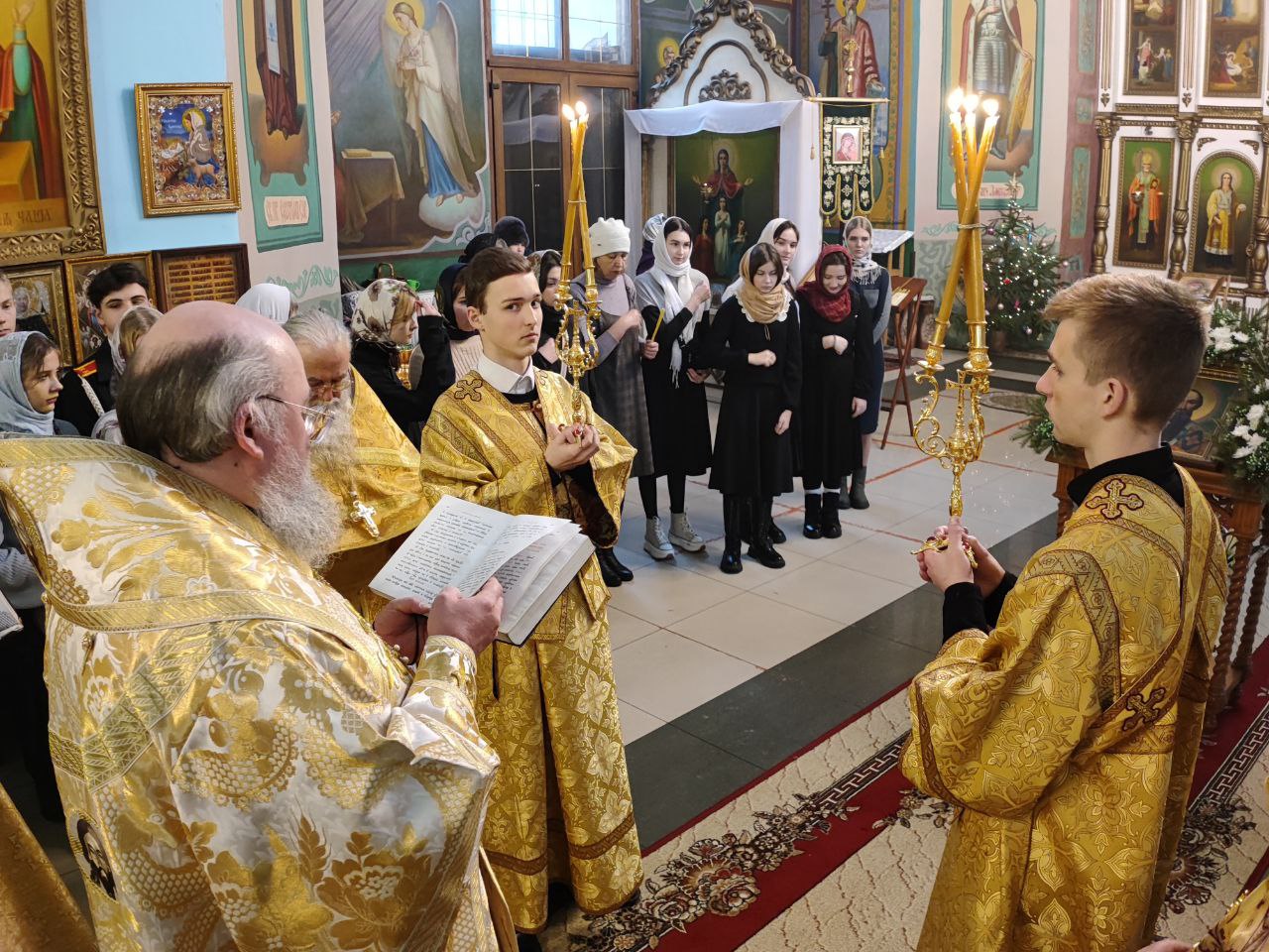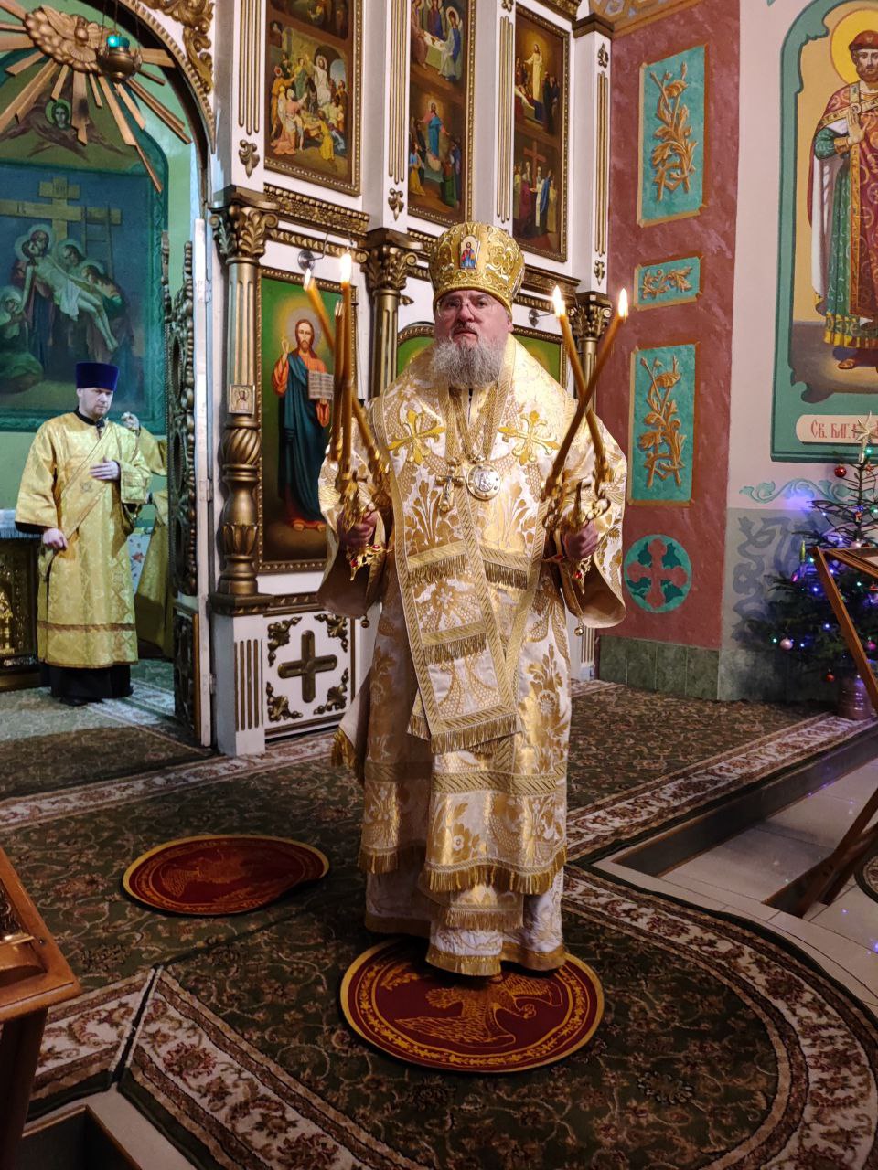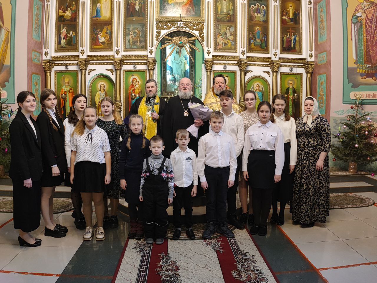 Перед началом богослужения со словам приветствия к архипастырю обратилась руководитель воскресной школы «Радонеж» Клячина Татьяна Ивановна, а затем ребята спели рождественские песнопения и колядки.