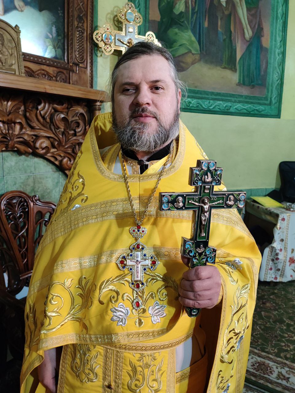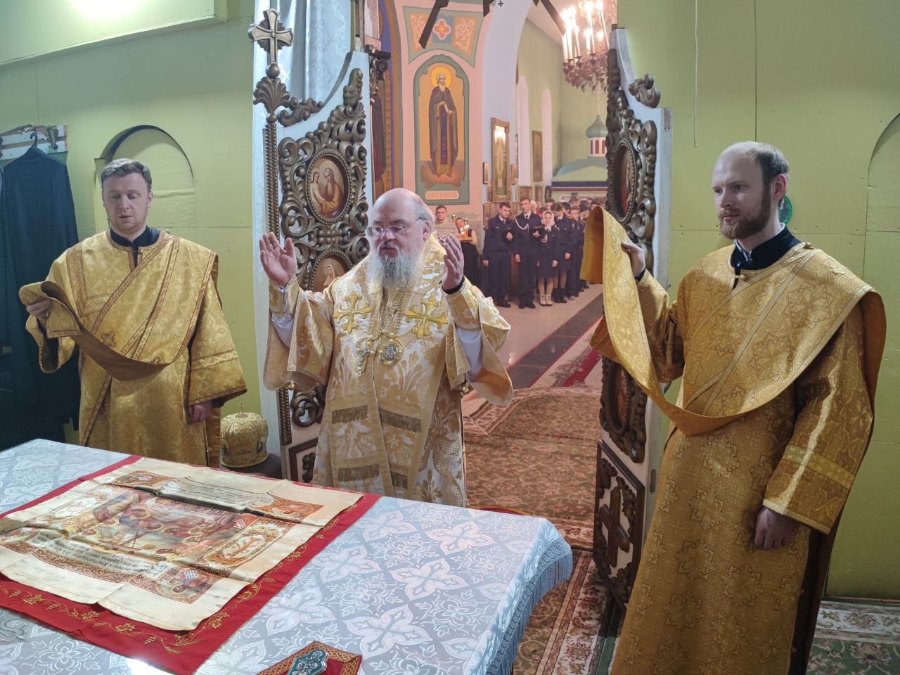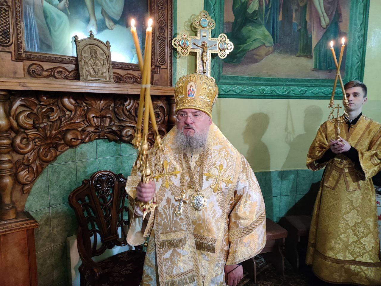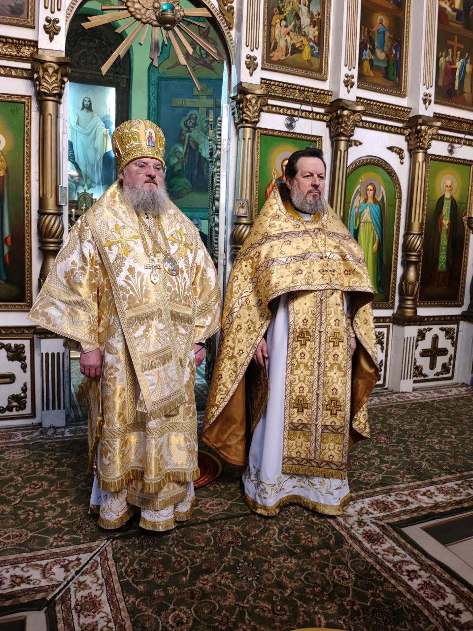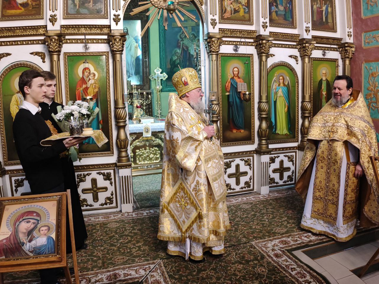 Затем епископ Никита поздравил настоятеля храма протоиерея Василия Биляка с днем тезоименитства и преподнес ему святую просфору и памятный подарок.